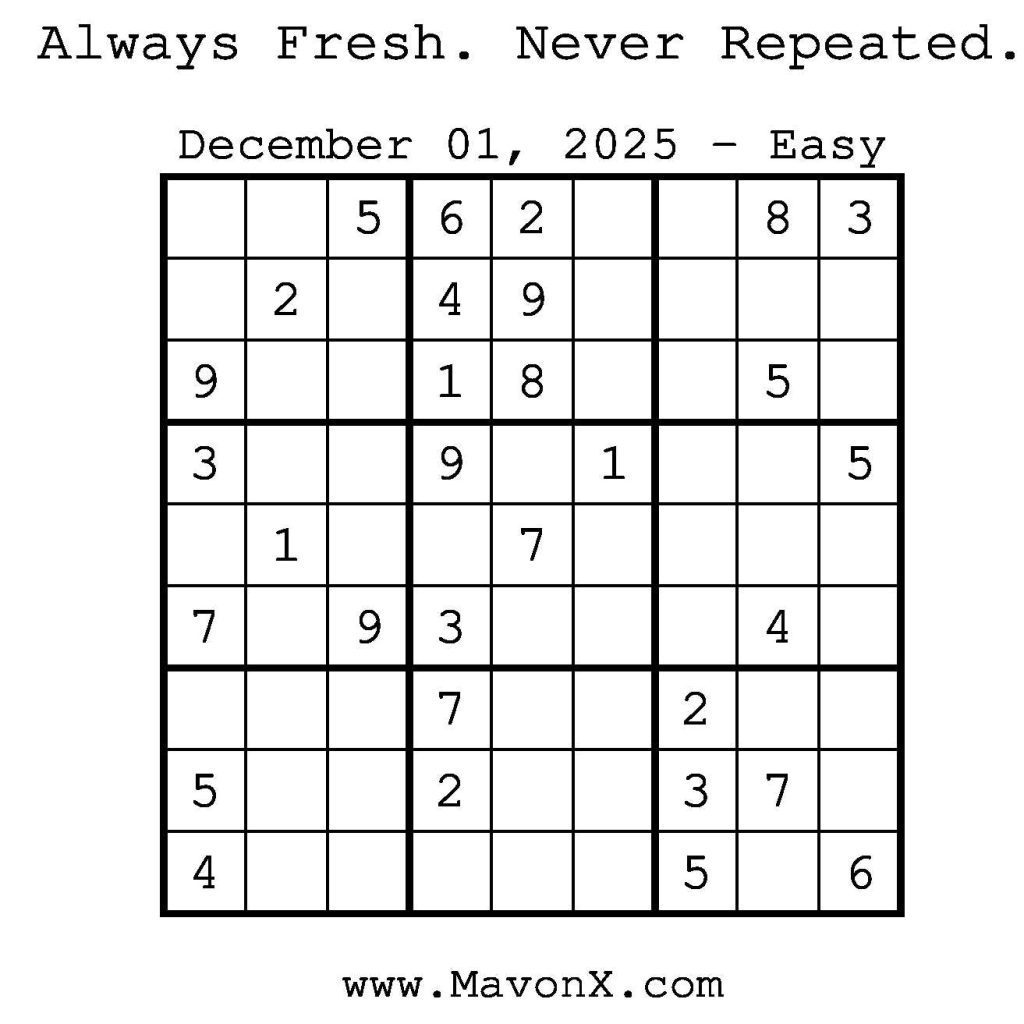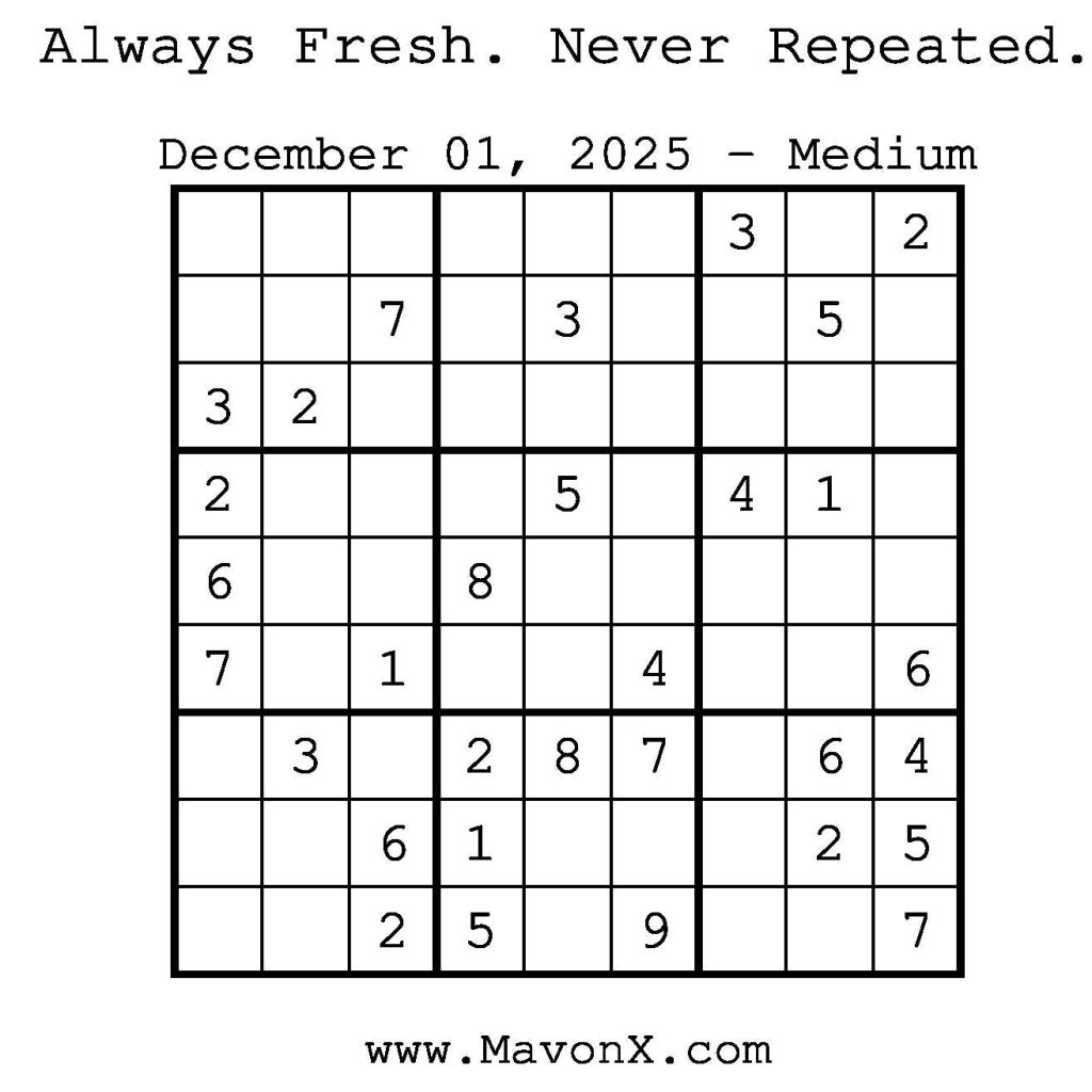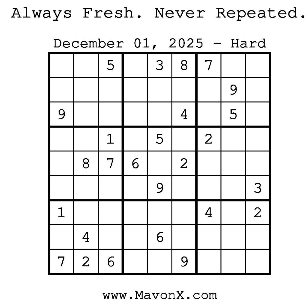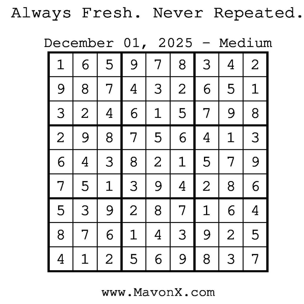 Puzzles of the Day – December 01, 2025 Post author:admin Post published:November 30, 2025 Post category:Free Stuff / Puzzle of the Day / Puzzle of the Day Solutions / Solutions Post comments:0 Comments Check out our books on Amazon! Check out our books on Barnes and Noble! Check out our books on Etsy! Easy Sudoku Coach Link Medium Sudoku Coach Link Hard Sudoku Coach Link Show Solution You Might Also Like Puzzles of the Day – March 11, 2026 March 11, 2026 Puzzles of the Day – February 24, 2026 February 23, 2026 Puzzles of the Day – June 29, 2025 July 1, 2025 Leave a Reply Cancel replyCommentEnter your name or username to comment Enter your email address to comment Enter your website URL (optional) Save my name, email, and website in this browser for the next time I comment.