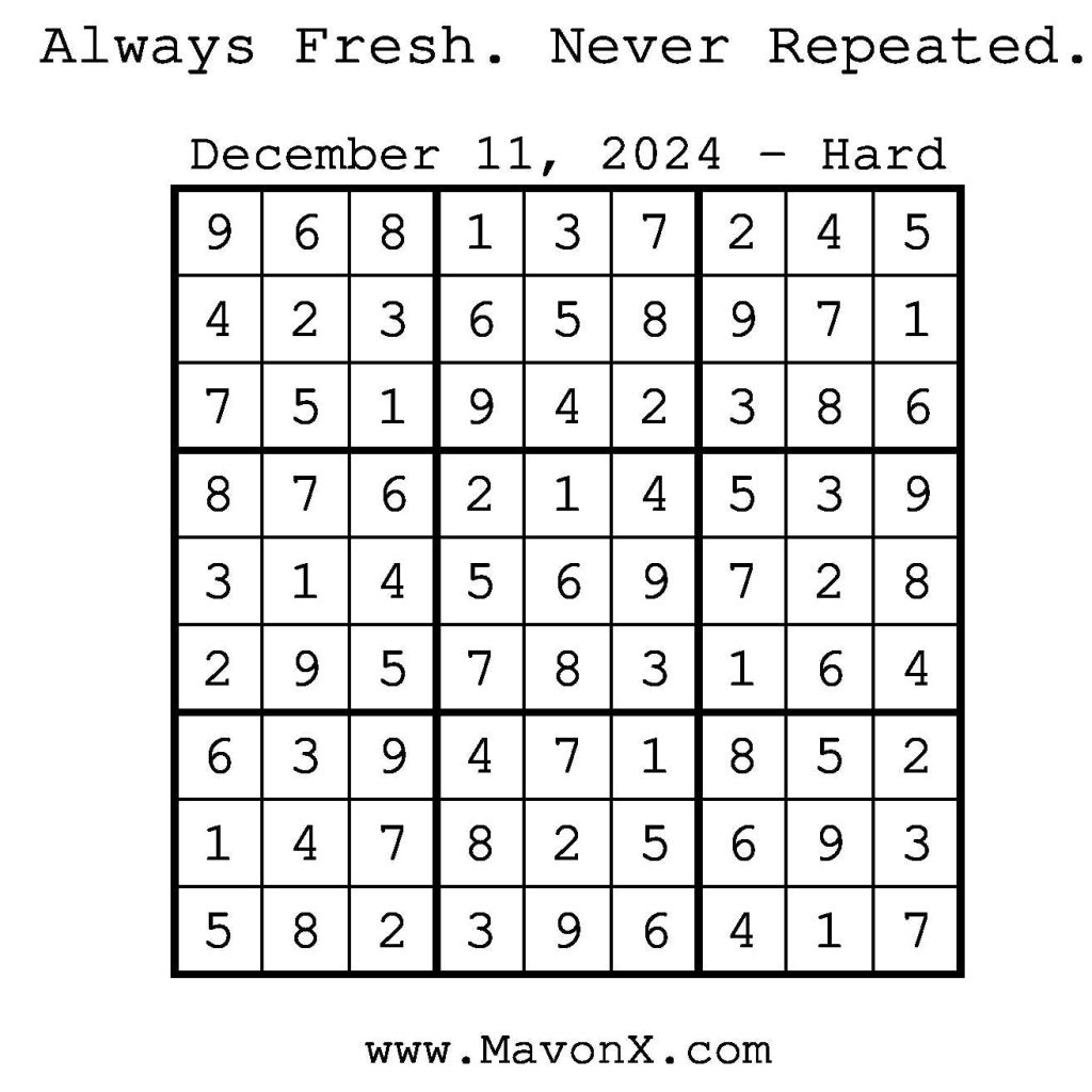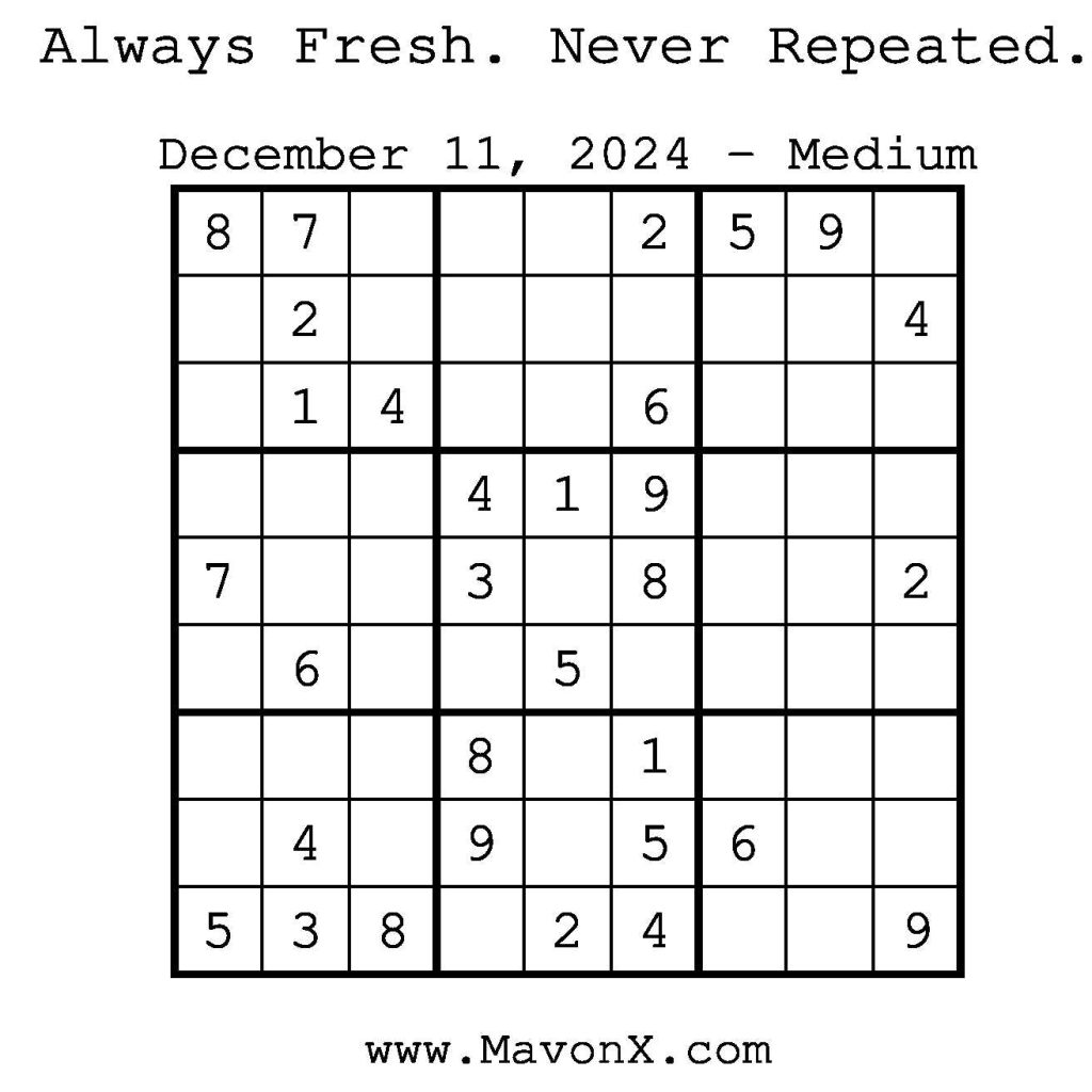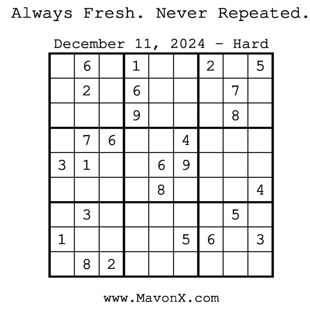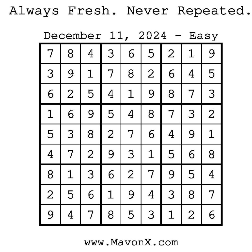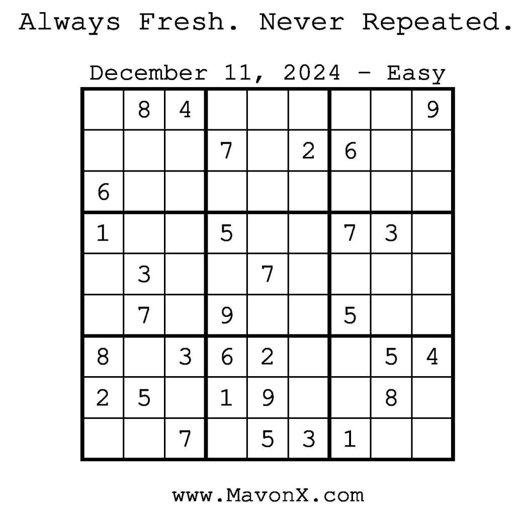 Puzzles of the Day – December 11, 2024 Post author:admin Post published:December 10, 2024 Post category:Free Stuff / Puzzle of the Day / Puzzle of the Day Solutions / Solutions Post comments:0 Comments Check out our books on Amazon! Check out our books on Barnes and Noble! Check out our books on Etsy! Easy Sudoku Coach Link Medium Sudoku Coach Link Hard Sudoku Coach Link Show Solution You Might Also Like Puzzles of the Day – December 1, 2024 December 1, 2024 Puzzles of the Day – November 9, 2025 November 8, 2025 Puzzles of the Day – January 24, 2025 January 24, 2025 Leave a Reply Cancel replyCommentEnter your name or username to comment Enter your email address to comment Enter your website URL (optional) Save my name, email, and website in this browser for the next time I comment.