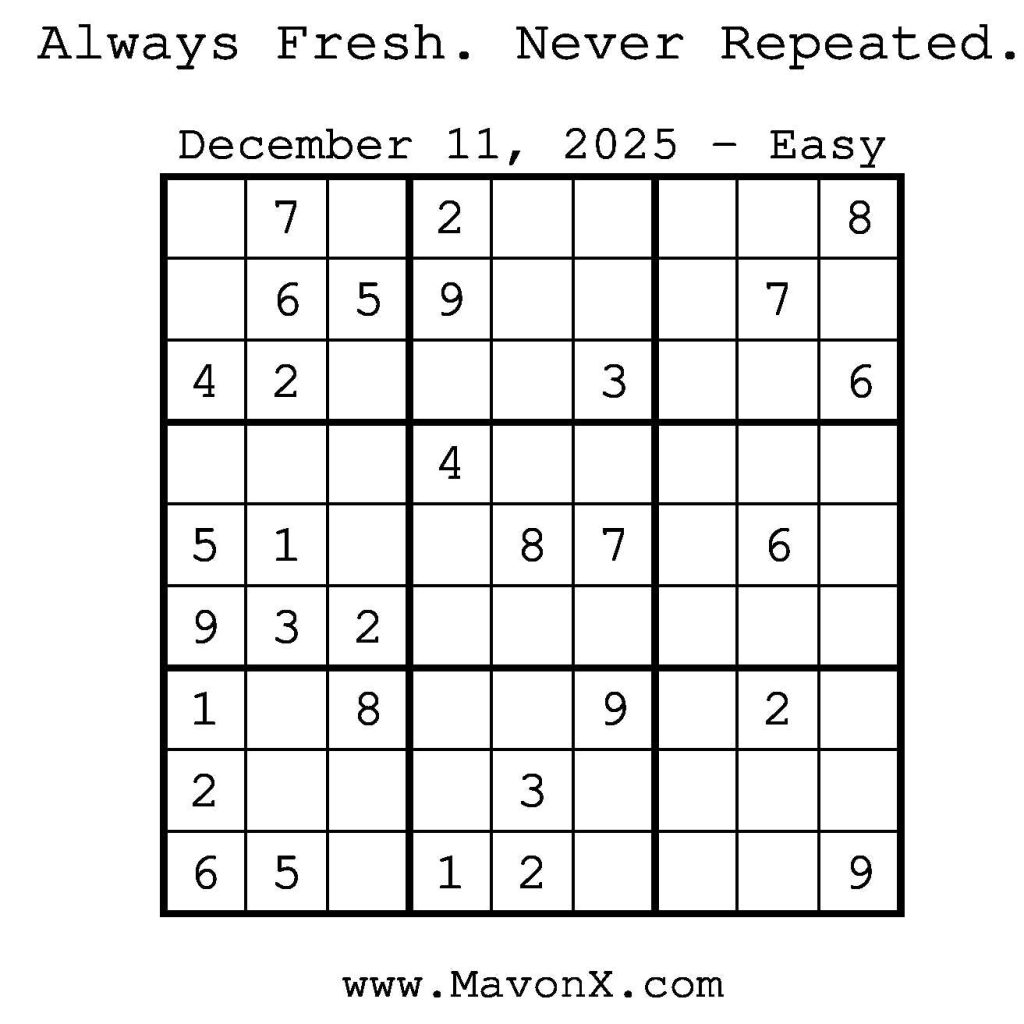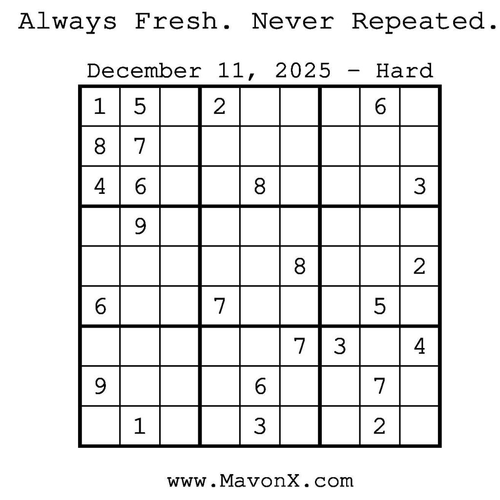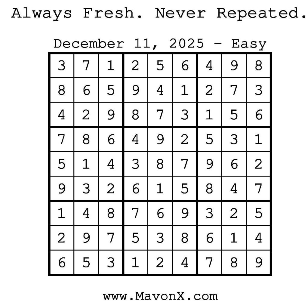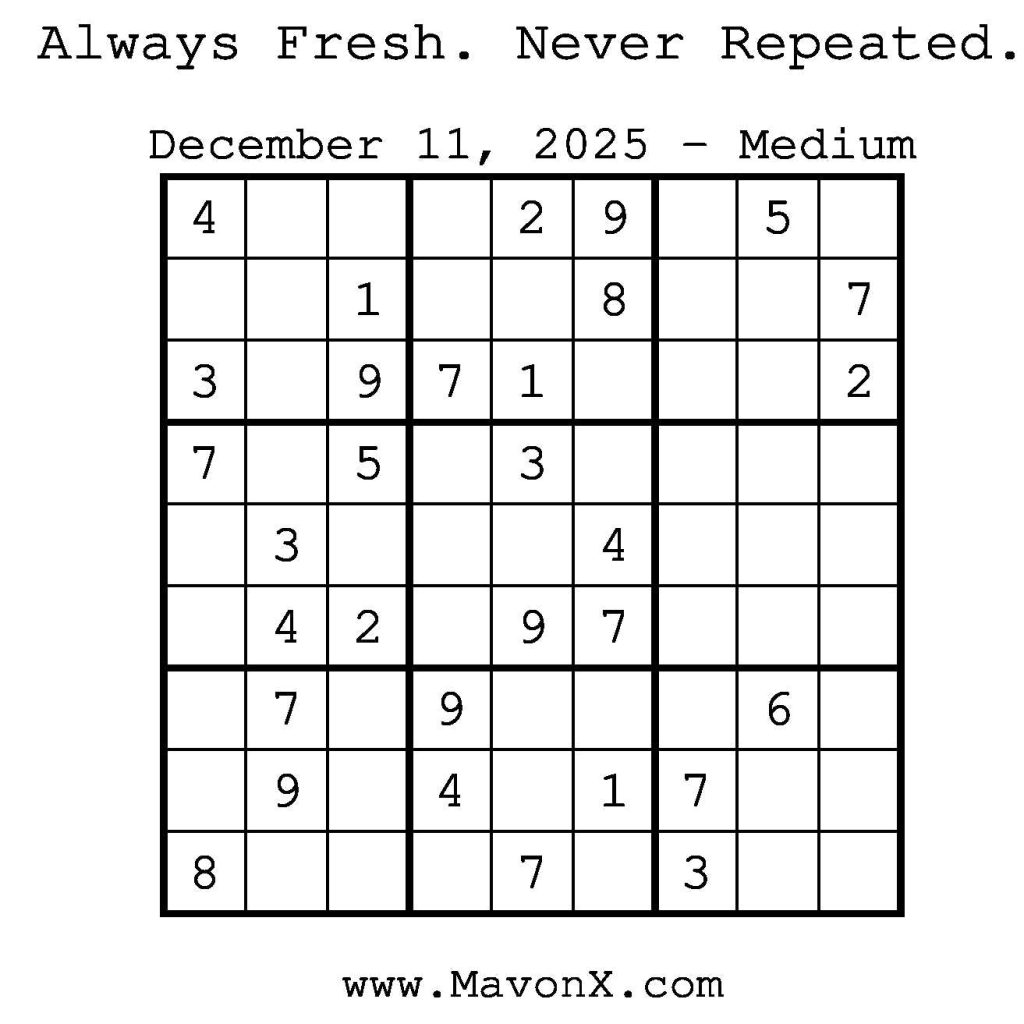 Puzzles of the Day – December 11, 2025 Post author:admin Post published:December 10, 2025 Post category:Free Stuff / Puzzle of the Day / Puzzle of the Day Solutions / Solutions Post comments:0 Comments Check out our books on Amazon! Check out our books on Barnes and Noble! Check out our books on Etsy! Easy Sudoku Coach Link Medium Sudoku Coach Link Hard Sudoku Coach Link Show Solution You Might Also Like Puzzles of the Day – June 30, 2025 July 1, 2025 Puzzles of the Day – December 22, 2025 December 21, 2025 Puzzles of the Day – August 12, 2025 August 12, 2025 Leave a Reply Cancel replyCommentEnter your name or username to comment Enter your email address to comment Enter your website URL (optional) Save my name, email, and website in this browser for the next time I comment.