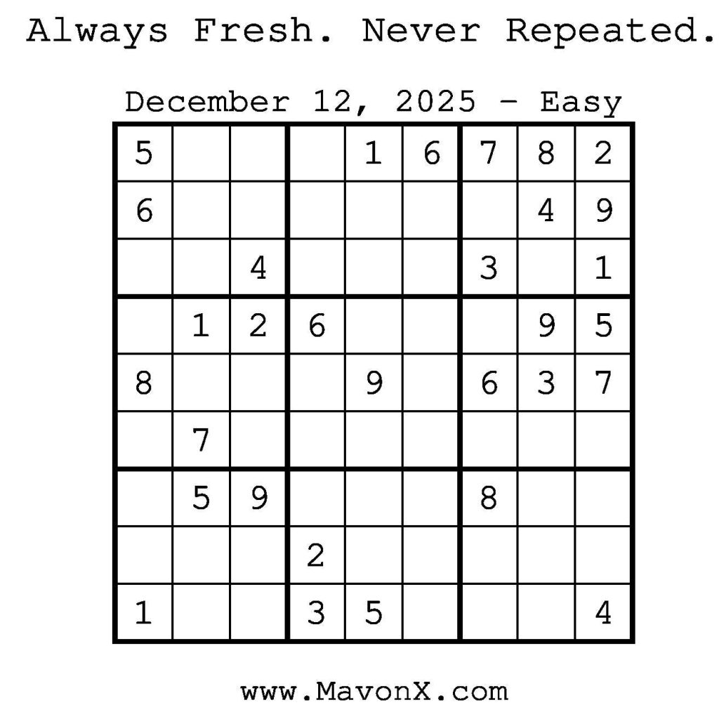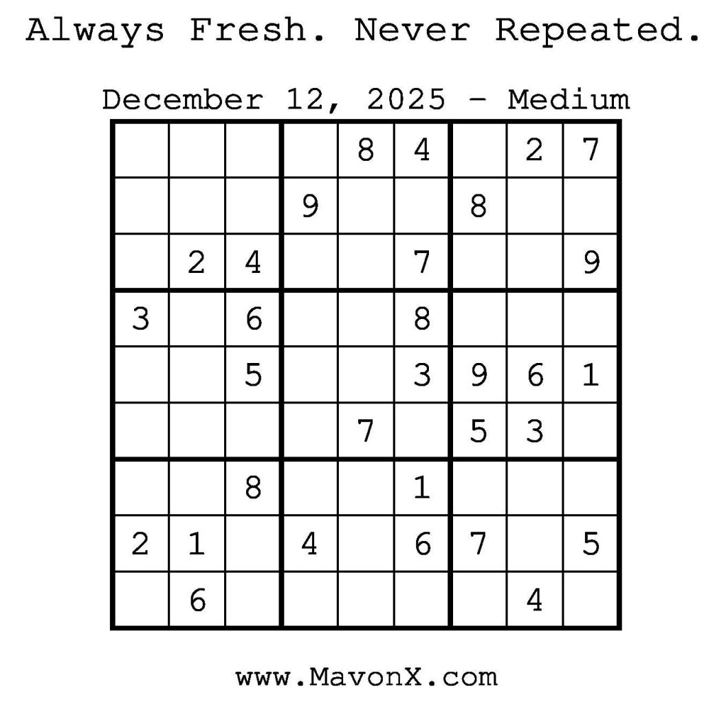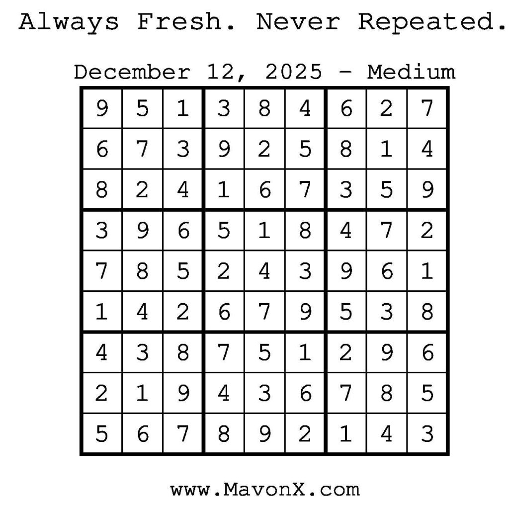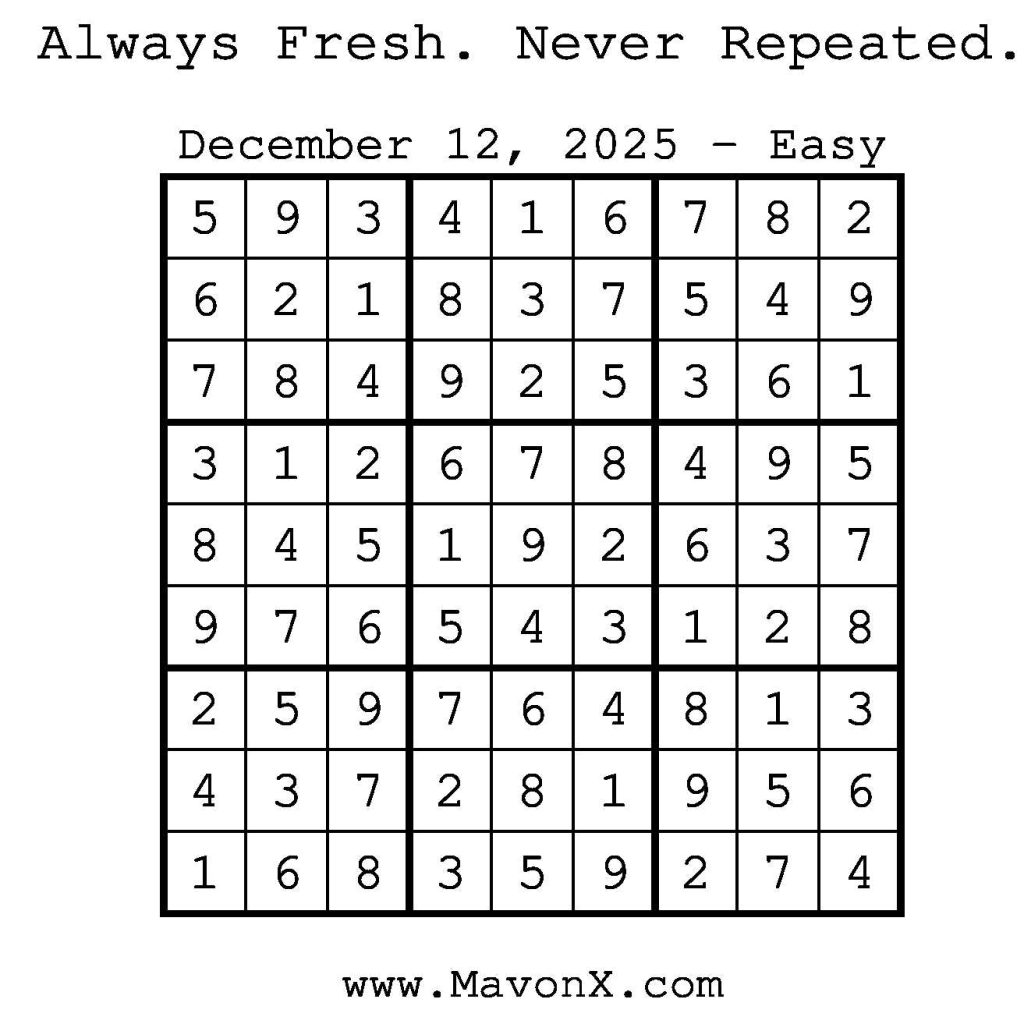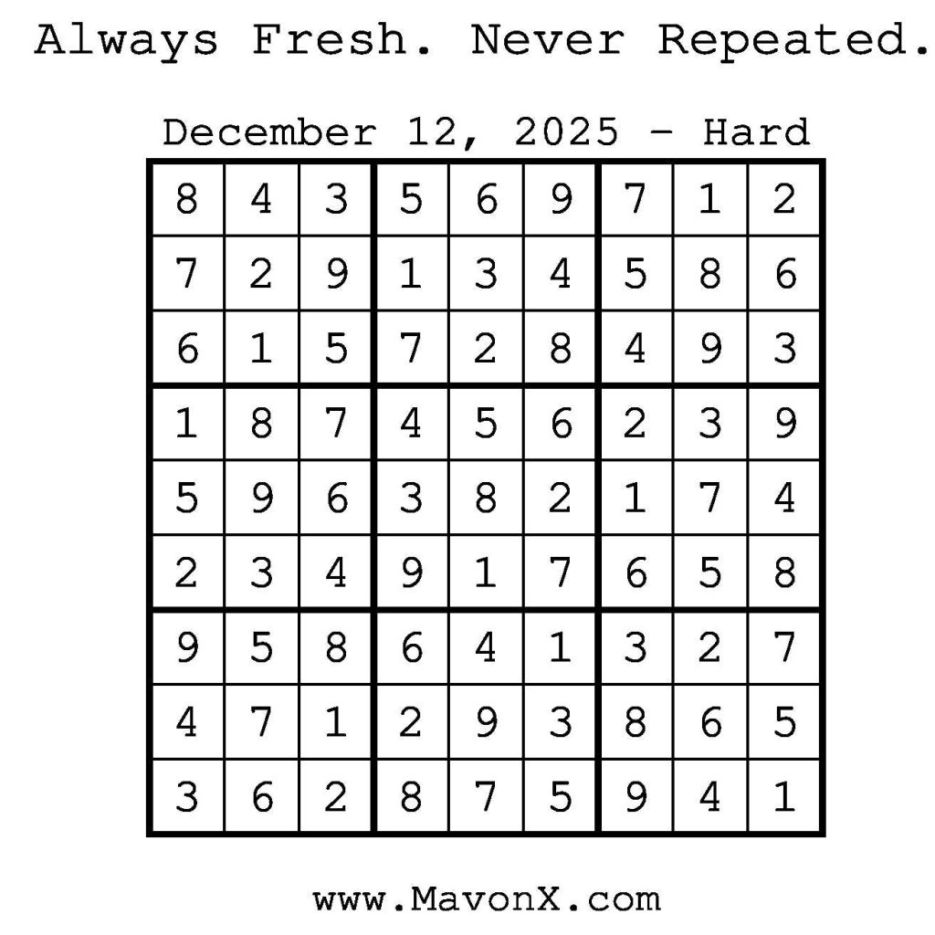 Puzzles of the Day – December 12, 2025 Post author:admin Post published:December 12, 2025 Post category:Free Stuff / Puzzle of the Day / Puzzle of the Day Solutions / Solutions Post comments:0 Comments Check out our books on Amazon! Check out our books on Barnes and Noble! Check out our books on Etsy! Easy Sudoku Coach Link Medium Sudoku Coach Link Hard Sudoku Coach Link Show Solution You Might Also Like Puzzles of the Day – March 6, 2025 March 6, 2025 Puzzles of the Day – August 4, 2025 August 3, 2025 Puzzles of the Day – September 10, 2024 September 10, 2024 Leave a Reply Cancel replyCommentEnter your name or username to comment Enter your email address to comment Enter your website URL (optional) Save my name, email, and website in this browser for the next time I comment.