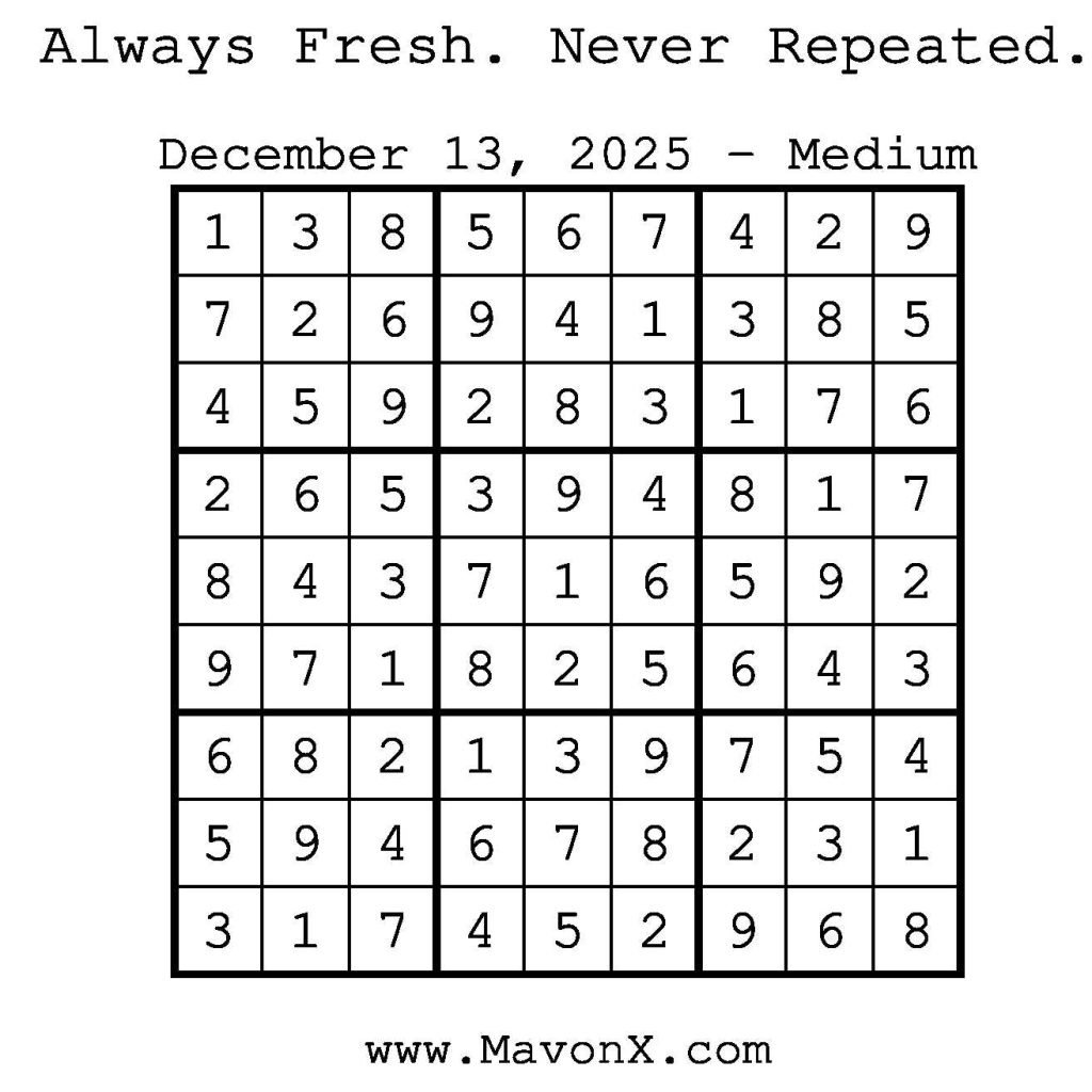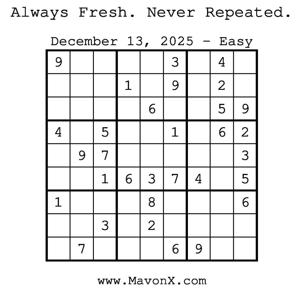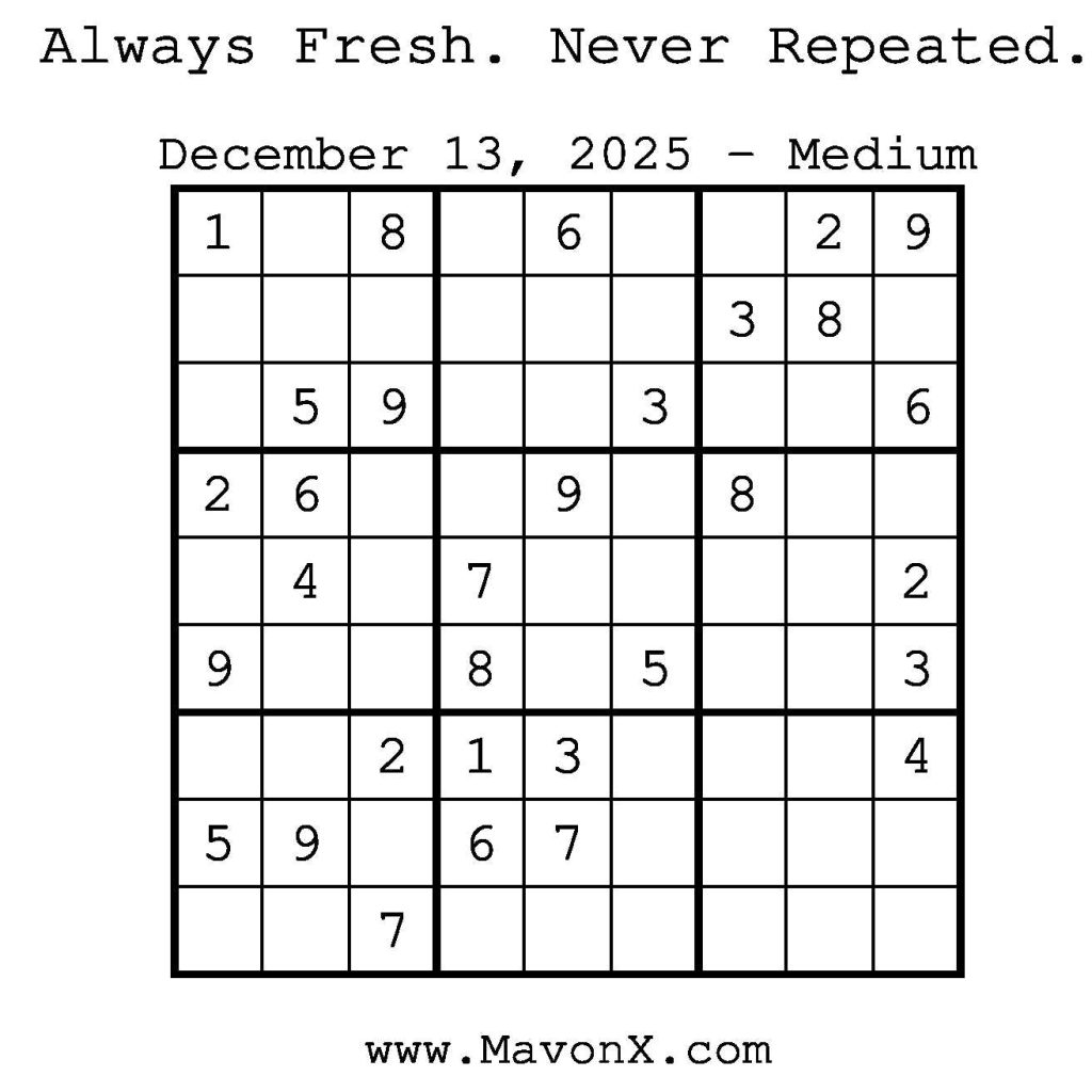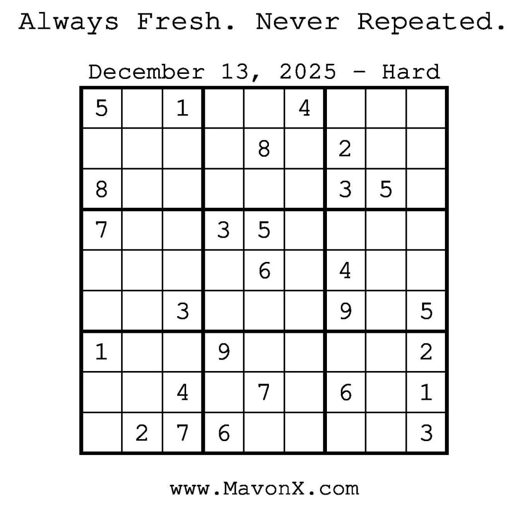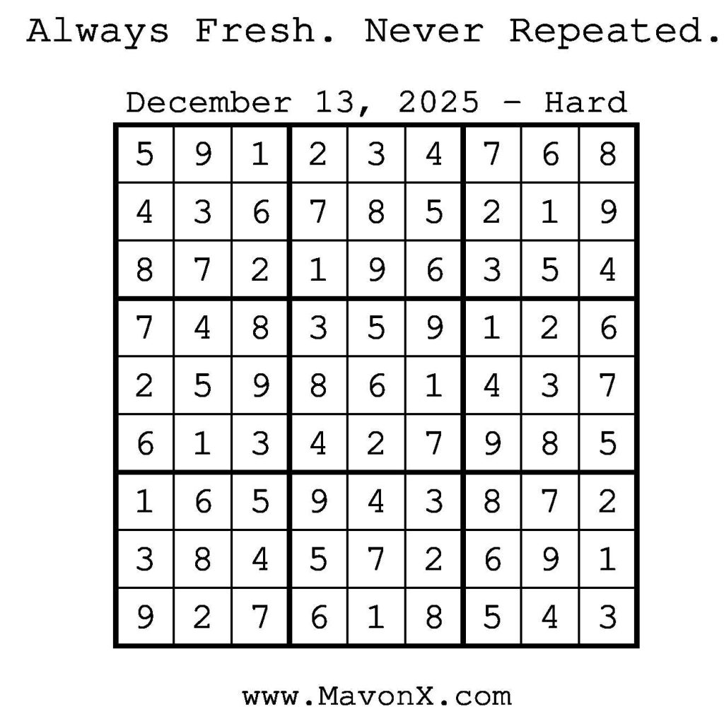 Puzzles of the Day – December 13, 2025 Post author:admin Post published:December 12, 2025 Post category:Free Stuff / Puzzle of the Day / Puzzle of the Day Solutions / Solutions Post comments:0 Comments Check out our books on Amazon! Check out our books on Barnes and Noble! Check out our books on Etsy! Easy Sudoku Coach Link Medium Sudoku Coach Link Hard Sudoku Coach Link Show Solution You Might Also Like Puzzles of the Day – September 12, 2025 September 11, 2025 Puzzles of the Day – January 27, 2025 January 27, 2025 Puzzles of the Day – December 06, 2025 December 5, 2025 Leave a Reply Cancel replyCommentEnter your name or username to comment Enter your email address to comment Enter your website URL (optional) Save my name, email, and website in this browser for the next time I comment.