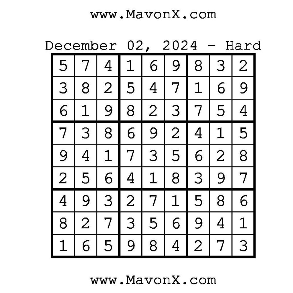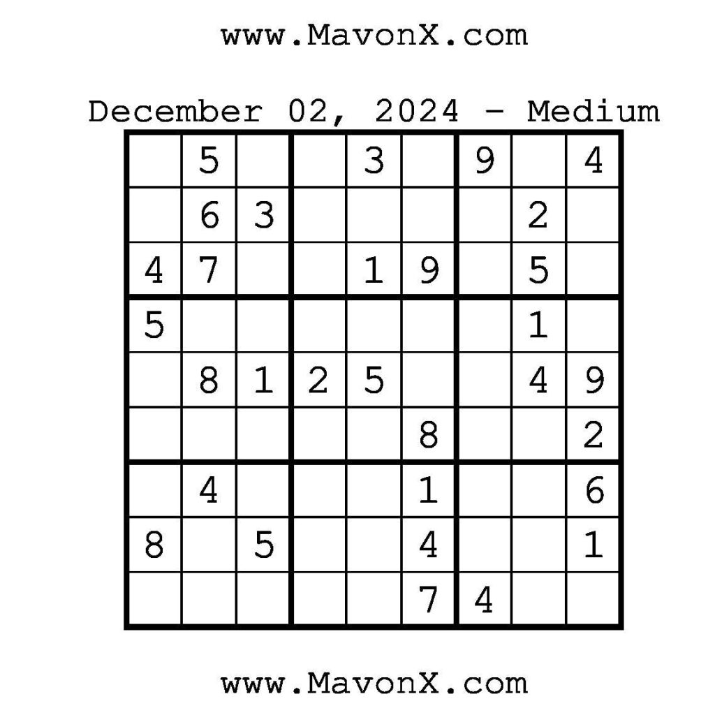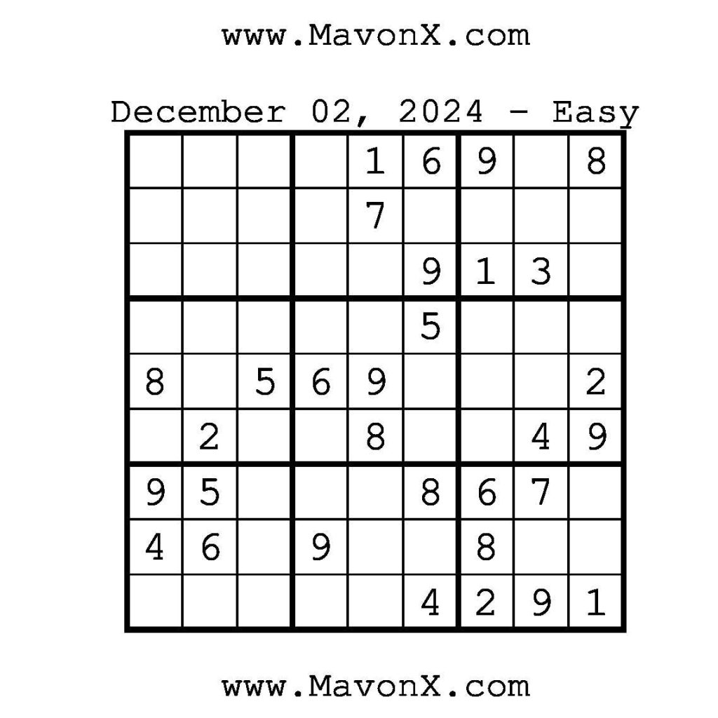 Puzzles of the Day – December 2, 2024 Post author:admin Post published:December 1, 2024 Post category:Free Stuff / Puzzle of the Day / Puzzle of the Day Solutions / Solutions Post comments:0 Comments Check out our books on Amazon!, Check out our books on Barnes and Noble!, Check out our books on Etsy! Easy Sudoku Coach Link Medium Sudoku Coach Link Hard Sudoku Coach Link Show Solution You Might Also Like Puzzles of the Day – January 23, 2025 January 23, 2025 Puzzles of the Day – April 13, 2026 April 12, 2026 Puzzles of the Day – January 9, 2026 January 8, 2026 Leave a Reply Cancel replyCommentEnter your name or username to comment Enter your email address to comment Enter your website URL (optional) Save my name, email, and website in this browser for the next time I comment.
