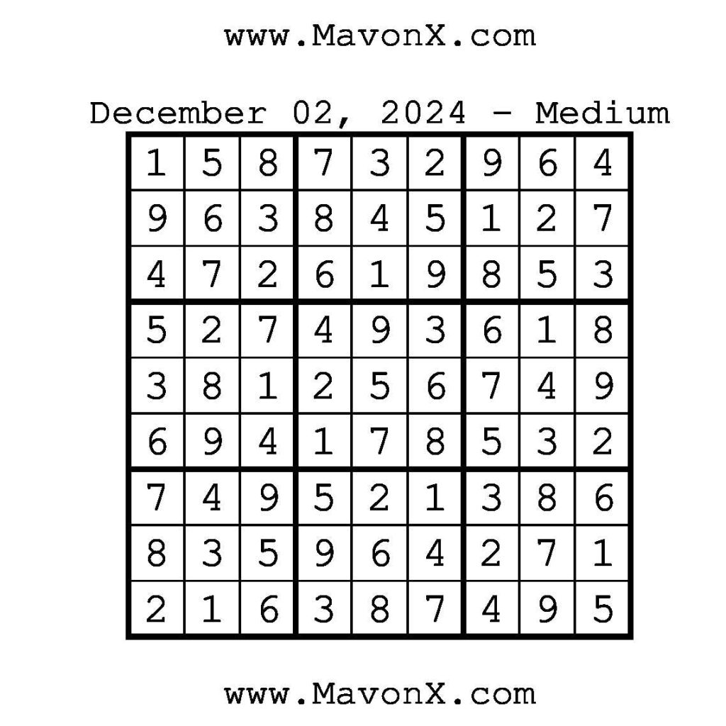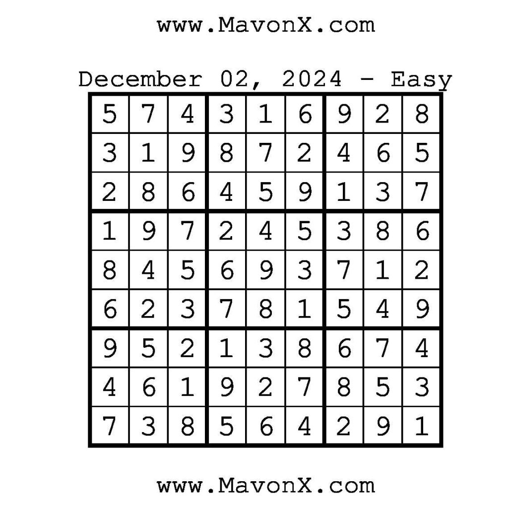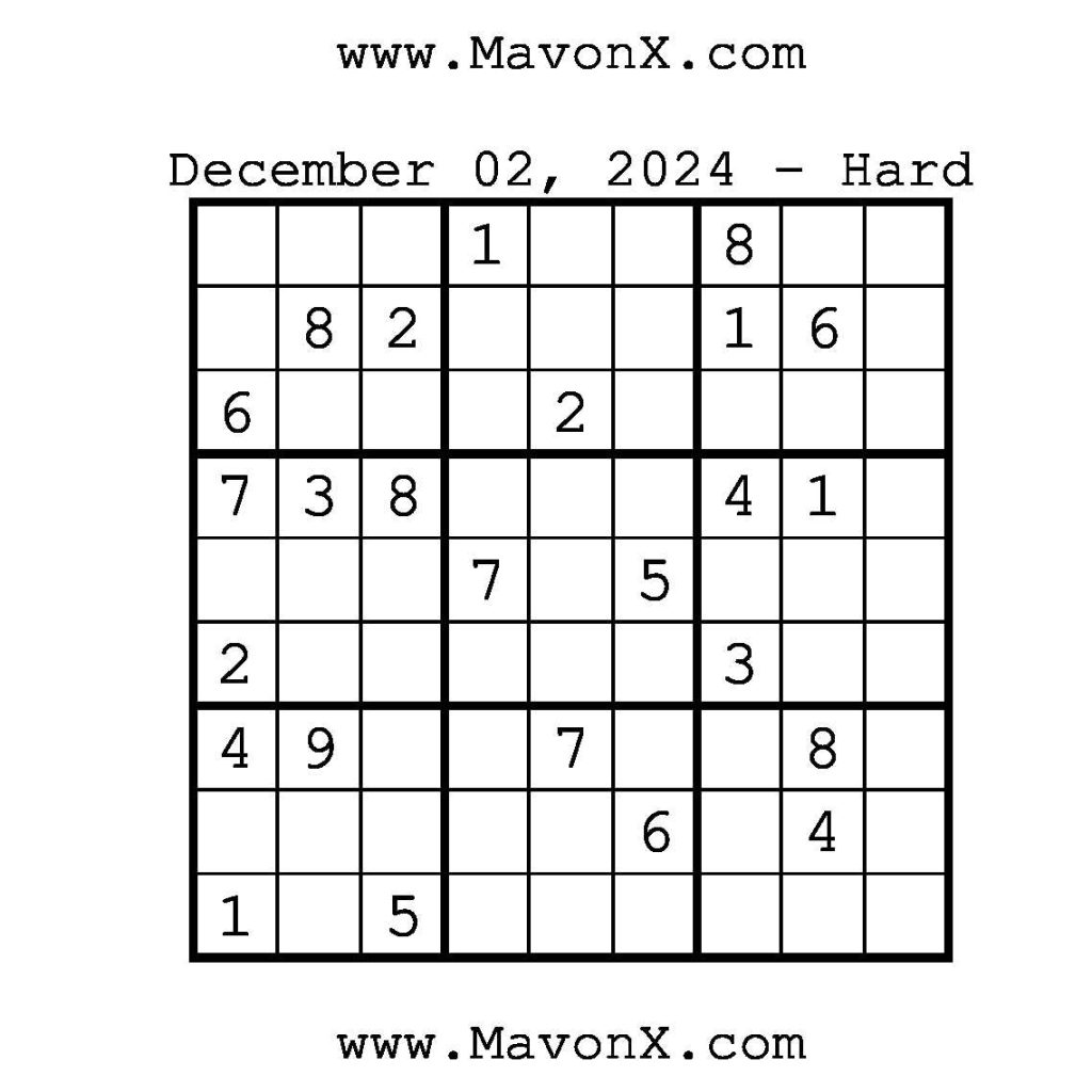 Puzzles of the Day – December 2, 2024 Post author:admin Post published:December 1, 2024 Post category:Free Stuff / Puzzle of the Day / Puzzle of the Day Solutions / Solutions Post comments:0 Comments Check out our books on Amazon!, Check out our books on Barnes and Noble!, Check out our books on Etsy! Easy Sudoku Coach Link Medium Sudoku Coach Link Hard Sudoku Coach Link Show Solution You Might Also Like Puzzles of the Day – January 23, 2025 January 23, 2025 Puzzles of the Day – April 13, 2026 April 12, 2026 Puzzles of the Day – January 9, 2026 January 8, 2026 Leave a Reply Cancel replyCommentEnter your name or username to comment Enter your email address to comment Enter your website URL (optional) Save my name, email, and website in this browser for the next time I comment.