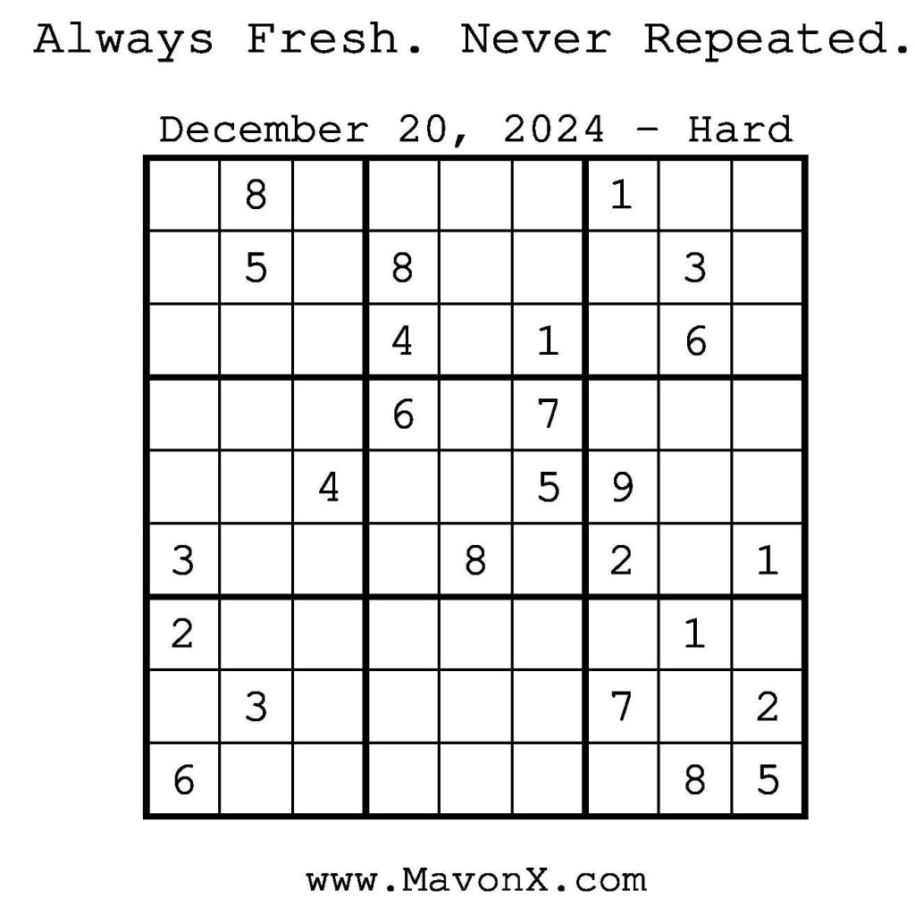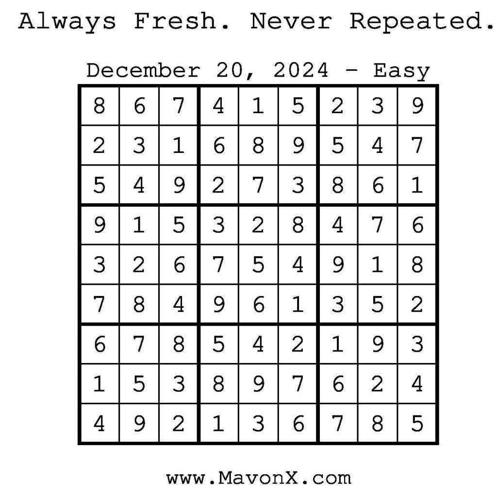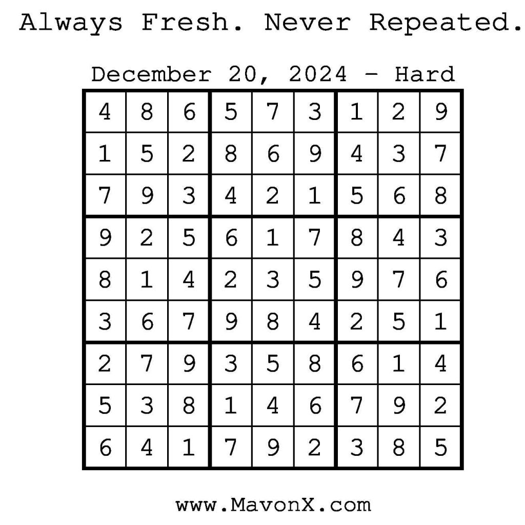 Puzzles of the Day – December 20, 2024 Post author:admin Post published:December 19, 2024 Post category:Free Stuff / Puzzle of the Day / Puzzle of the Day Solutions / Solutions Post comments:0 Comments Check out our books on Amazon! Check out our books on Barnes and Noble! Check out our books on Etsy! Easy Sudoku Coach Link Medium Sudoku Coach Link Hard Sudoku Coach Link Show Solution You Might Also Like Puzzles of the Day – March 22, 2026 March 22, 2026 Puzzles of the Day – April 10, 2025 April 10, 2025 Puzzles of the Day – August 12, 2024 August 11, 2024 Leave a Reply Cancel replyCommentEnter your name or username to comment Enter your email address to comment Enter your website URL (optional) Save my name, email, and website in this browser for the next time I comment.