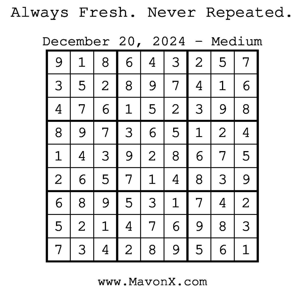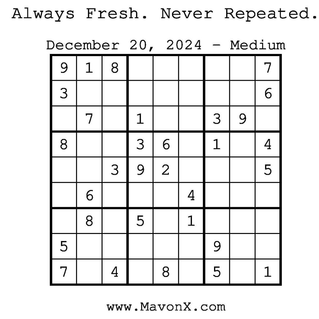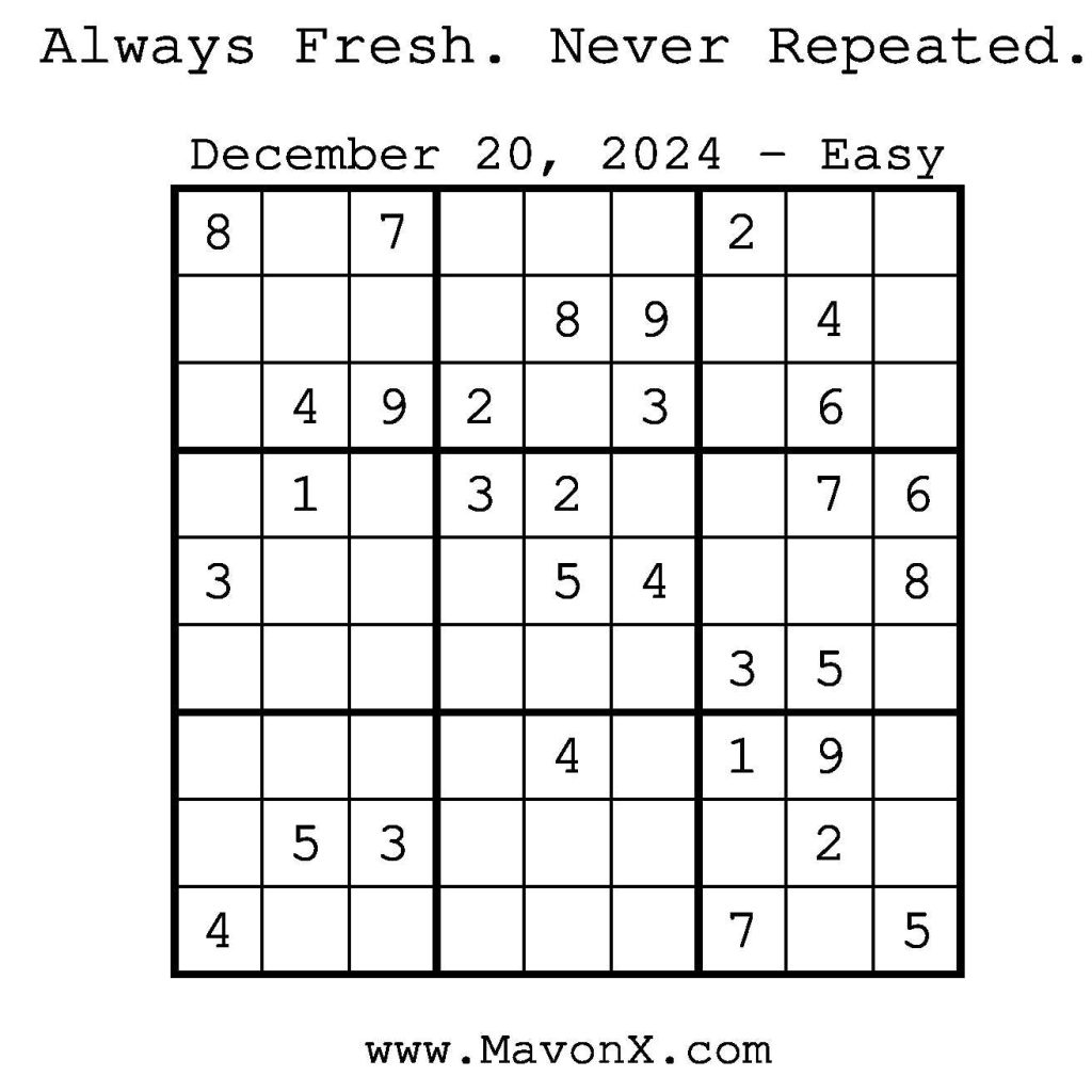 Puzzles of the Day – December 20, 2024 Post author:admin Post published:December 19, 2024 Post category:Free Stuff / Puzzle of the Day / Puzzle of the Day Solutions / Solutions Post comments:0 Comments Check out our books on Amazon! Check out our books on Barnes and Noble! Check out our books on Etsy! Easy Sudoku Coach Link Medium Sudoku Coach Link Hard Sudoku Coach Link Show Solution You Might Also Like Puzzles of the Day – March 22, 2026 March 22, 2026 Puzzles of the Day – April 10, 2025 April 10, 2025 Puzzles of the Day – August 12, 2024 August 11, 2024 Leave a Reply Cancel replyCommentEnter your name or username to comment Enter your email address to comment Enter your website URL (optional) Save my name, email, and website in this browser for the next time I comment.
