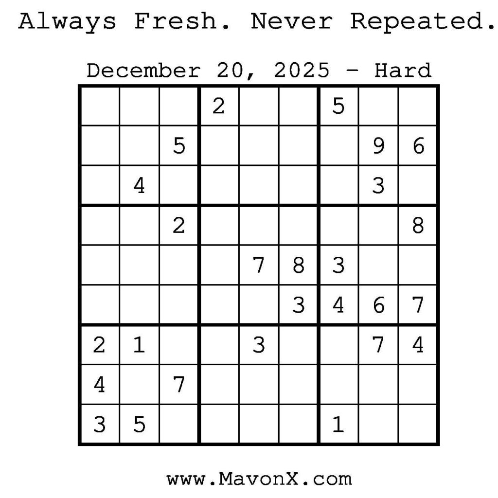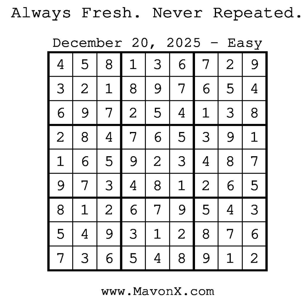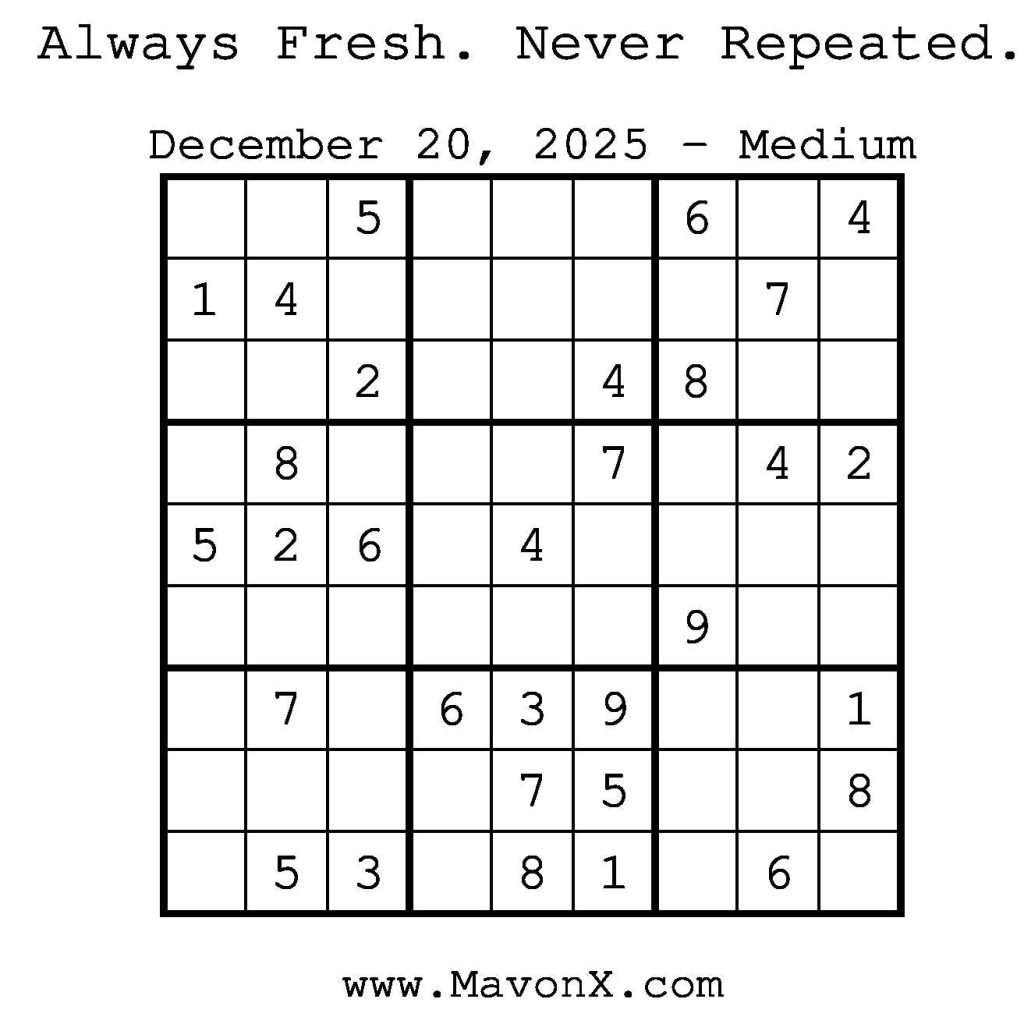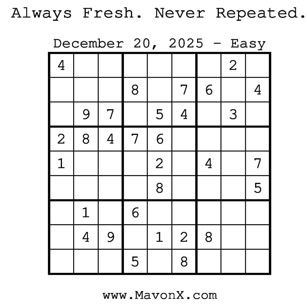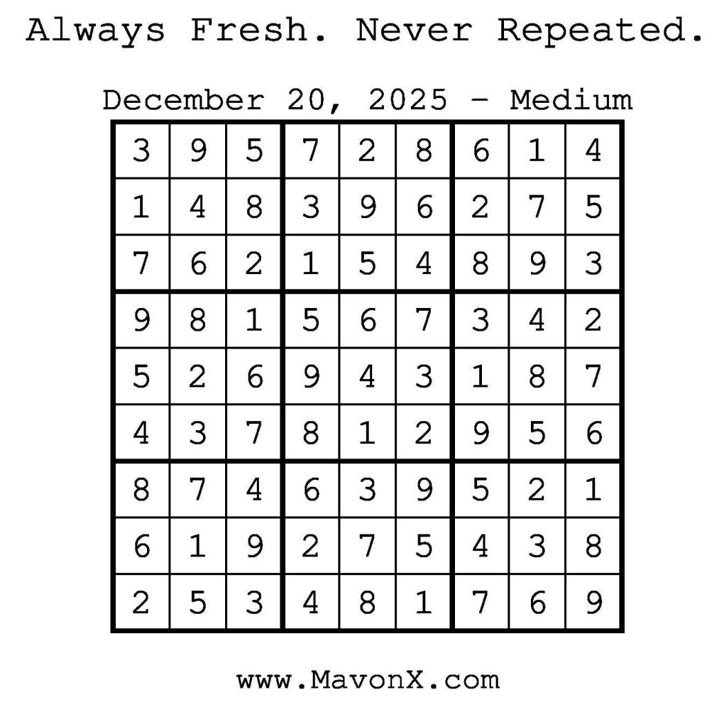 Puzzles of the Day – December 20, 2025 Post author:admin Post published:December 19, 2025 Post category:Free Stuff / Puzzle of the Day / Puzzle of the Day Solutions / Solutions Post comments:0 Comments Check out our books on Amazon! Check out our books on Barnes and Noble! Check out our books on Etsy! Easy Sudoku Coach Link Medium Sudoku Coach Link Hard Sudoku Coach Link Show Solution You Might Also Like Puzzles of the Day – June 21, 2025 June 22, 2025 Puzzles of the Day – January 4, 2025 January 4, 2025 Puzzles of the Day – August 19, 2024 August 19, 2024 Leave a Reply Cancel replyCommentEnter your name or username to comment Enter your email address to comment Enter your website URL (optional) Save my name, email, and website in this browser for the next time I comment.