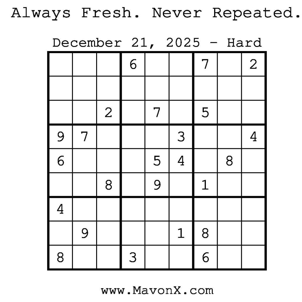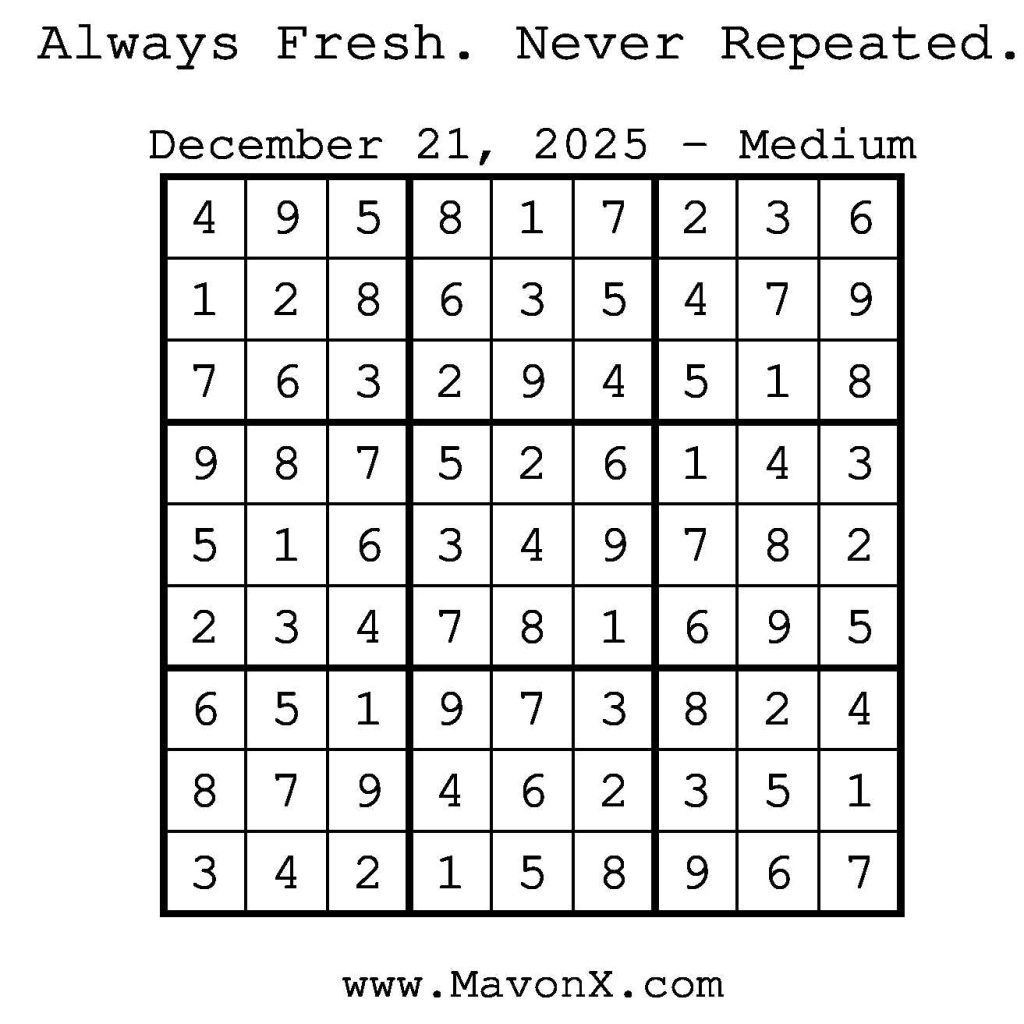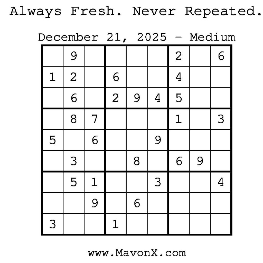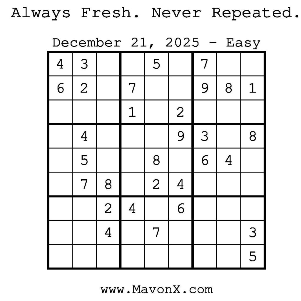 Puzzles of the Day – December 21, 2025 Post author:admin Post published:December 20, 2025 Post category:Free Stuff / Puzzle of the Day / Puzzle of the Day Solutions / Solutions Post comments:0 Comments Check out our books on Amazon! Check out our books on Barnes and Noble! Check out our books on Etsy! Easy Sudoku Coach Link Medium Sudoku Coach Link Hard Sudoku Coach Link Show Solution You Might Also Like Puzzles of the Day – September 4, 2025 September 3, 2025 Puzzles of the Day – October 22, 2024 October 21, 2024 Puzzles of the Day – February 4, 2025 February 3, 2025 Leave a Reply Cancel replyCommentEnter your name or username to comment Enter your email address to comment Enter your website URL (optional) Save my name, email, and website in this browser for the next time I comment.