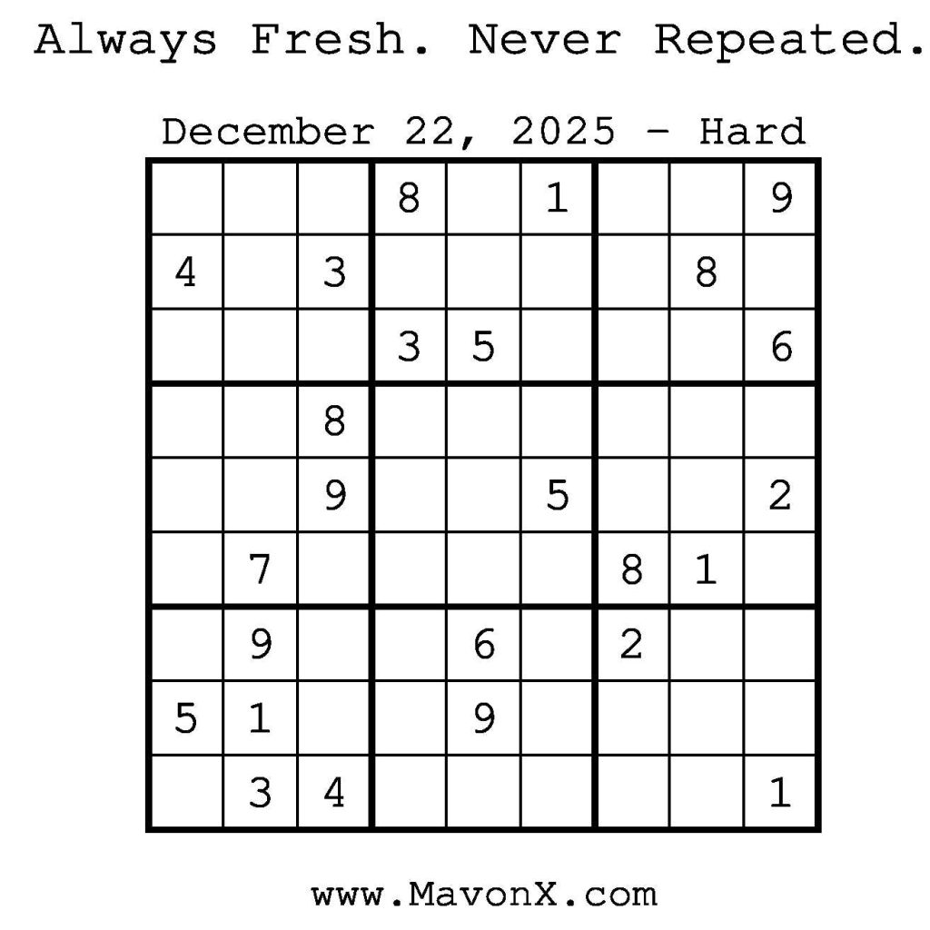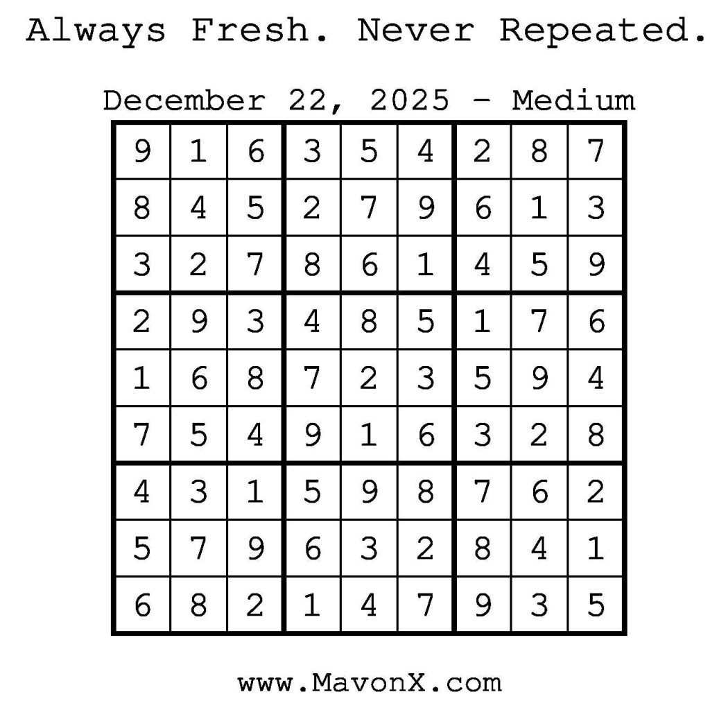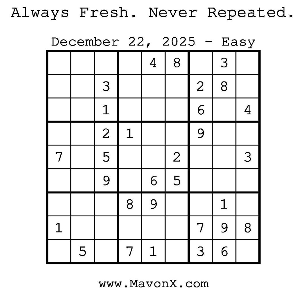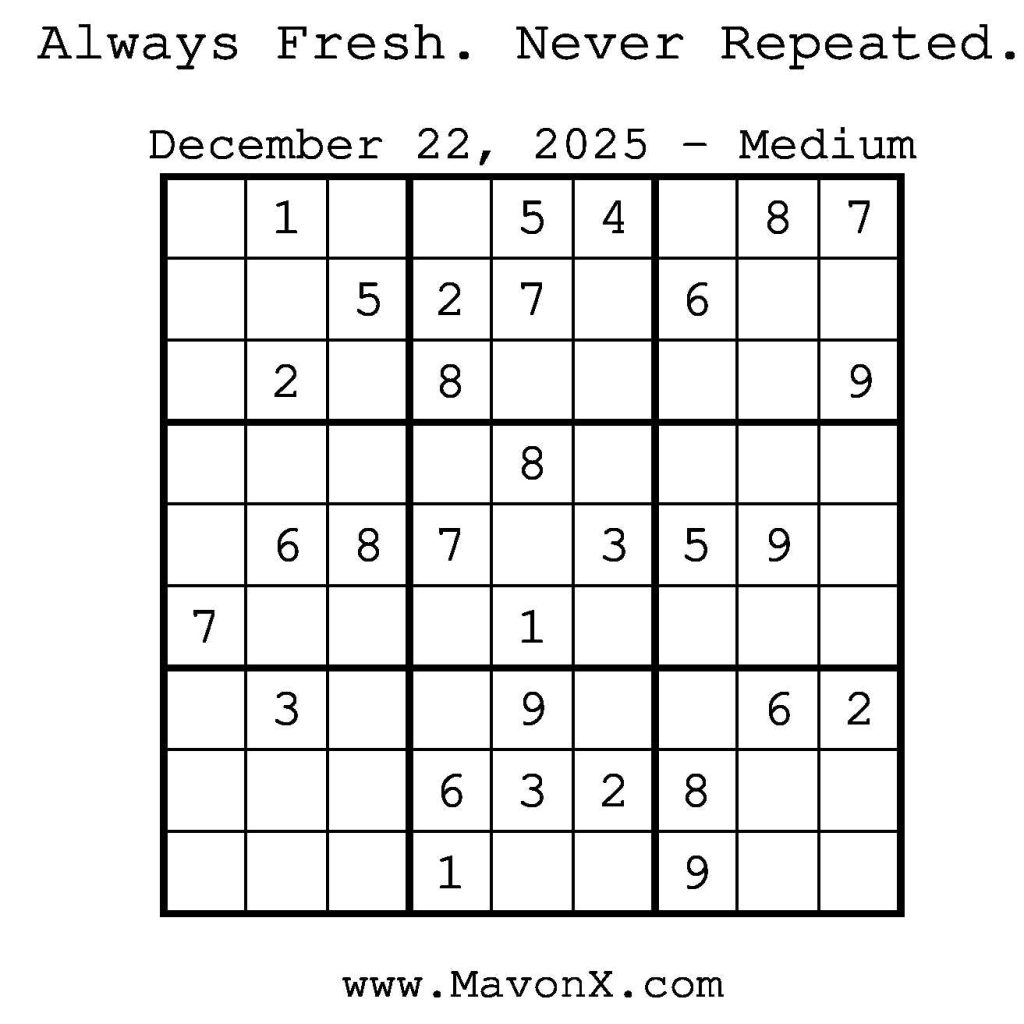Puzzles of the Day – December 22, 2025 Post author:admin Post published:December 21, 2025 Post category:Free Stuff / Puzzle of the Day / Puzzle of the Day Solutions / Solutions Post comments:0 Comments Check out our books on Amazon! Check out our books on Barnes and Noble! Check out our books on Etsy! Easy Sudoku Coach Link Medium Sudoku Coach Link Hard Sudoku Coach Link Show Solution You Might Also Like Puzzles of the Day – February 19, 2026 February 18, 2026 Puzzles of the Day – June 4, 2025 June 3, 2025 Puzzles of the Day – January 23, 2025 January 23, 2025 Leave a Reply Cancel replyCommentEnter your name or username to comment Enter your email address to comment Enter your website URL (optional) Save my name, email, and website in this browser for the next time I comment.
