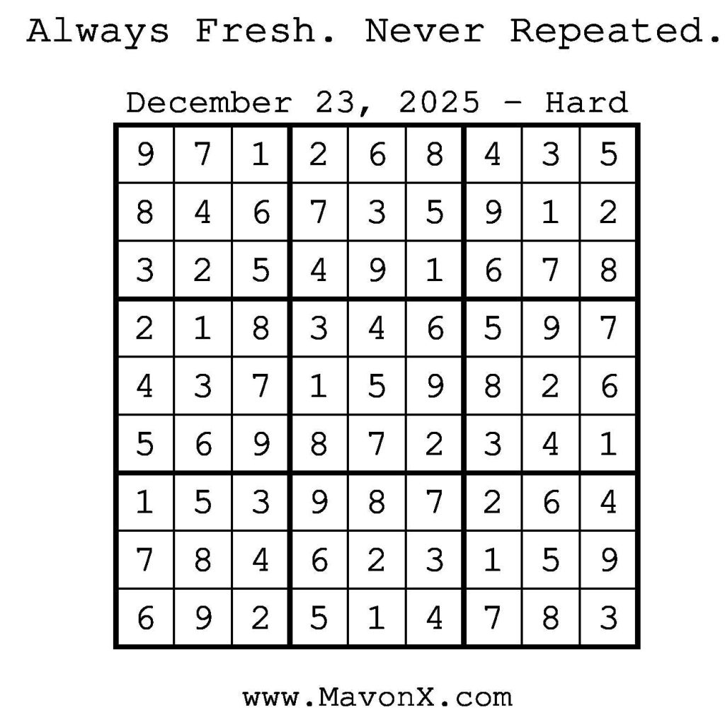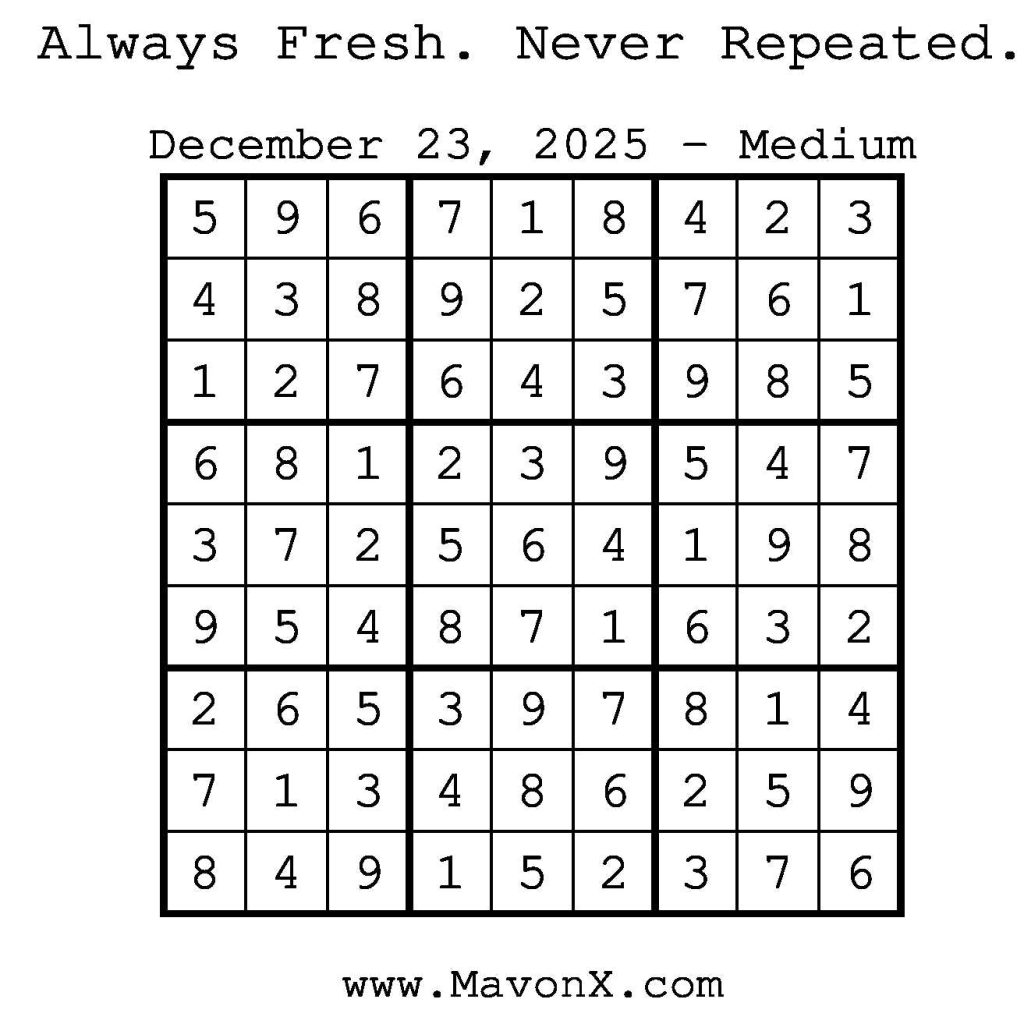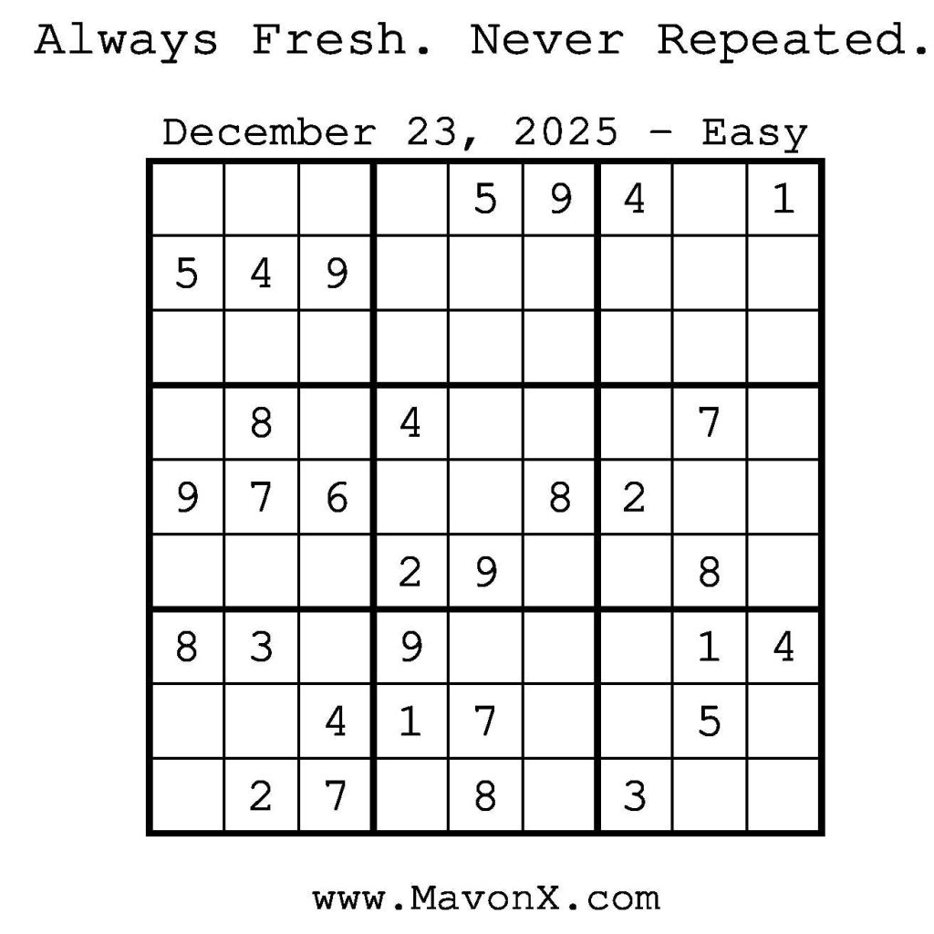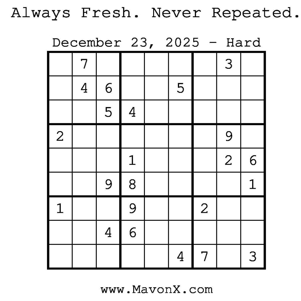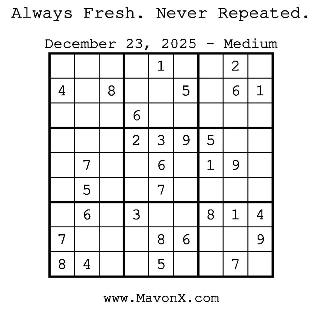 Puzzles of the Day – December 23, 2025 Post author:admin Post published:December 23, 2025 Post category:Free Stuff / Puzzle of the Day / Puzzle of the Day Solutions / Solutions Post comments:0 Comments Check out our books on Amazon! Check out our books on Barnes and Noble! Check out our books on Etsy! Easy Sudoku Coach Link Medium Sudoku Coach Link Hard Sudoku Coach Link Show Solution You Might Also Like Puzzles of the Day – July 14, 2025 July 14, 2025 Puzzles of the Day – August 30, 2024 August 30, 2024 Puzzles of the Day – April 13, 2026 April 12, 2026 Leave a Reply Cancel replyCommentEnter your name or username to comment Enter your email address to comment Enter your website URL (optional) Save my name, email, and website in this browser for the next time I comment.