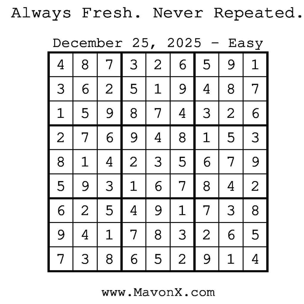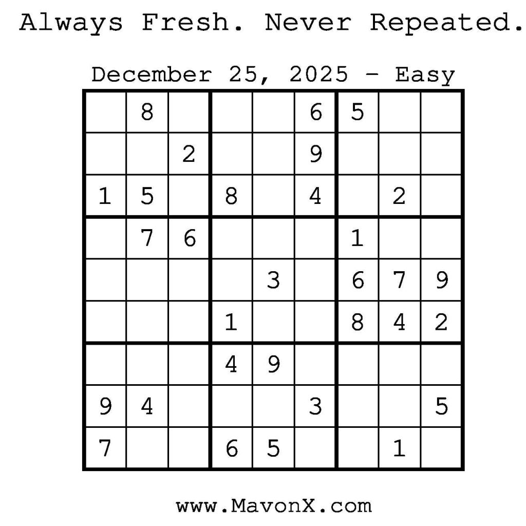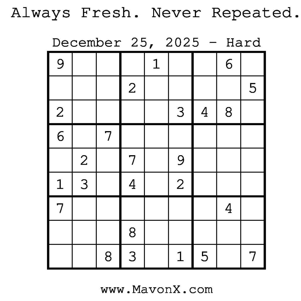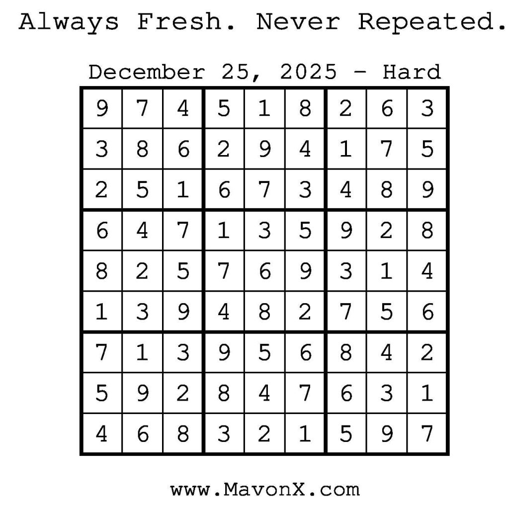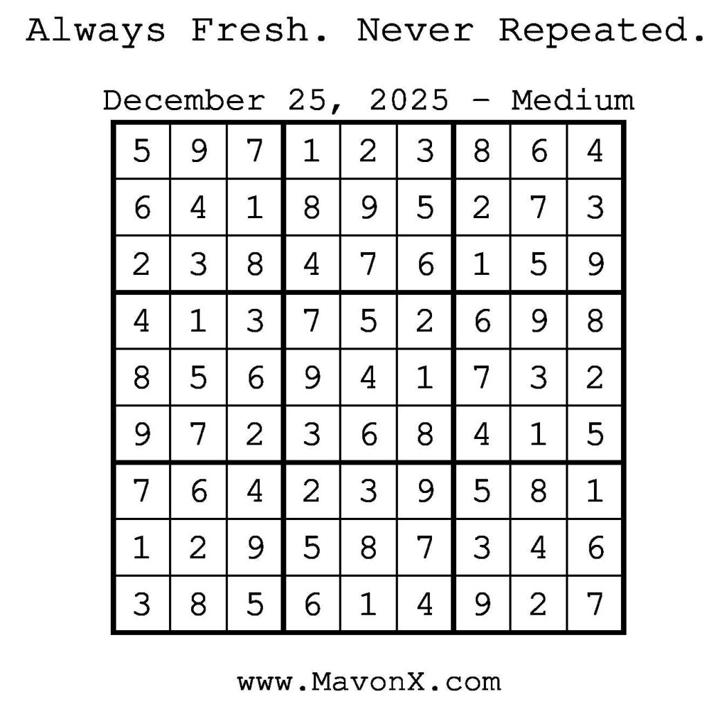 Puzzles of the Day – December 25, 2025 Post author:admin Post published:December 24, 2025 Post category:Free Stuff / Puzzle of the Day / Puzzle of the Day Solutions / Solutions Post comments:0 Comments Check out our books on Amazon! Check out our books on Barnes and Noble! Check out our books on Etsy! Easy Sudoku Coach Link Medium Sudoku Coach Link Hard Sudoku Coach Link Show Solution You Might Also Like Puzzles of the Day – December 04, 2025 December 3, 2025 Puzzles of the Day – December 21, 2025 December 20, 2025 Puzzles of the Day – December 23, 2024 December 23, 2024 Leave a Reply Cancel replyCommentEnter your name or username to comment Enter your email address to comment Enter your website URL (optional) Save my name, email, and website in this browser for the next time I comment.