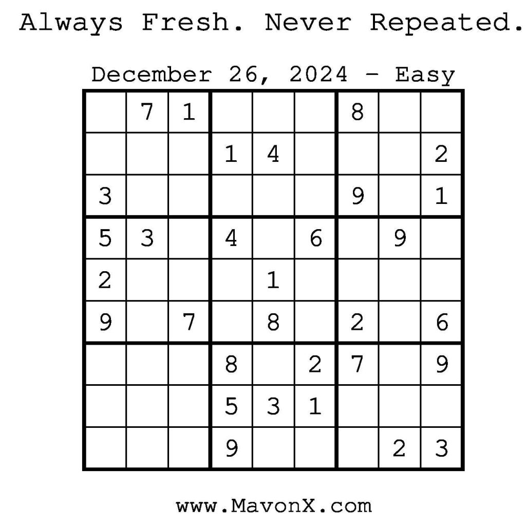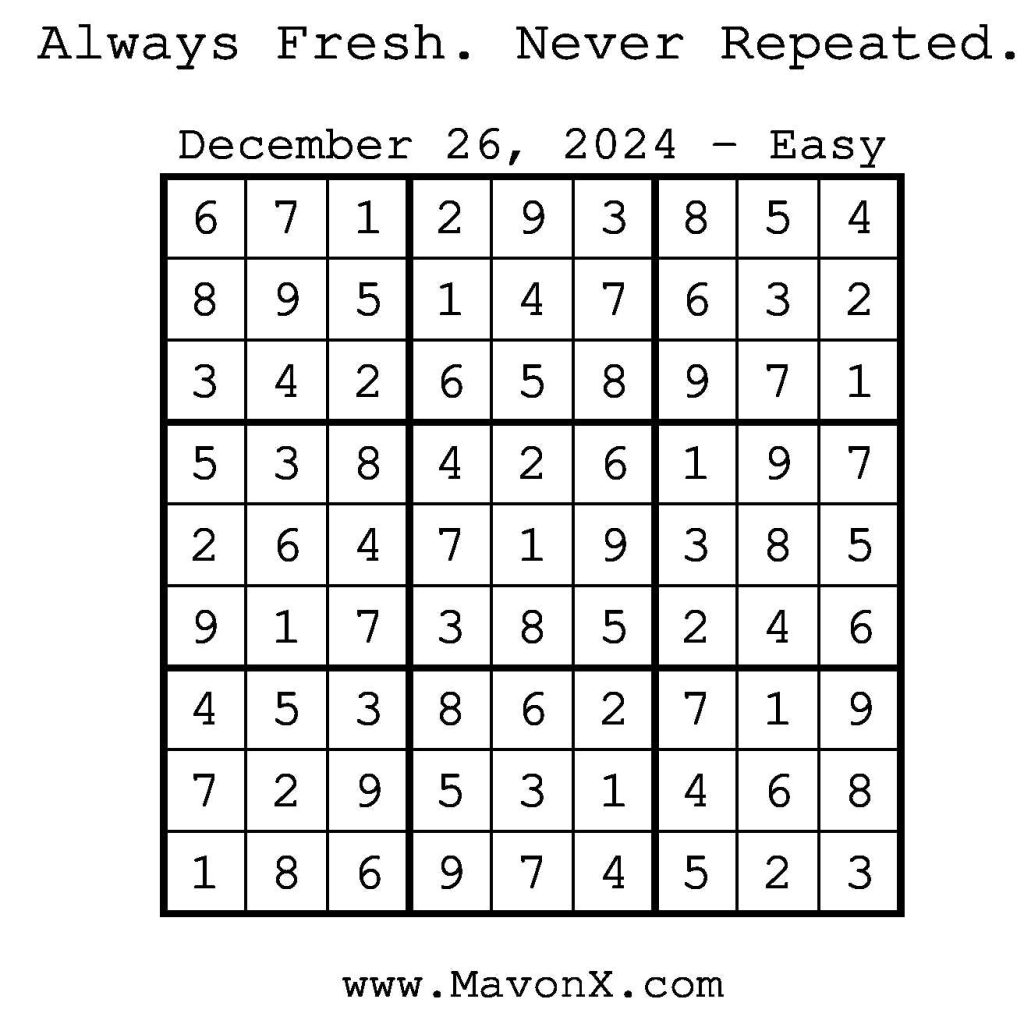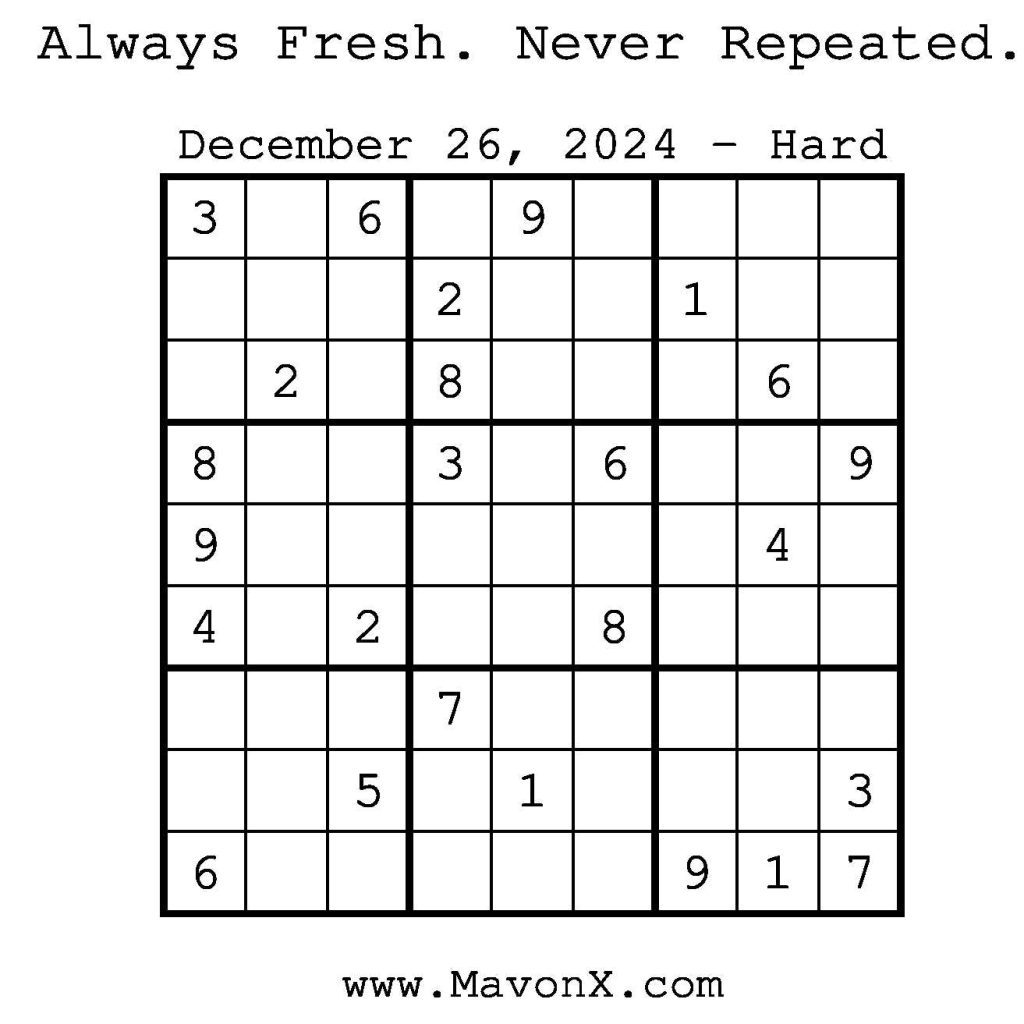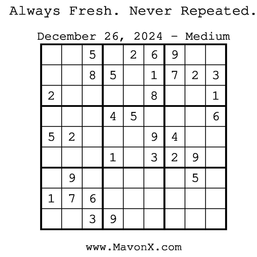 Puzzles of the Day – December 26, 2024 Post author:admin Post published:December 25, 2024 Post category:Free Stuff / Puzzle of the Day / Puzzle of the Day Solutions / Solutions Post comments:0 Comments Check out our books on Amazon! Check out our books on Barnes and Noble! Check out our books on Etsy! Easy Sudoku Coach Link Medium Sudoku Coach Link Hard Sudoku Coach Link Show Solution You Might Also Like Puzzles of the Day – September 21, 2025 September 21, 2025 Puzzles of the Day – April 3, 2026 April 2, 2026 Puzzles of the Day – October 7, 2025 October 6, 2025 Leave a Reply Cancel replyCommentEnter your name or username to comment Enter your email address to comment Enter your website URL (optional) Save my name, email, and website in this browser for the next time I comment.