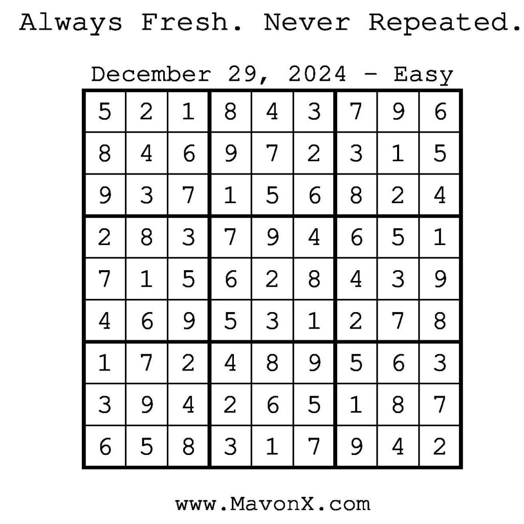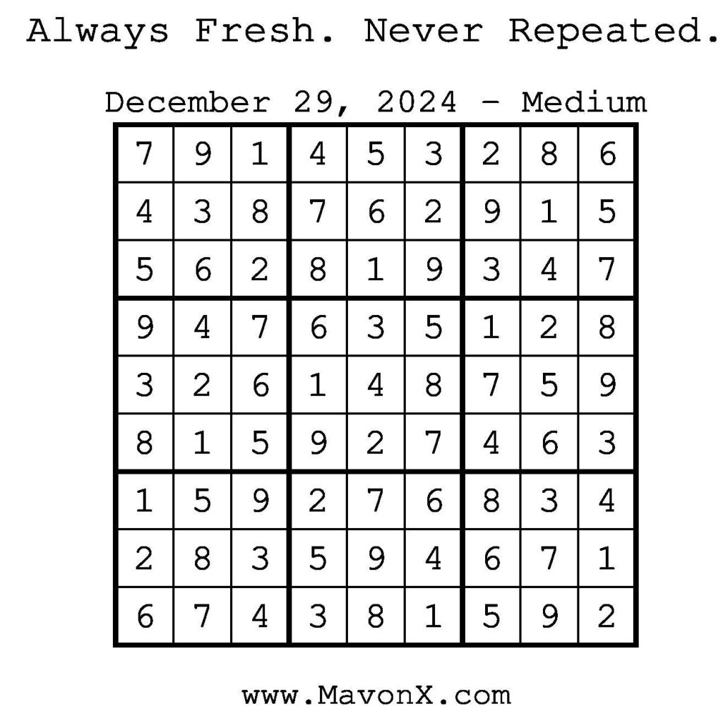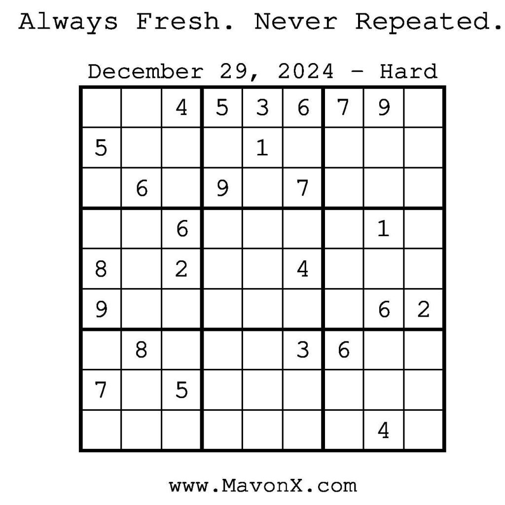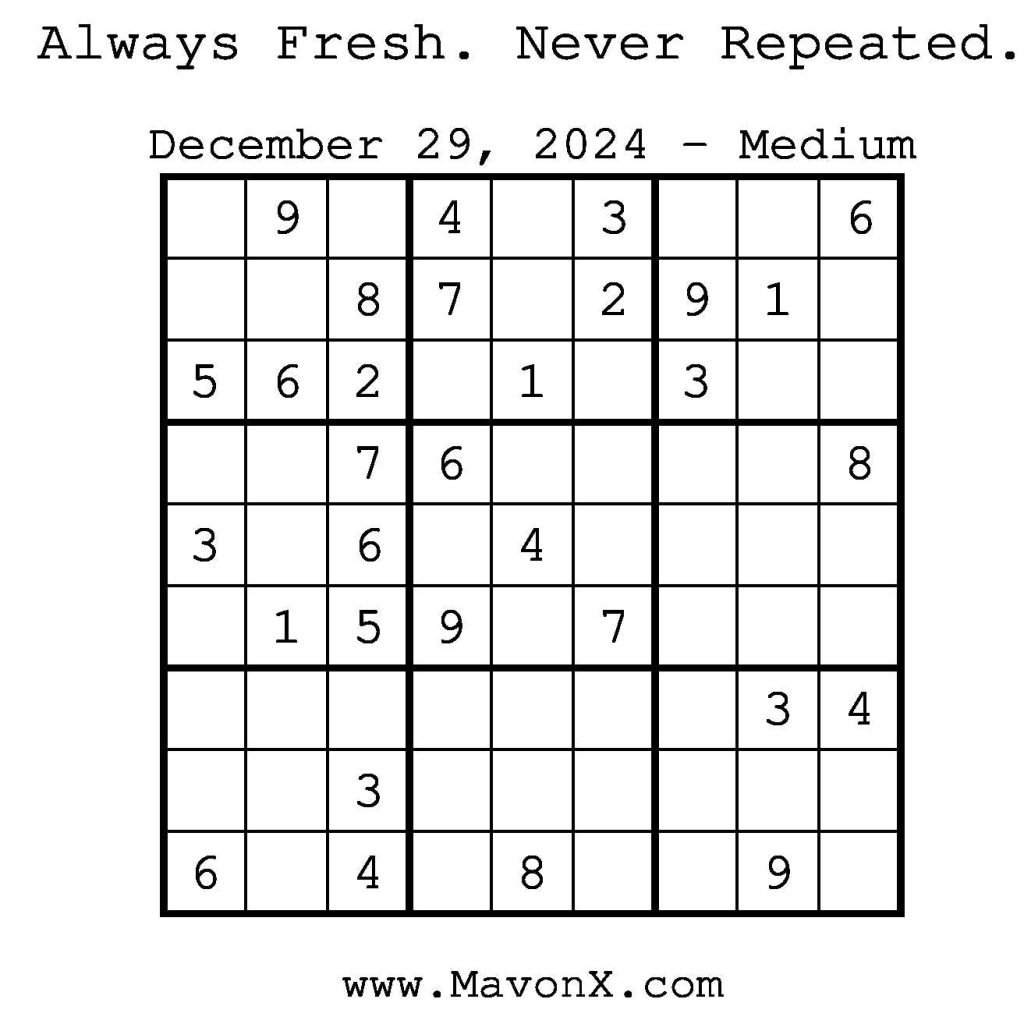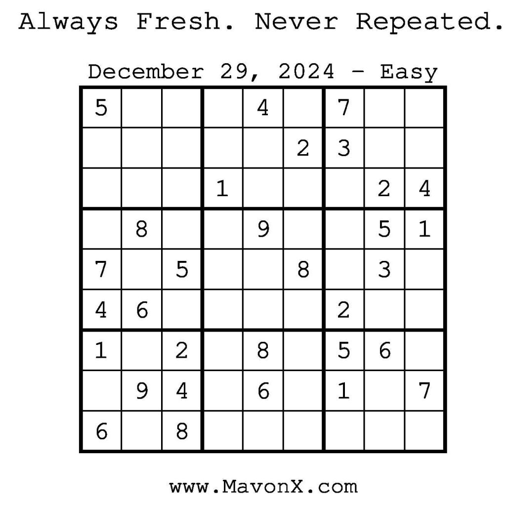 Puzzles of the Day – December 29, 2024 Post author:admin Post published:December 29, 2024 Post category:Free Stuff / Puzzle of the Day / Puzzle of the Day Solutions / Solutions Post comments:0 Comments Check out our books on Amazon! Check out our books on Barnes and Noble! Check out our books on Etsy! Easy Sudoku Coach Link Medium Sudoku Coach Link Hard Sudoku Coach Link Show Solution You Might Also Like Puzzles of the Day – June 14, 2025 June 16, 2025 Puzzles of the Day – October 30, 2024 October 30, 2024 Puzzles of the Day – October 12, 2024 October 12, 2024 Leave a Reply Cancel replyCommentEnter your name or username to comment Enter your email address to comment Enter your website URL (optional) Save my name, email, and website in this browser for the next time I comment.