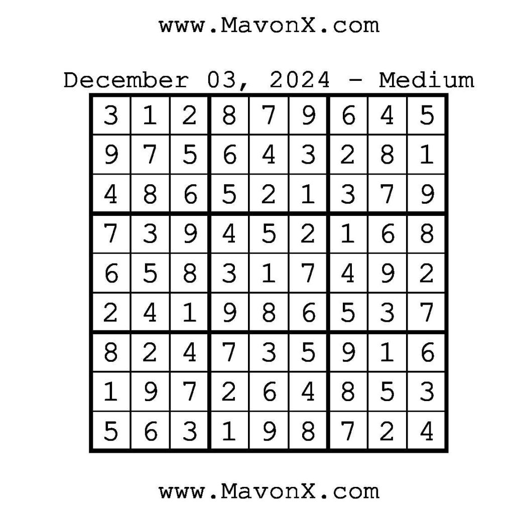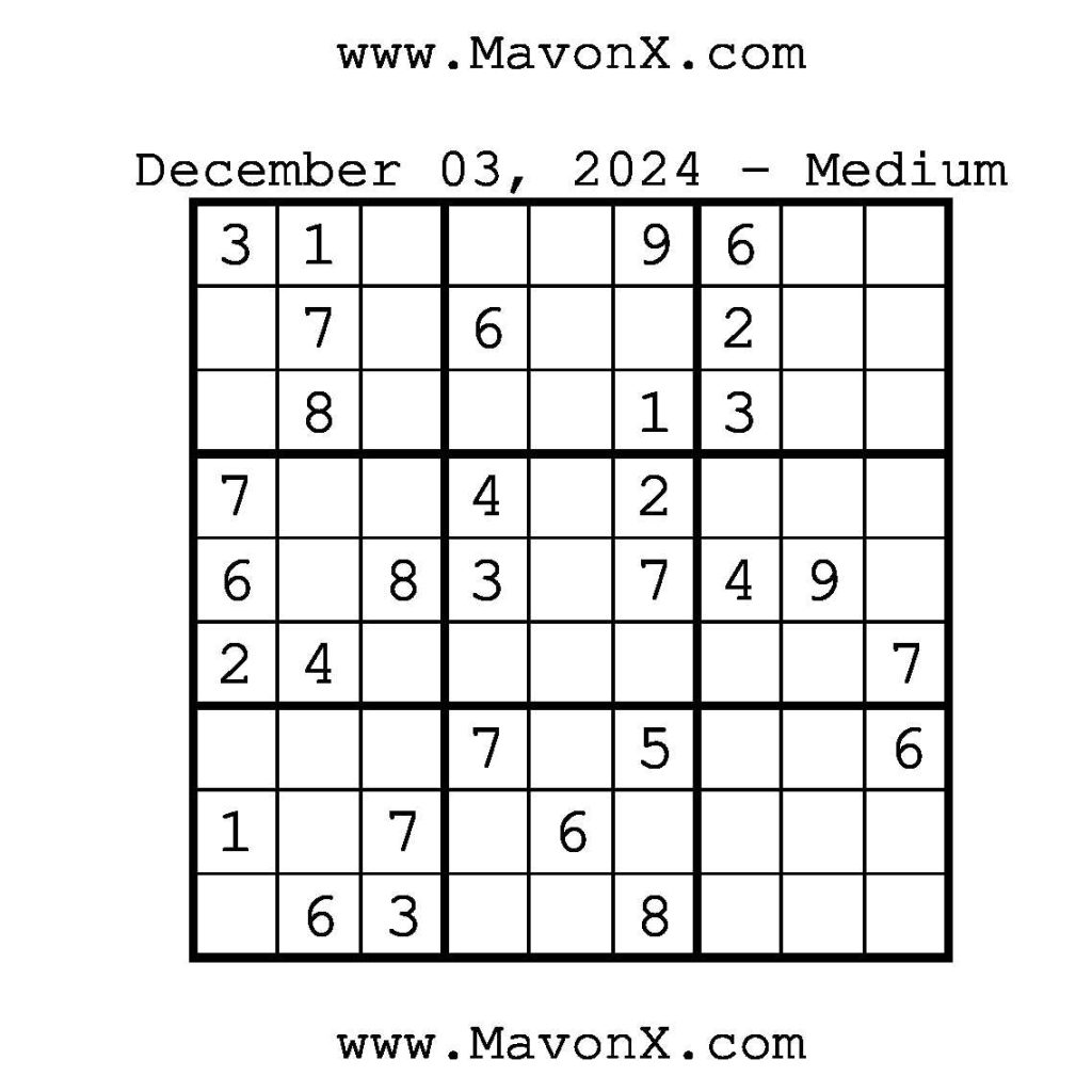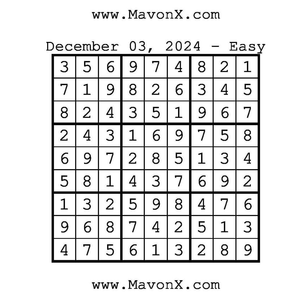 Puzzles of the Day – December 3, 2024 Post author:admin Post published:December 2, 2024 Post category:Free Stuff / Puzzle of the Day / Puzzle of the Day Solutions / Solutions Post comments:0 Comments Check out our books on Amazon!, Check out our books on Barnes and Noble!, Check out our books on Etsy! Easy Sudoku Coach Link Medium Sudoku Coach Link Hard Sudoku Coach Link Show Solution You Might Also Like Puzzles of the Day – August 9, 2025 August 8, 2025 Puzzle of the Day – July 25, 2024 July 26, 2024 Puzzle of the Day – July 11, 2024 July 11, 2024 Leave a Reply Cancel replyCommentEnter your name or username to comment Enter your email address to comment Enter your website URL (optional) Save my name, email, and website in this browser for the next time I comment.