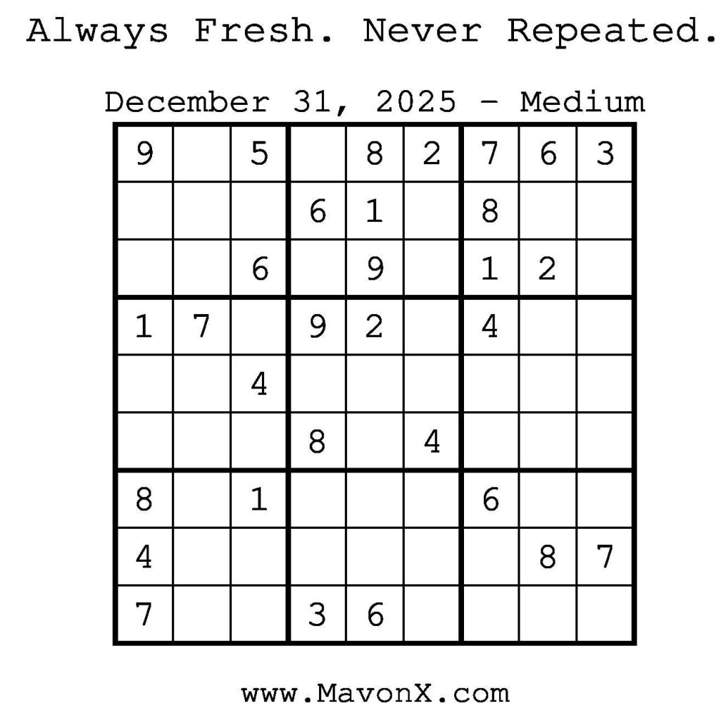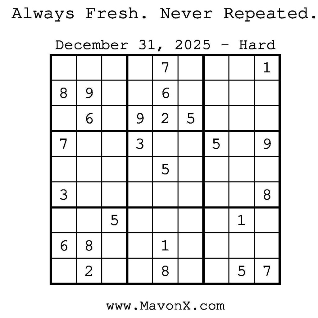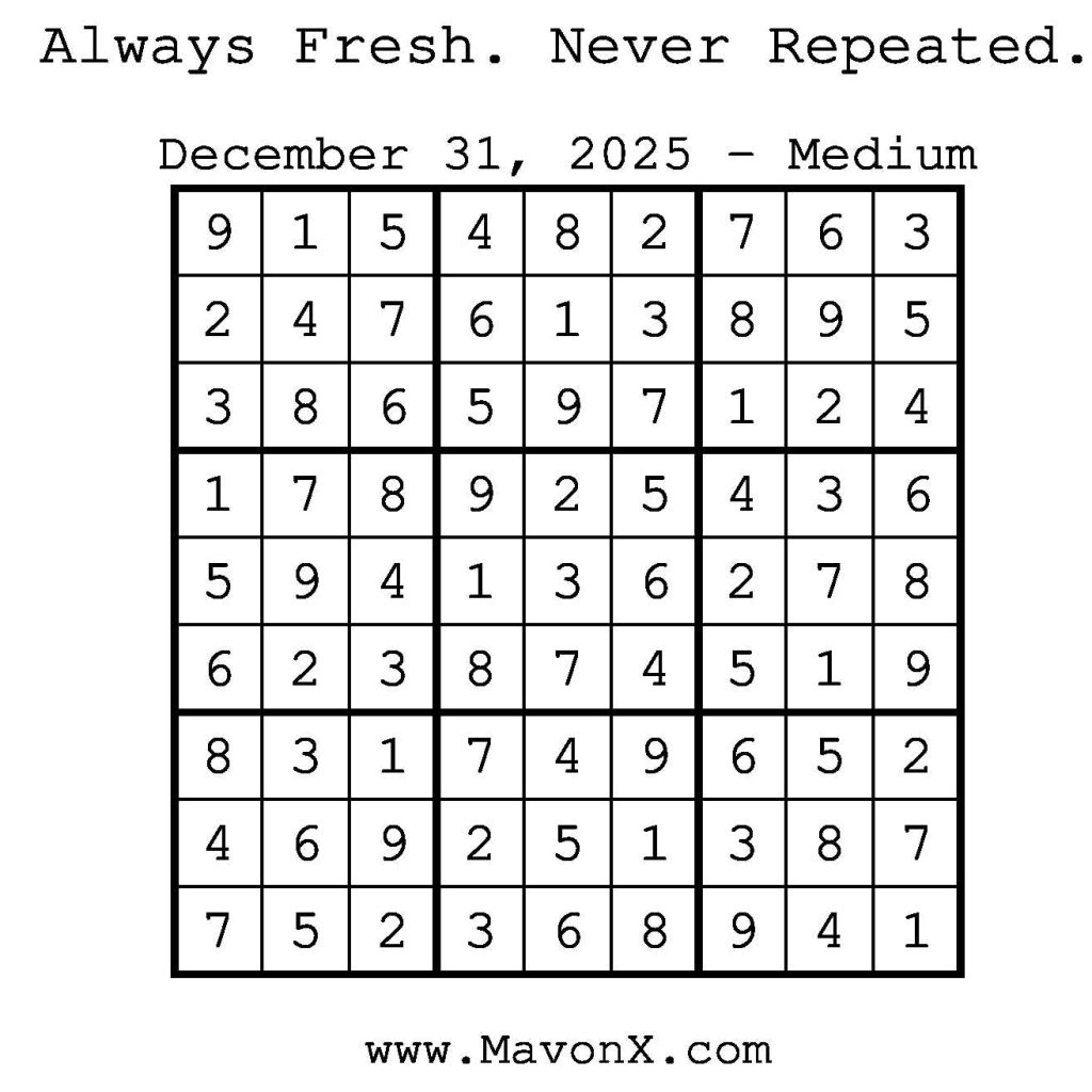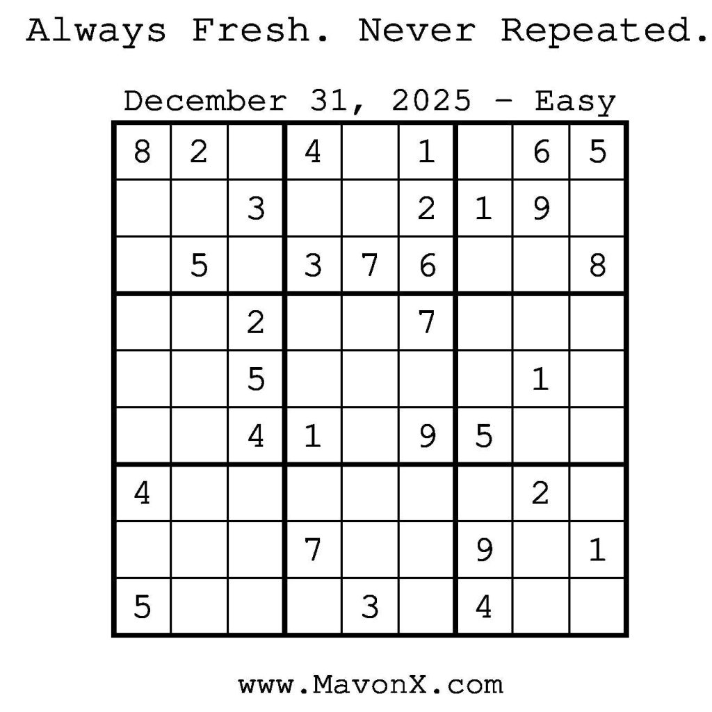 Puzzles of the Day – December 31, 2025 Post author:admin Post published:December 31, 2025 Post category:Free Stuff / Puzzle of the Day / Puzzle of the Day Solutions / Solutions Post comments:0 Comments Check out our books on Amazon! Check out our books on Barnes and Noble! Check out our books on Etsy! Easy Sudoku Coach Link Medium Sudoku Coach Link Hard Sudoku Coach Link Show Solution You Might Also Like Puzzles of the Day – January 12, 2025 January 12, 2025 Puzzles of the Day – March 31, 2025 March 31, 2025 Puzzles of the Day – May 11, 2025 May 10, 2025 Leave a Reply Cancel replyCommentEnter your name or username to comment Enter your email address to comment Enter your website URL (optional) Save my name, email, and website in this browser for the next time I comment.