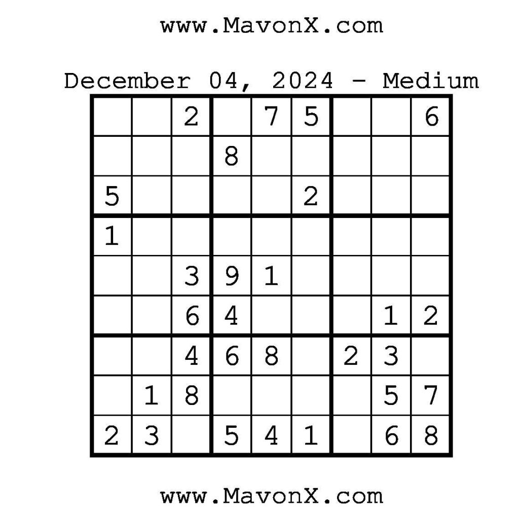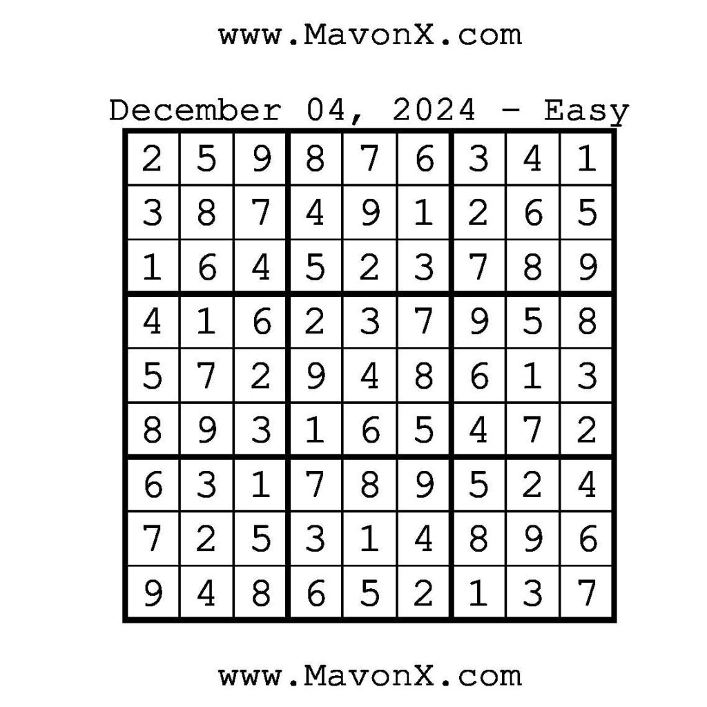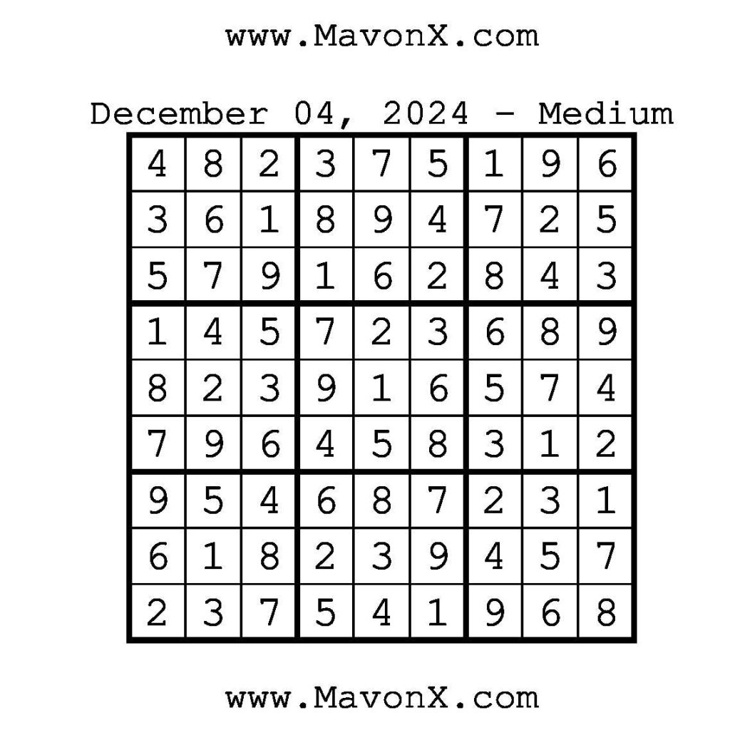 Puzzles of the Day – December 4, 2024 Post author:admin Post published:December 3, 2024 Post category:Free Stuff / Puzzle of the Day / Puzzle of the Day Solutions / Solutions Post comments:0 Comments Check out our books on Amazon!, Check out our books on Barnes and Noble!, Check out our books on Etsy! Easy Sudoku Coach Link Medium Sudoku Coach Link Hard Sudoku Coach Link Show Solution You Might Also Like Puzzles of the Day – December 7, 2024 December 7, 2024 Puzzles of the Day – June 28, 2025 June 27, 2025 Puzzles of the Day – August 24, 2025 August 24, 2025 Leave a Reply Cancel replyCommentEnter your name or username to comment Enter your email address to comment Enter your website URL (optional) Save my name, email, and website in this browser for the next time I comment.