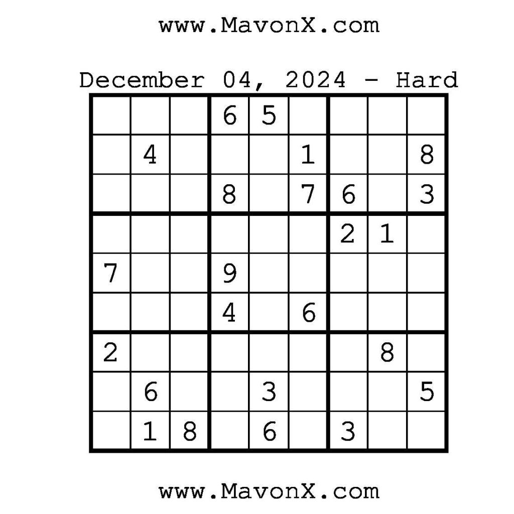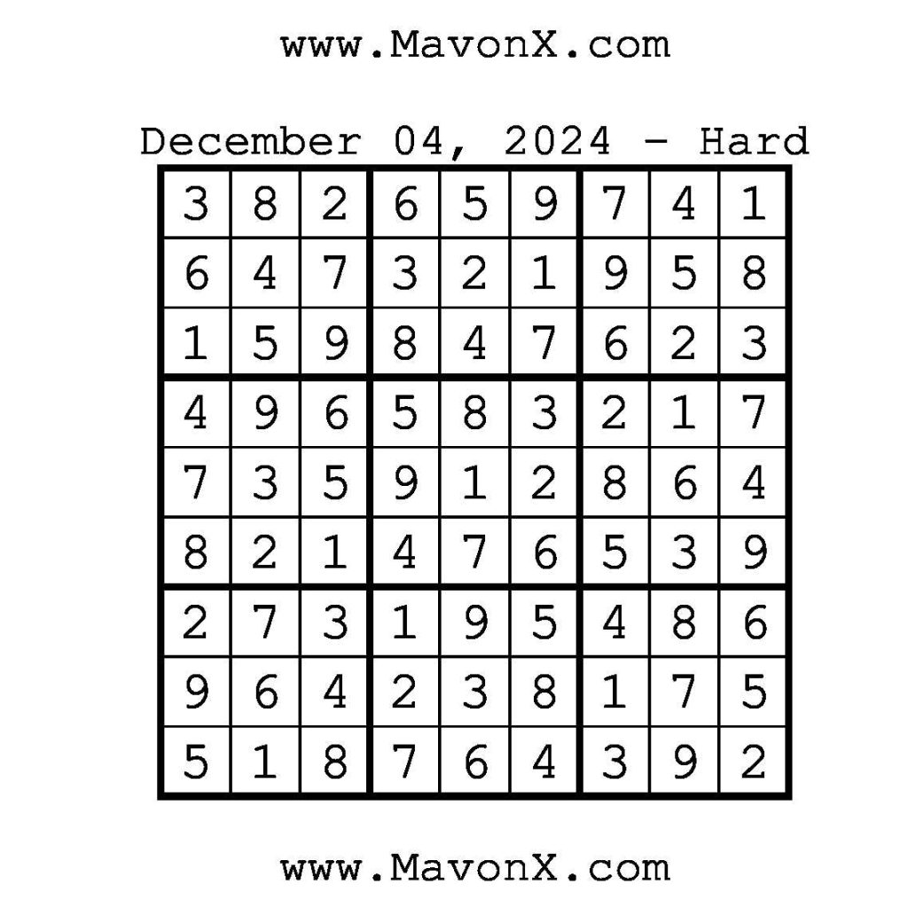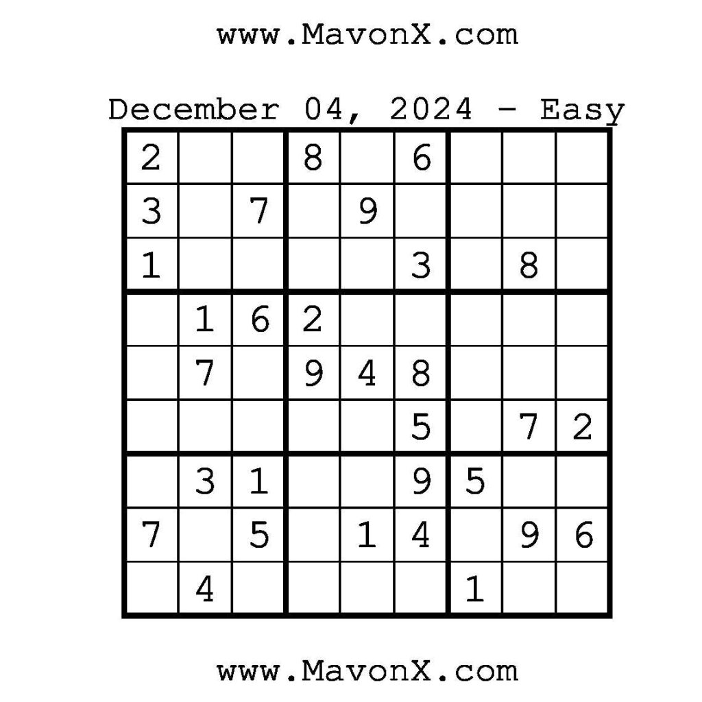 Puzzles of the Day – December 4, 2024 Post author:admin Post published:December 3, 2024 Post category:Free Stuff / Puzzle of the Day / Puzzle of the Day Solutions / Solutions Post comments:0 Comments Check out our books on Amazon!, Check out our books on Barnes and Noble!, Check out our books on Etsy! Easy Sudoku Coach Link Medium Sudoku Coach Link Hard Sudoku Coach Link Show Solution You Might Also Like Puzzles of the Day – December 7, 2024 December 7, 2024 Puzzles of the Day – June 28, 2025 June 27, 2025 Puzzles of the Day – August 24, 2025 August 24, 2025 Leave a Reply Cancel replyCommentEnter your name or username to comment Enter your email address to comment Enter your website URL (optional) Save my name, email, and website in this browser for the next time I comment.