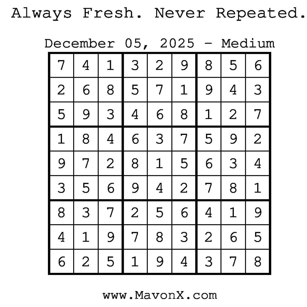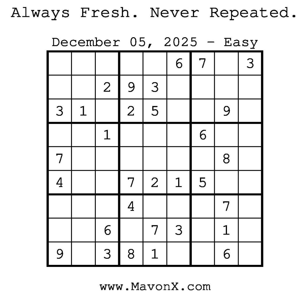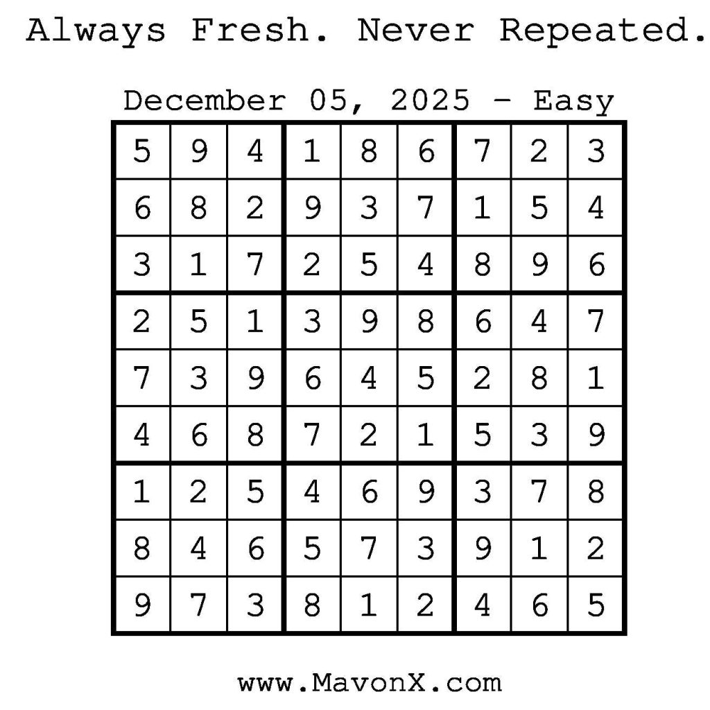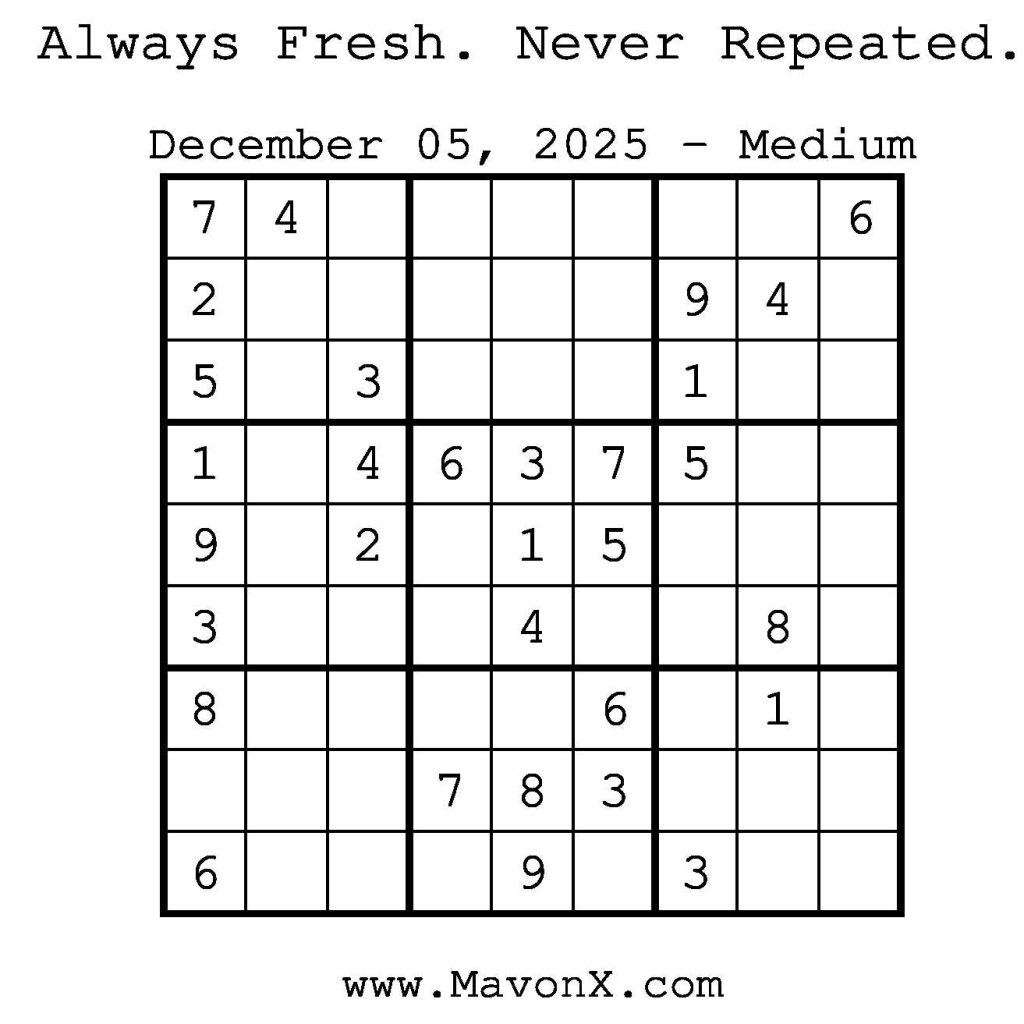 Puzzles of the Day – December 05, 2025 Post author:admin Post published:December 4, 2025 Post category:Free Stuff / Puzzle of the Day / Puzzle of the Day Solutions / Solutions Post comments:0 Comments Check out our books on Amazon! Check out our books on Barnes and Noble! Check out our books on Etsy! Easy Sudoku Coach Link Medium Sudoku Coach Link Hard Sudoku Coach Link Show Solution You Might Also Like Puzzles of the Day – December 26, 2025 December 25, 2025 Puzzles of the Day – November 7, 2025 November 6, 2025 Puzzles of the Day – September 7, 2025 September 6, 2025 Leave a Reply Cancel replyCommentEnter your name or username to comment Enter your email address to comment Enter your website URL (optional) Save my name, email, and website in this browser for the next time I comment.
