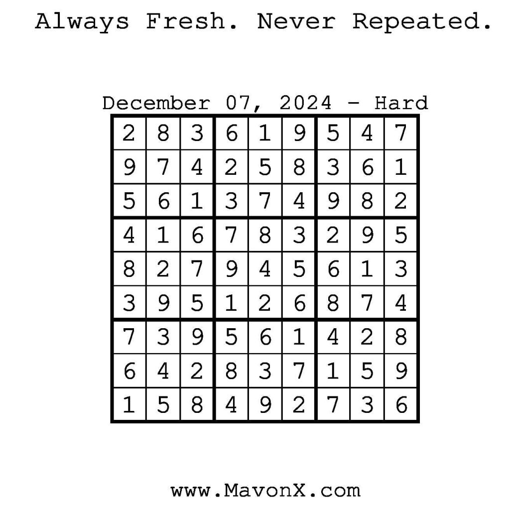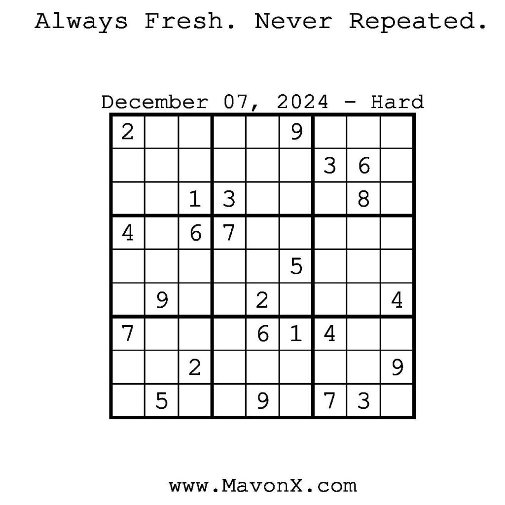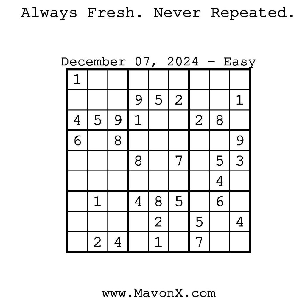Puzzles of the Day – December 7, 2024 Post author:admin Post published:December 7, 2024 Post category:Free Stuff / Puzzle of the Day / Puzzle of the Day Solutions / Solutions Post comments:0 Comments Check out our books on Amazon! Check out our books on Barnes and Noble! Check out our books on Etsy! Easy Sudoku Coach Link Medium Sudoku Coach Link Hard Sudoku Coach Link Show Solution You Might Also Like Puzzles of the Day – October 30, 2025 October 29, 2025 Puzzles of the Day – March 28, 2025 March 28, 2025 Puzzles of the Day – April 10, 2025 April 10, 2025 Leave a Reply Cancel replyCommentEnter your name or username to comment Enter your email address to comment Enter your website URL (optional) Save my name, email, and website in this browser for the next time I comment.