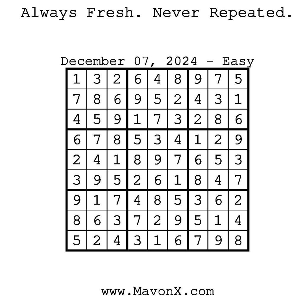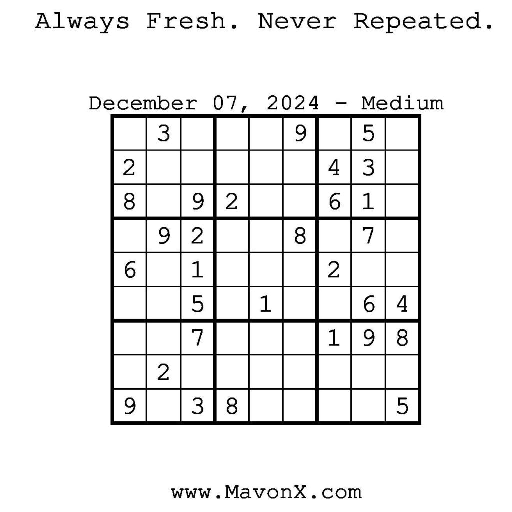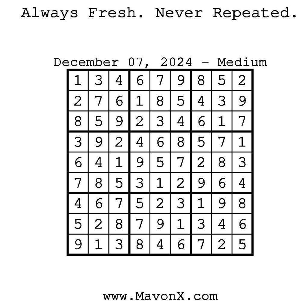 Puzzles of the Day – December 7, 2024 Post author:admin Post published:December 7, 2024 Post category:Free Stuff / Puzzle of the Day / Puzzle of the Day Solutions / Solutions Post comments:0 Comments Check out our books on Amazon! Check out our books on Barnes and Noble! Check out our books on Etsy! Easy Sudoku Coach Link Medium Sudoku Coach Link Hard Sudoku Coach Link Show Solution You Might Also Like Puzzles of the Day – October 30, 2025 October 29, 2025 Puzzles of the Day – March 28, 2025 March 28, 2025 Puzzles of the Day – April 10, 2025 April 10, 2025 Leave a Reply Cancel replyCommentEnter your name or username to comment Enter your email address to comment Enter your website URL (optional) Save my name, email, and website in this browser for the next time I comment.