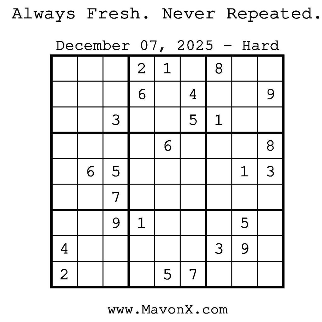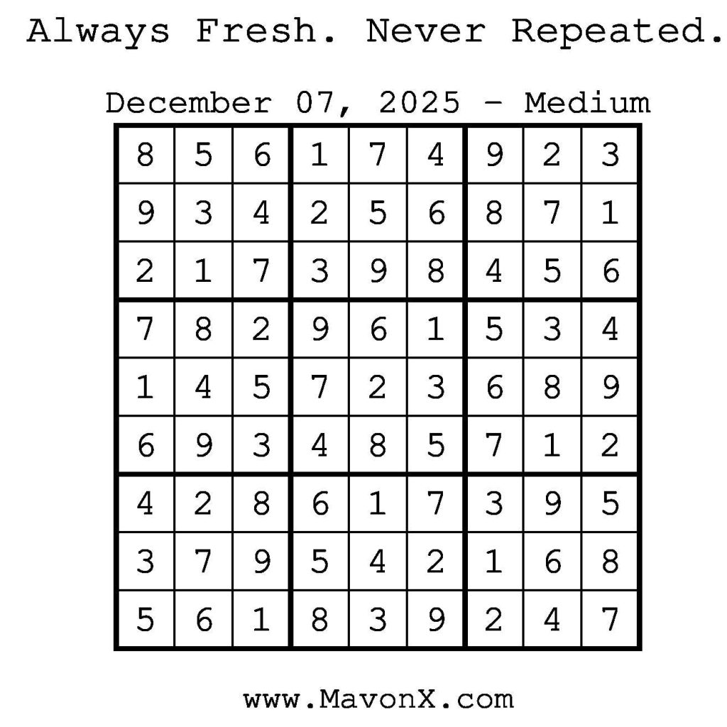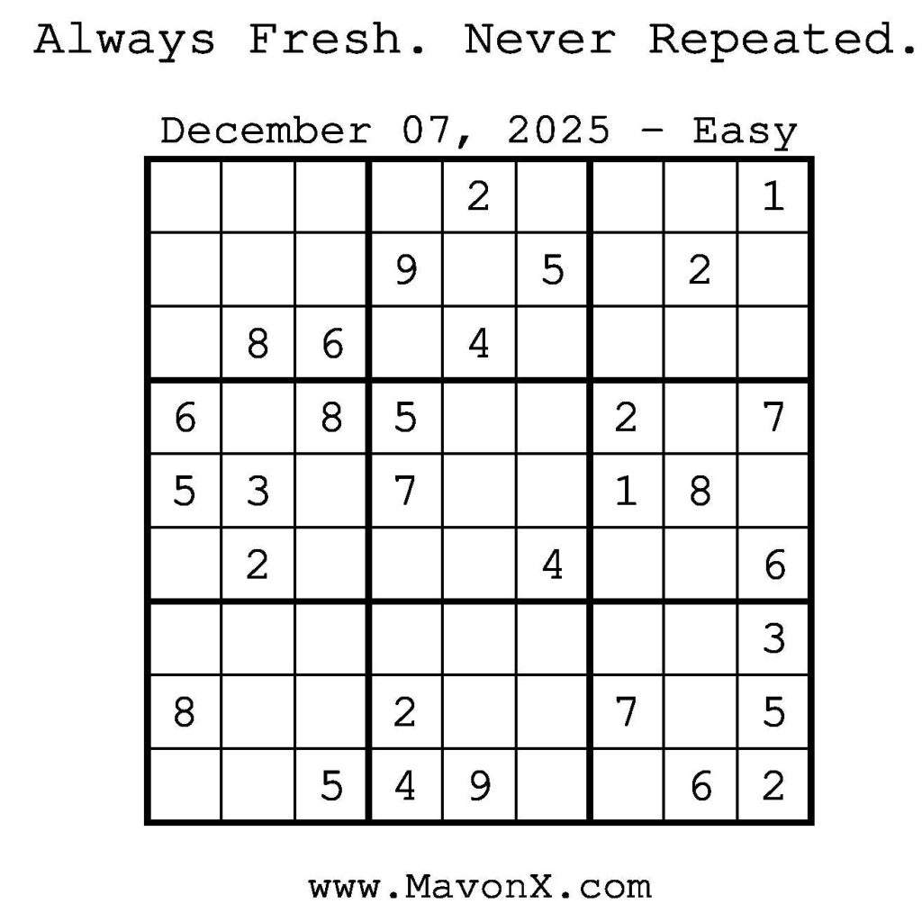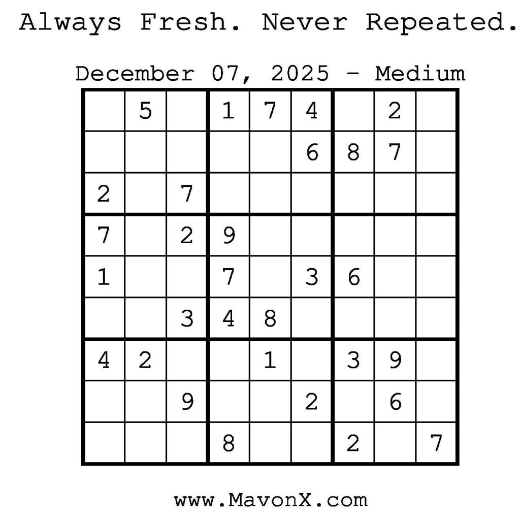 Puzzles of the Day – December 07, 2025 Post author:admin Post published:December 7, 2025 Post category:Free Stuff / Puzzle of the Day / Puzzle of the Day Solutions / Solutions Post comments:0 Comments Check out our books on Amazon! Check out our books on Barnes and Noble! Check out our books on Etsy! Easy Sudoku Coach Link Medium Sudoku Coach Link Hard Sudoku Coach Link Show Solution You Might Also Like Puzzles of the Day – December 14, 2025 December 14, 2025 Puzzles of the Day – February 4, 2025 February 3, 2025 Puzzles of the Day – August 26, 2024 August 26, 2024 Leave a Reply Cancel replyCommentEnter your name or username to comment Enter your email address to comment Enter your website URL (optional) Save my name, email, and website in this browser for the next time I comment.