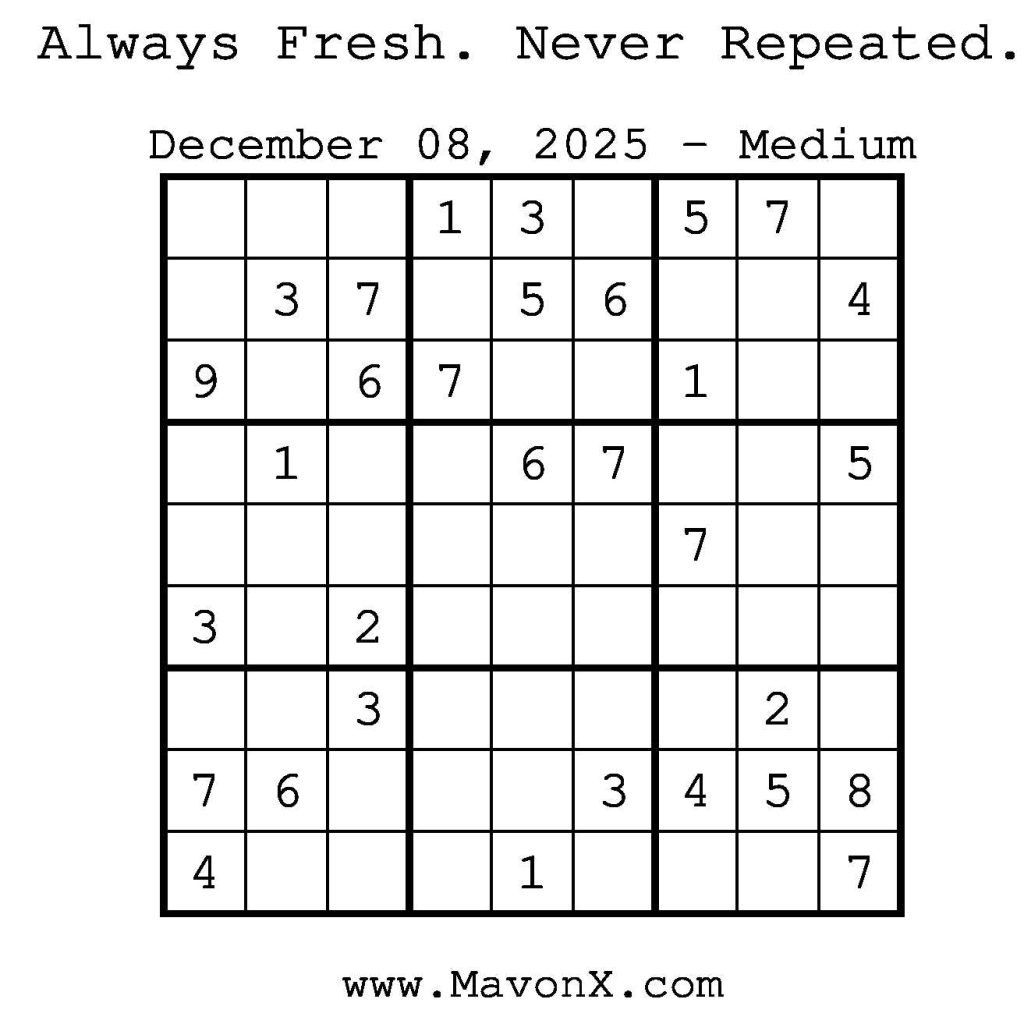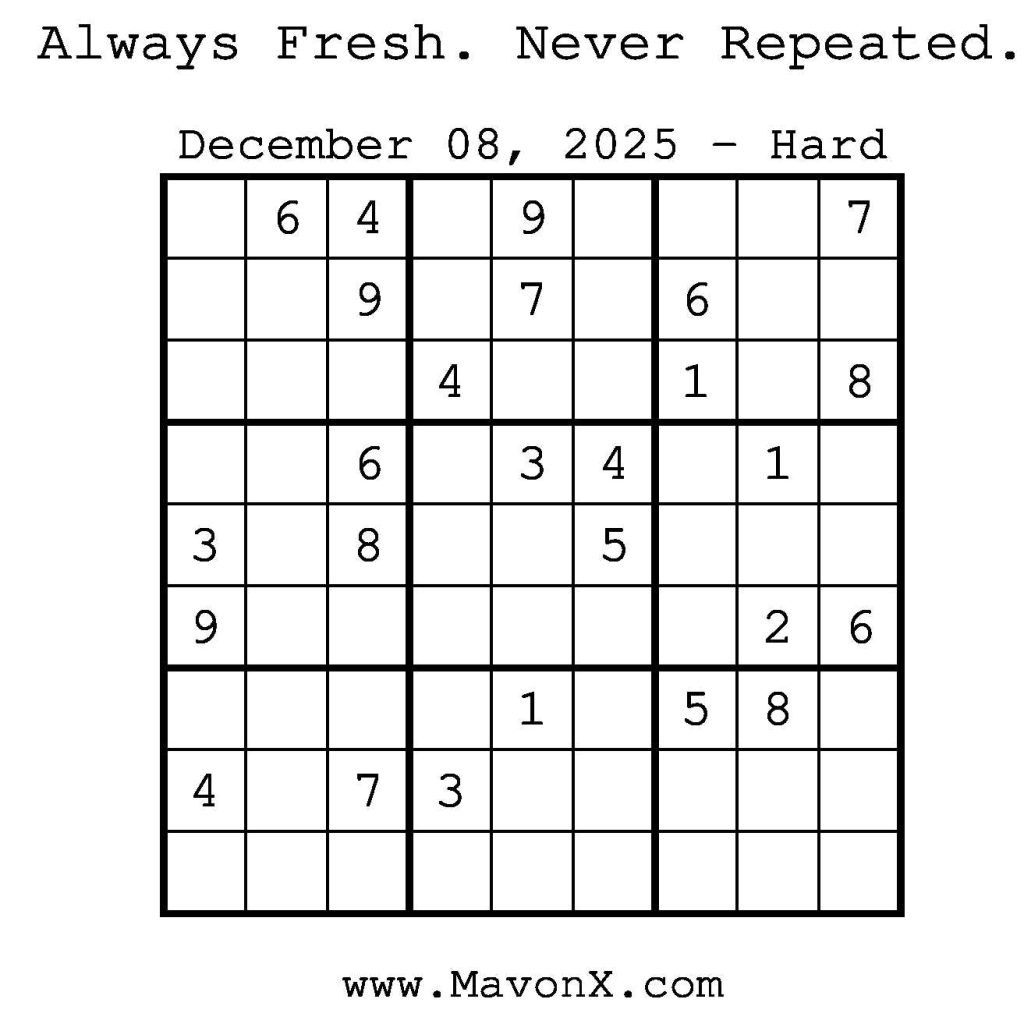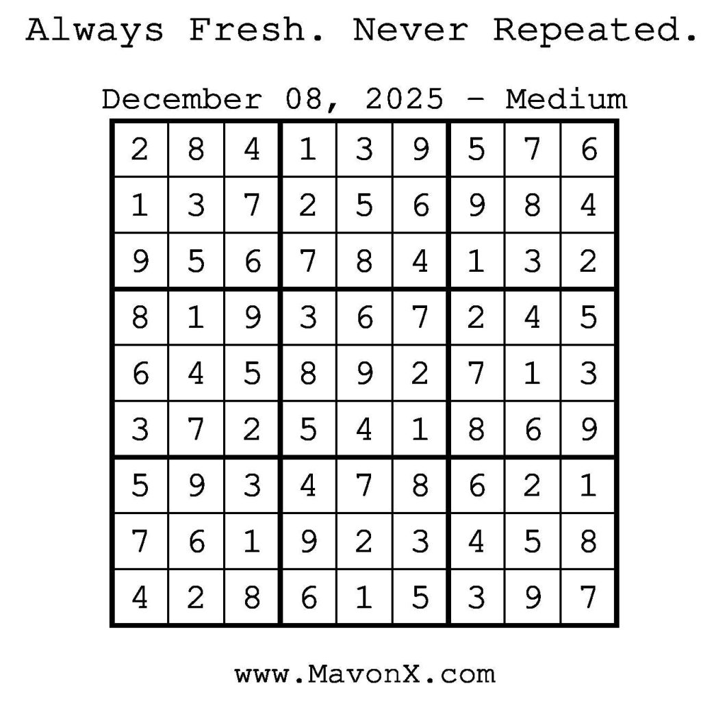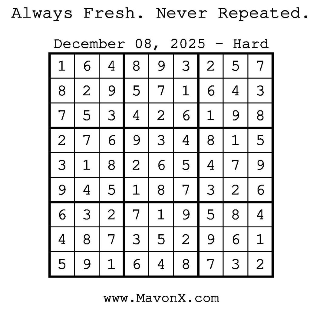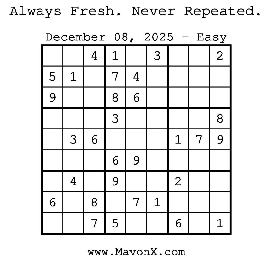 Puzzles of the Day – December 08, 2025 Post author:admin Post published:December 7, 2025 Post category:Free Stuff / Puzzle of the Day / Puzzle of the Day Solutions / Solutions Post comments:0 Comments Check out our books on Amazon! Check out our books on Barnes and Noble! Check out our books on Etsy! Easy Sudoku Coach Link Medium Sudoku Coach Link Hard Sudoku Coach Link Show Solution You Might Also Like Puzzles of the Day – April 20, 2025 April 19, 2025 Puzzles of the Day – January 19, 2025 January 21, 2025 Puzzles of the Day – March 15, 2025 March 17, 2025 Leave a Reply Cancel replyCommentEnter your name or username to comment Enter your email address to comment Enter your website URL (optional) Save my name, email, and website in this browser for the next time I comment.