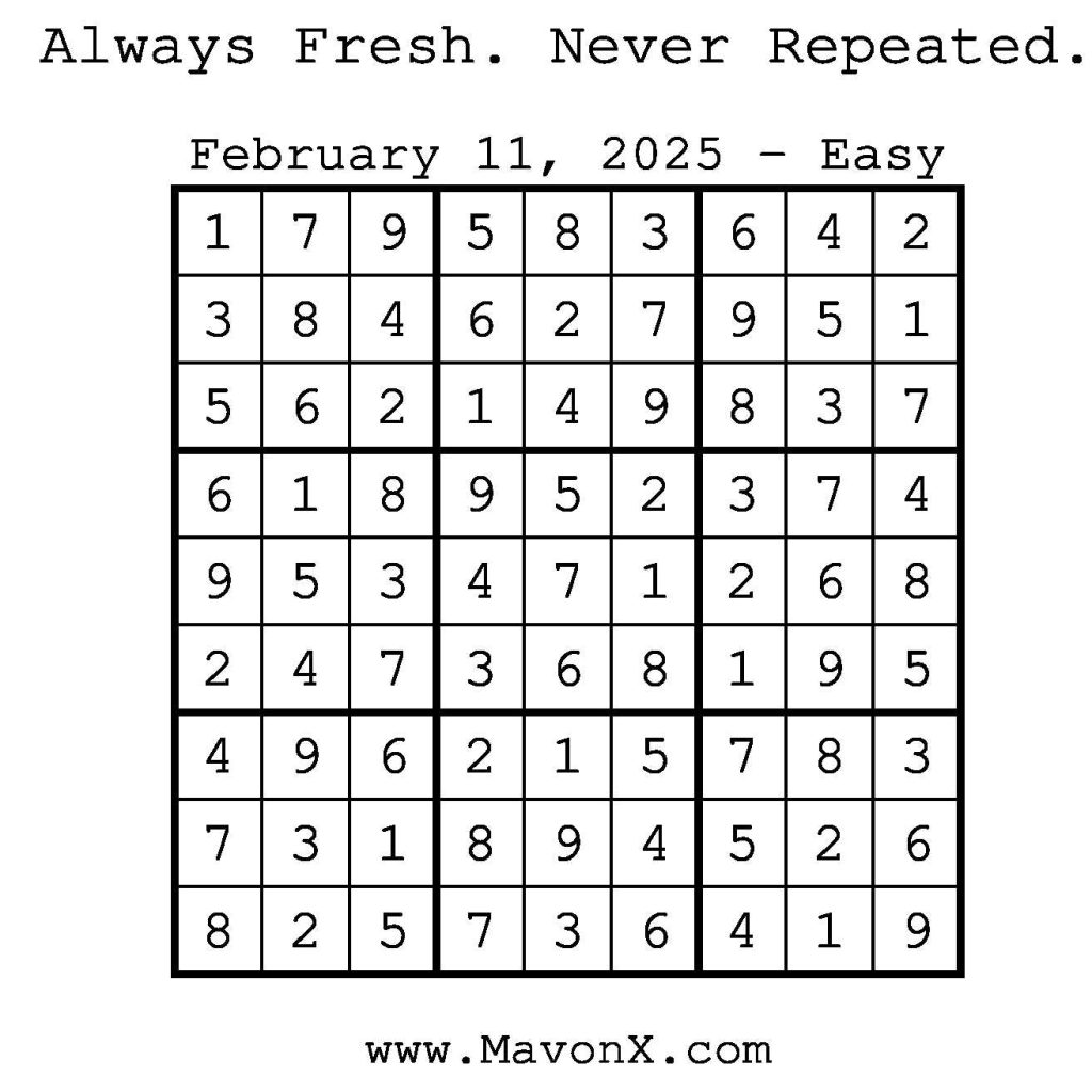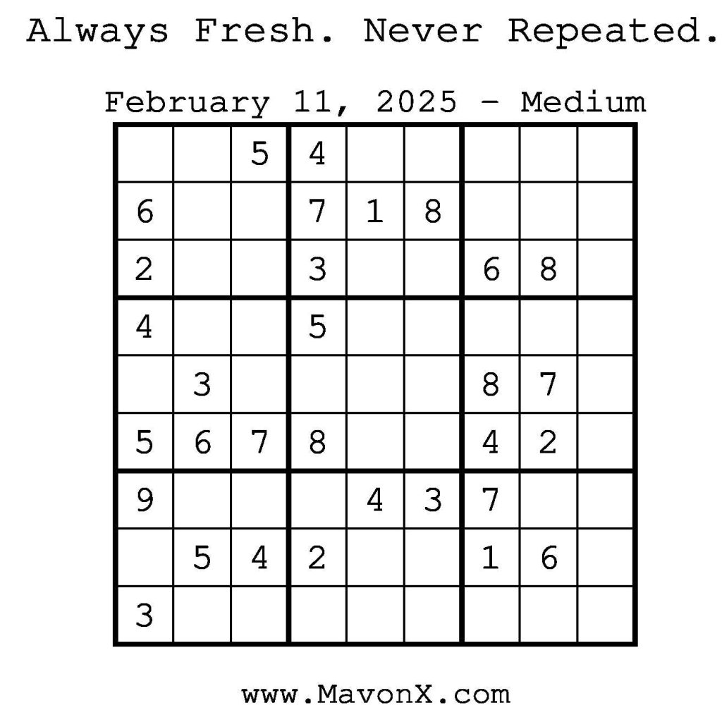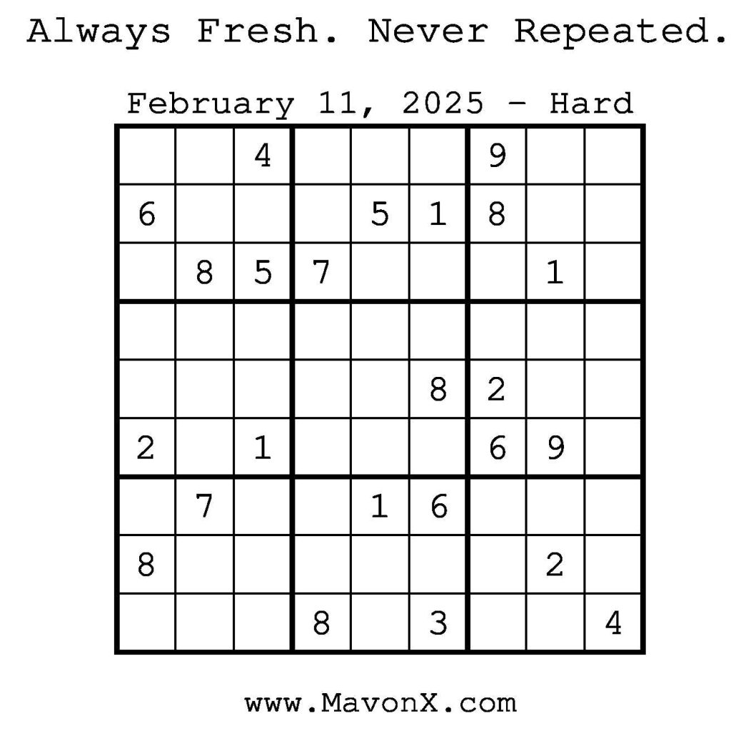 Puzzles of the Day – February 11, 2025 Post author:admin Post published:February 12, 2025 Post category:Free Stuff / Puzzle of the Day / Puzzle of the Day Solutions / Solutions Post comments:0 Comments Check out our books on Amazon! Check out our books on Barnes and Noble! Check out our books on Etsy! Easy Sudoku Coach Link Medium Sudoku Coach Link Hard Sudoku Coach Link Show Solution You Might Also Like Puzzles of the Day – December 13, 2025 December 12, 2025 Puzzles of the Day – June 29, 2025 July 1, 2025 Puzzles of the Day – December 13, 2024 December 12, 2024 Leave a Reply Cancel replyCommentEnter your name or username to comment Enter your email address to comment Enter your website URL (optional) Save my name, email, and website in this browser for the next time I comment.