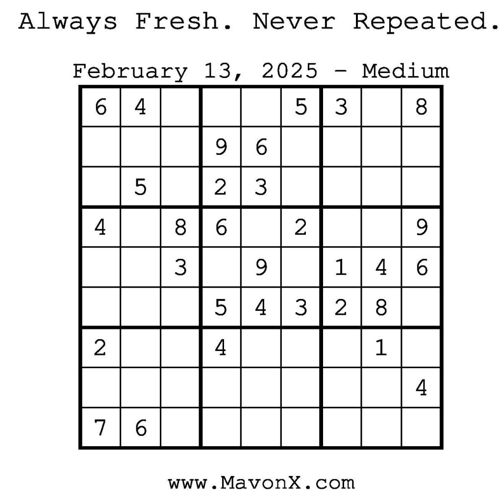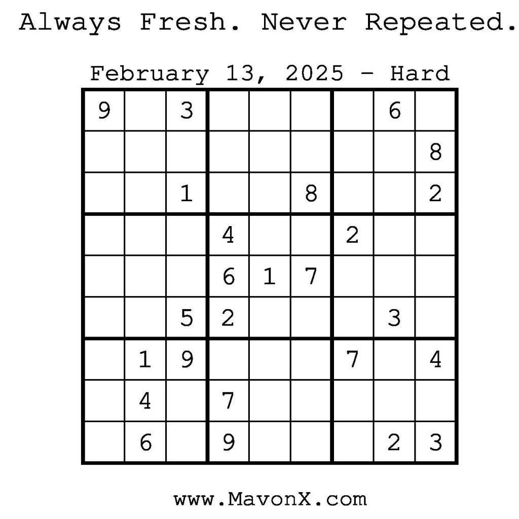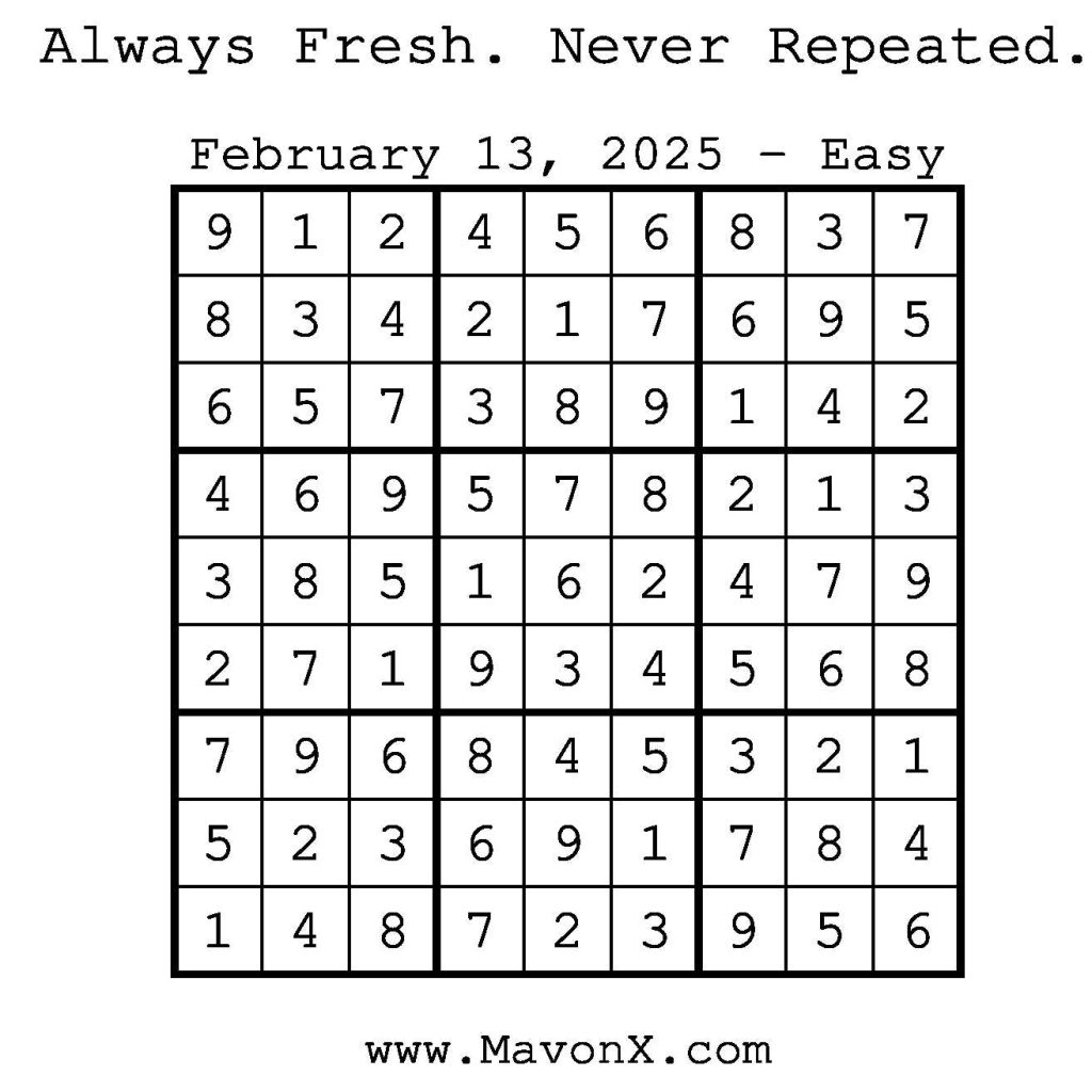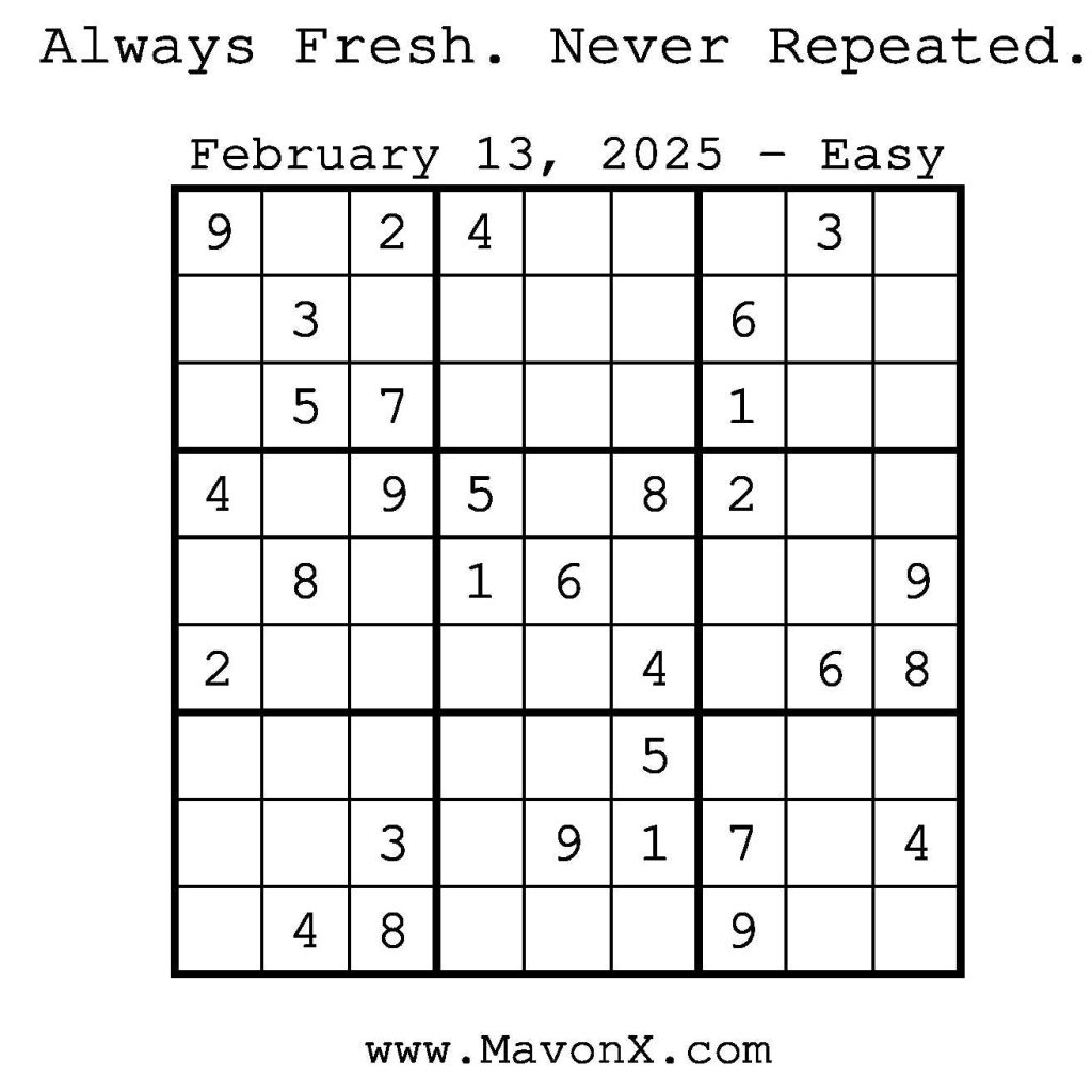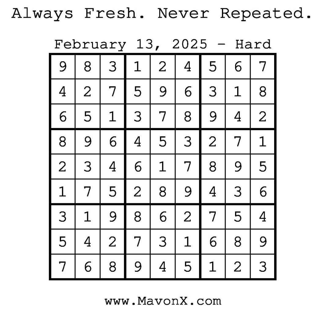 Puzzles of the Day – February 13, 2025 Post author:admin Post published:February 13, 2025 Post category:Free Stuff / Puzzle of the Day / Puzzle of the Day Solutions / Solutions Post comments:0 Comments Check out our books on Amazon! Check out our books on Barnes and Noble! Check out our books on Etsy! Easy Sudoku Coach Link Medium Sudoku Coach Link Hard Sudoku Coach Link Show Solution You Might Also Like Puzzle of the Day – July 26, 2024 July 26, 2024 Puzzles of the Day – July 28, 2025 July 28, 2025 Puzzles of the Day – August 13, 2024 August 13, 2024 Leave a Reply Cancel replyCommentEnter your name or username to comment Enter your email address to comment Enter your website URL (optional) Save my name, email, and website in this browser for the next time I comment.