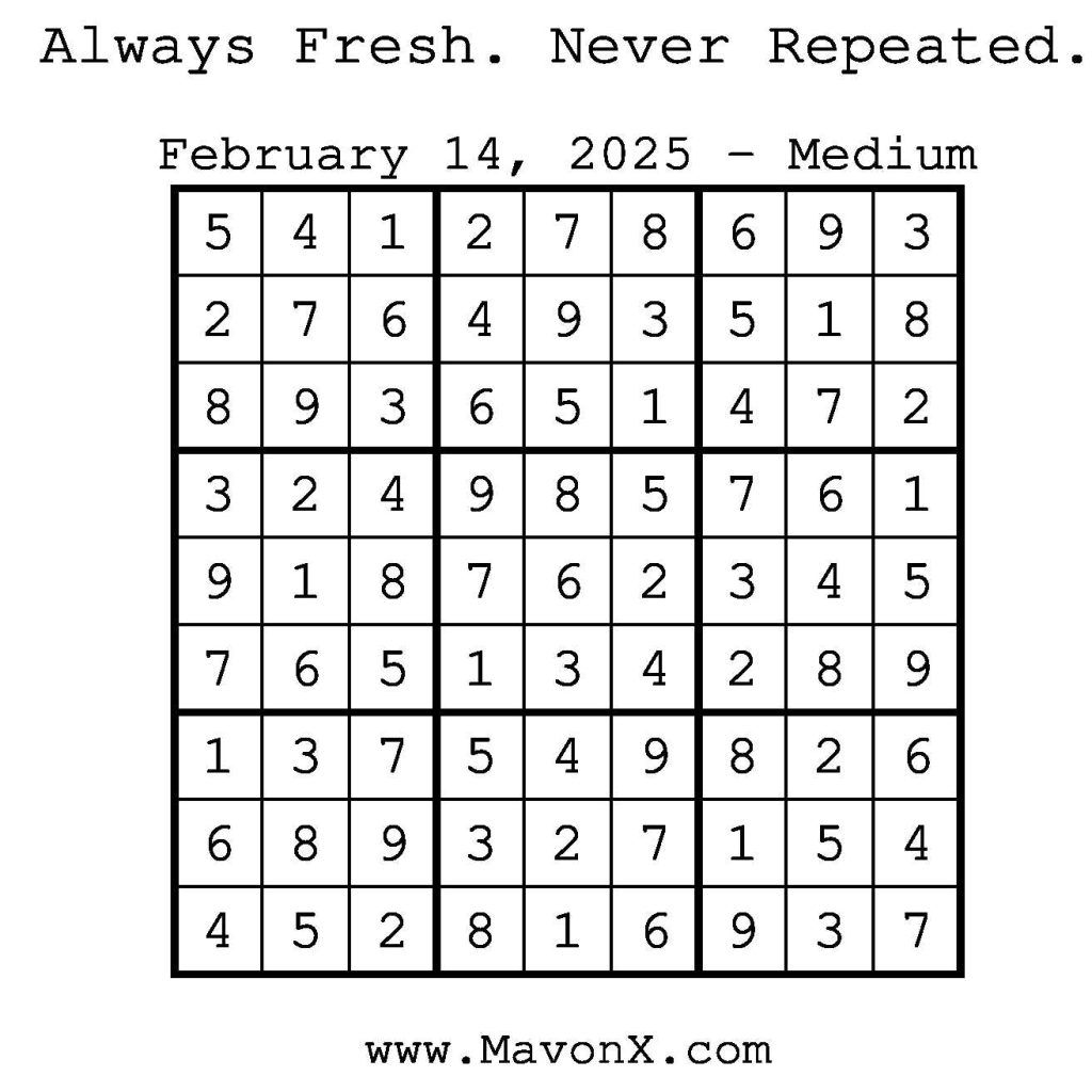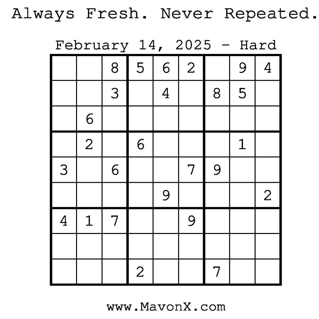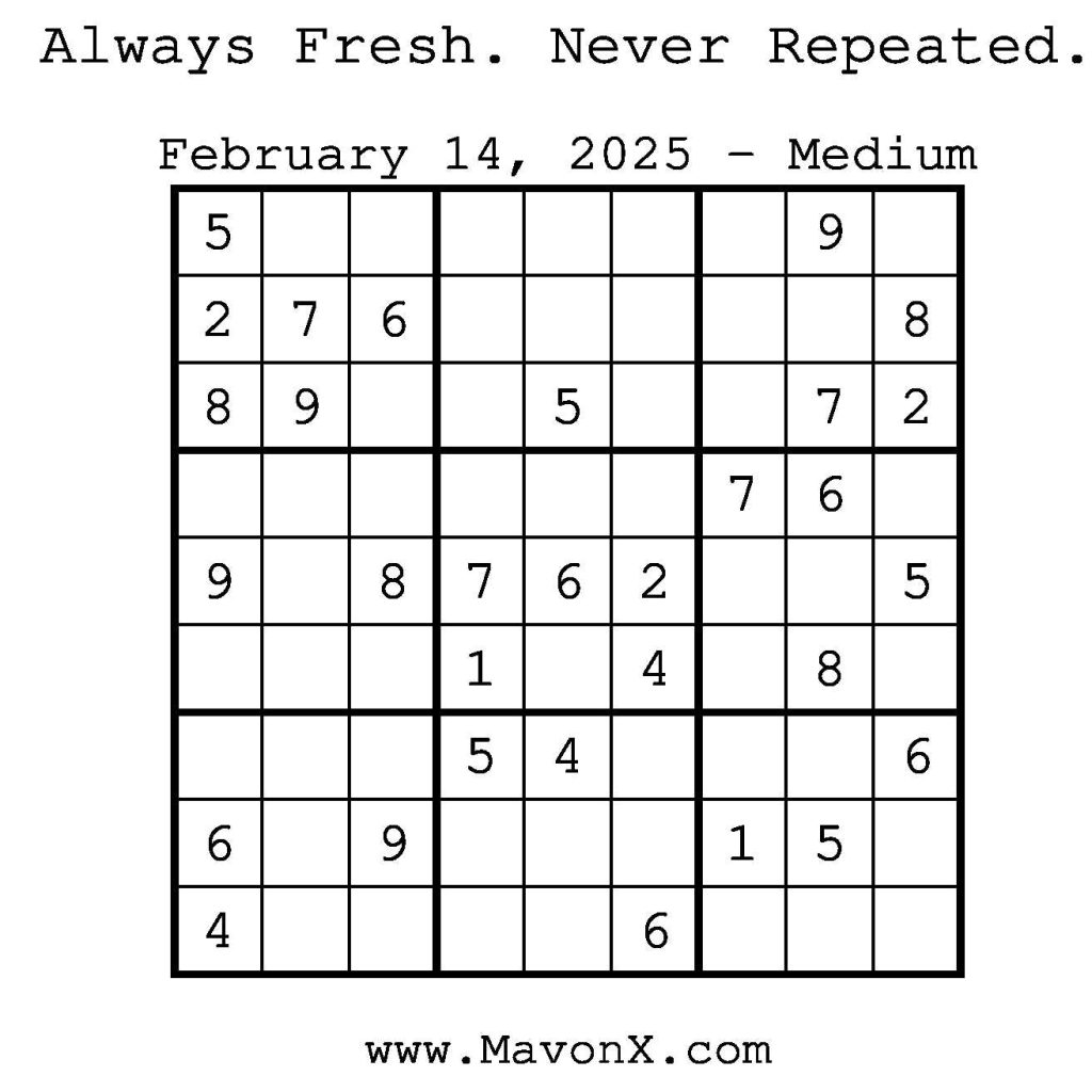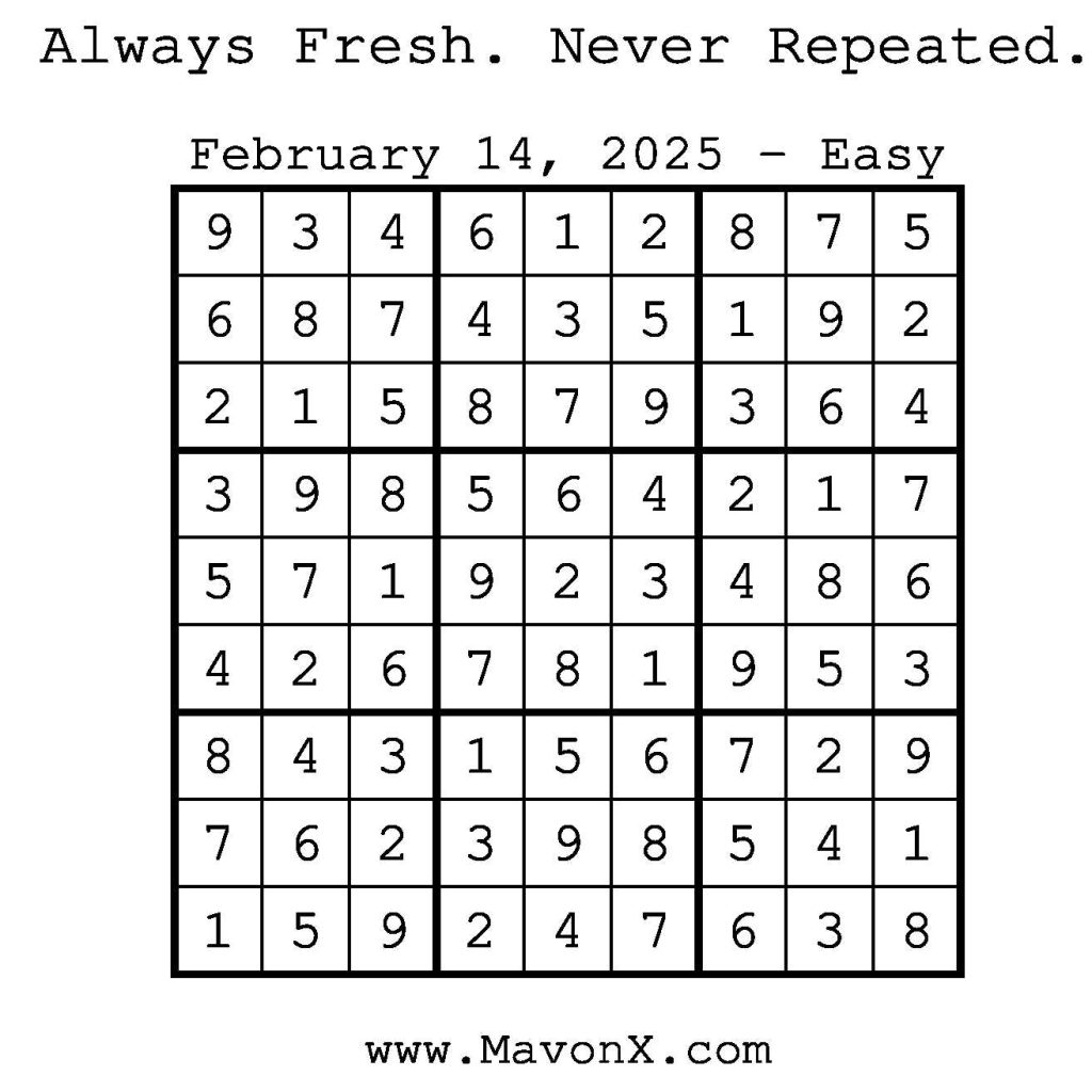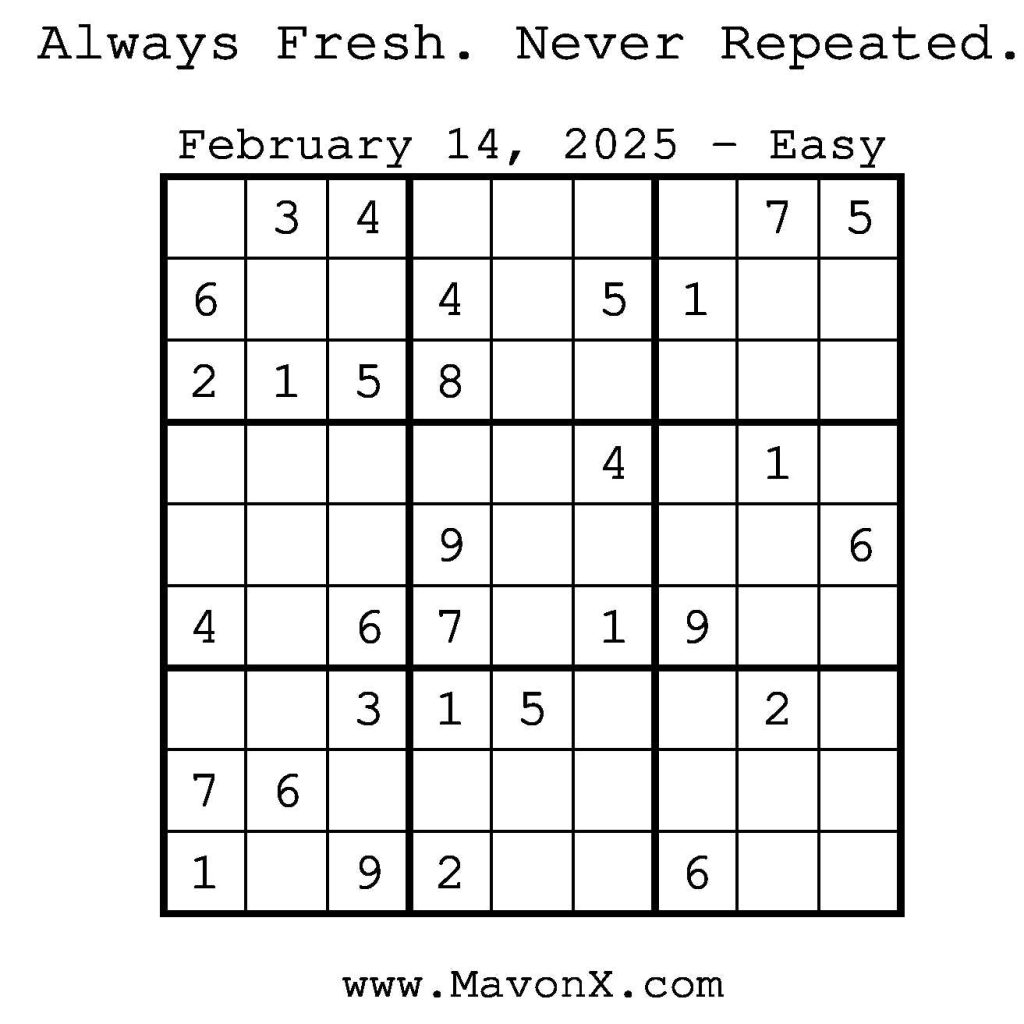 Puzzles of the Day – February 14, 2025 Post author:admin Post published:February 14, 2025 Post category:Free Stuff / Puzzle of the Day / Puzzle of the Day Solutions / Solutions Post comments:0 Comments Check out our books on Amazon! Check out our books on Barnes and Noble! Check out our books on Etsy! Easy Sudoku Coach Link Medium Sudoku Coach Link Hard Sudoku Coach Link Show Solution You Might Also Like Puzzles of the Day – December 18, 2025 December 18, 2025 Puzzles of the Day – November 9, 2024 November 8, 2024 Puzzles of the Day – September 14, 2024 September 14, 2024 Leave a Reply Cancel replyCommentEnter your name or username to comment Enter your email address to comment Enter your website URL (optional) Save my name, email, and website in this browser for the next time I comment.