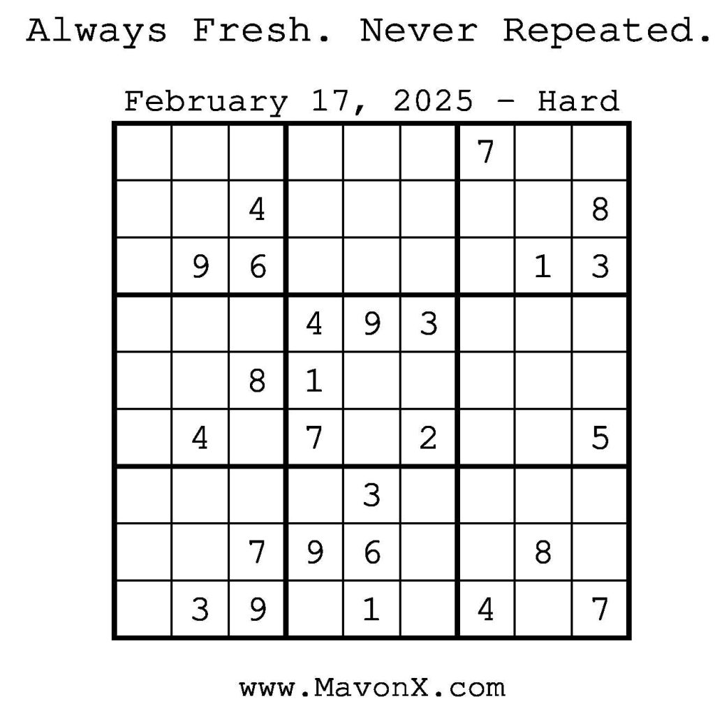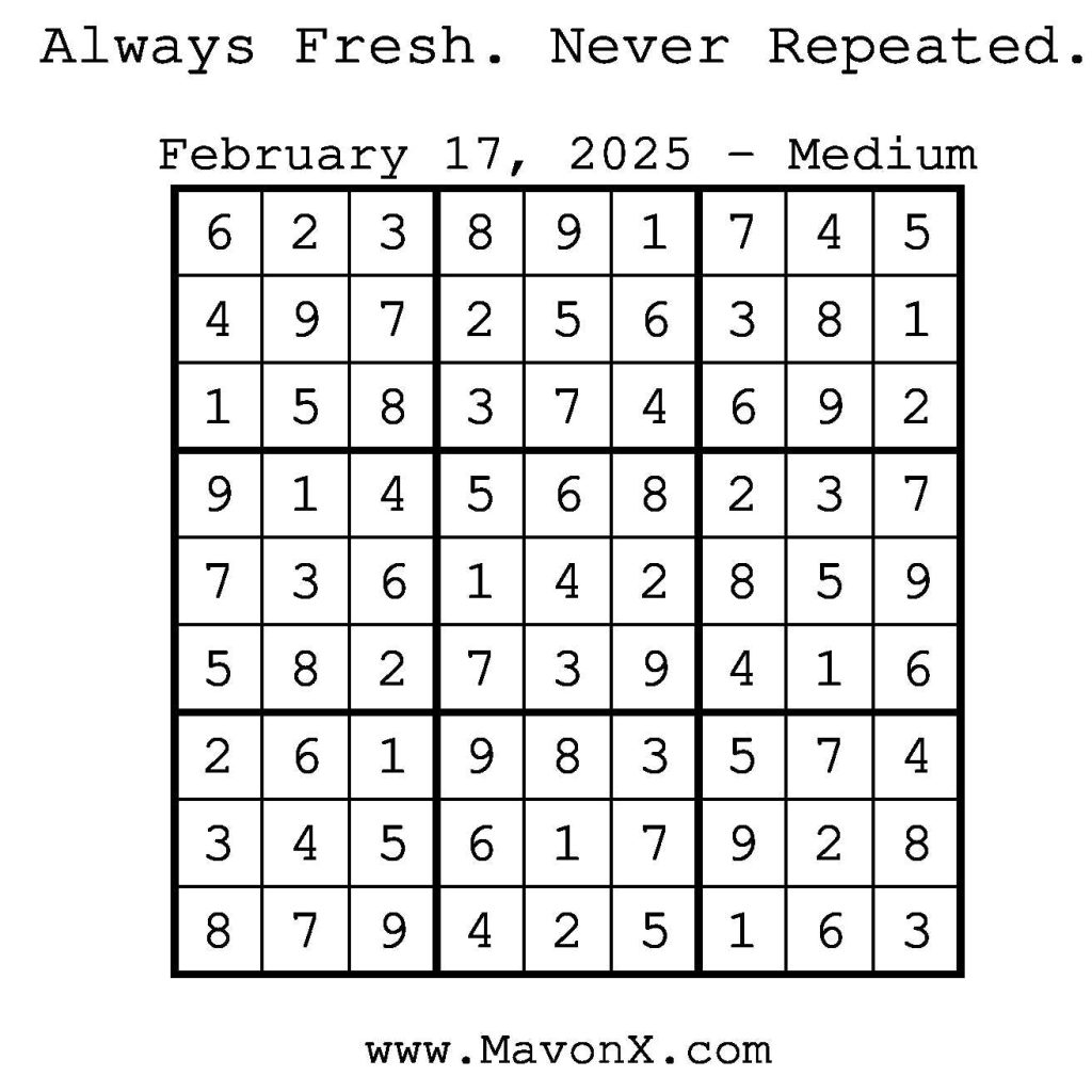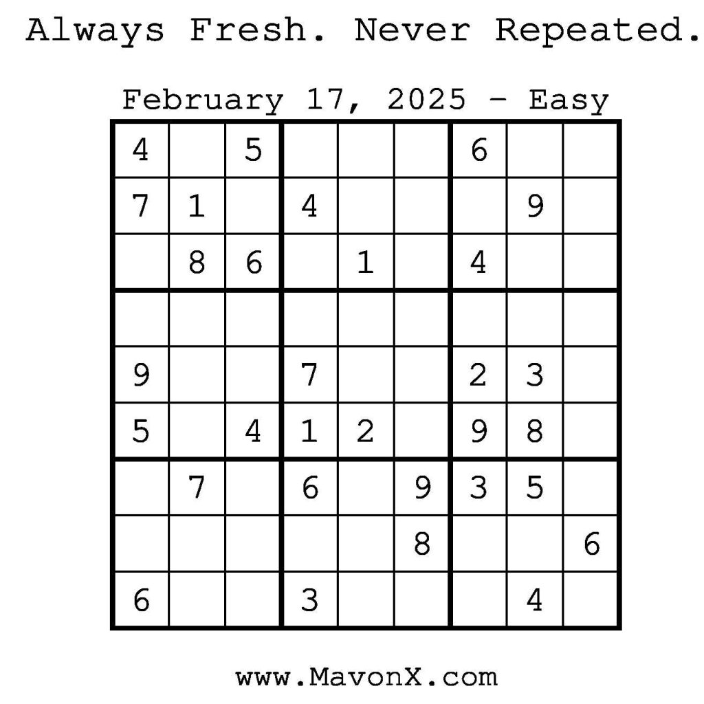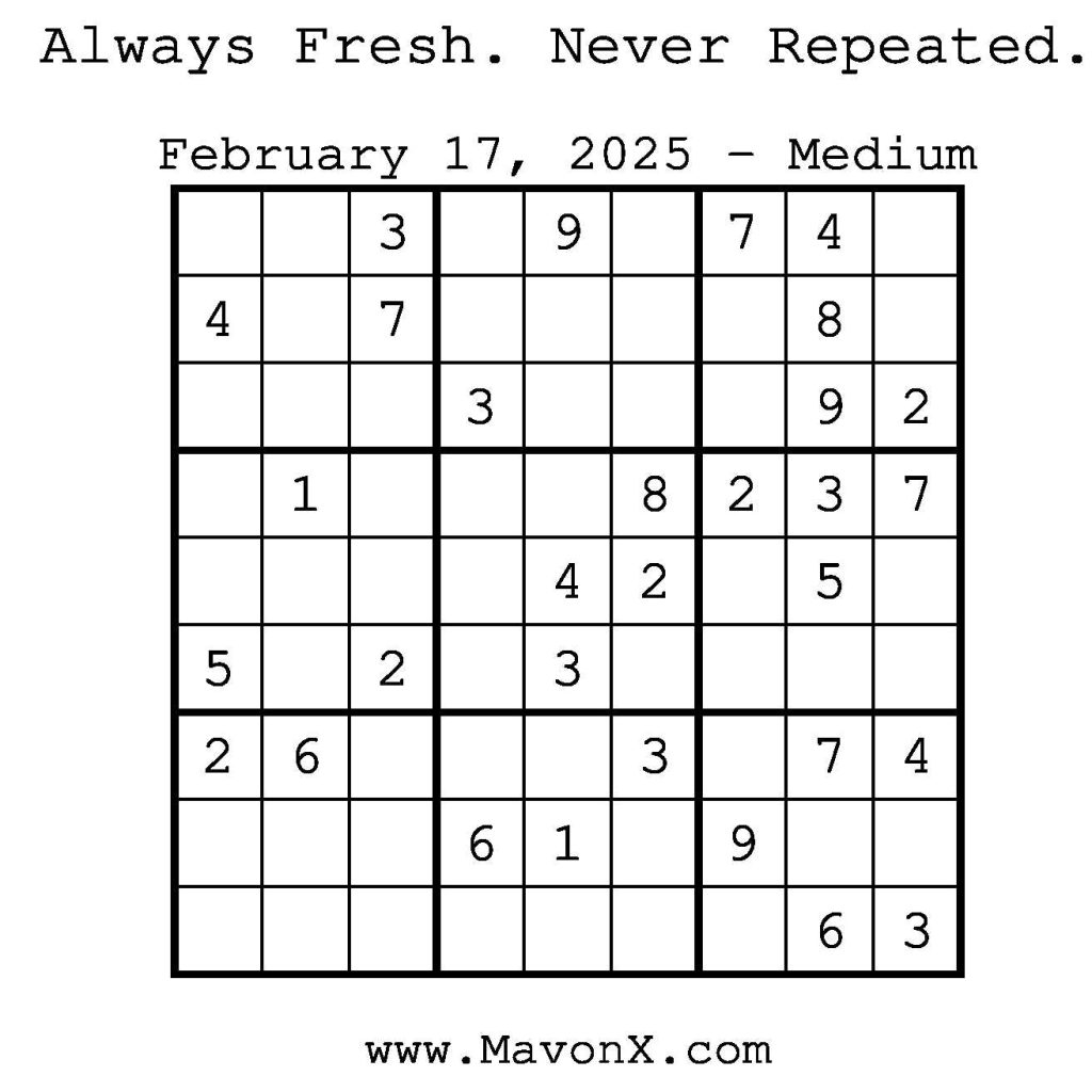 Puzzles of the Day – February 17, 2025 Post author:admin Post published:February 16, 2025 Post category:Free Stuff / Puzzle of the Day / Puzzle of the Day Solutions / Solutions Post comments:0 Comments Check out our books on Amazon! Check out our books on Barnes and Noble! Check out our books on Etsy! Easy Sudoku Coach Link Medium Sudoku Coach Link Hard Sudoku Coach Link Show Solution You Might Also Like Puzzles of the Day – March 6, 2025 March 6, 2025 Puzzles of the Day – October 12, 2024 October 12, 2024 Puzzles of the Day – August 10, 2025 August 9, 2025 Leave a Reply Cancel replyCommentEnter your name or username to comment Enter your email address to comment Enter your website URL (optional) Save my name, email, and website in this browser for the next time I comment.