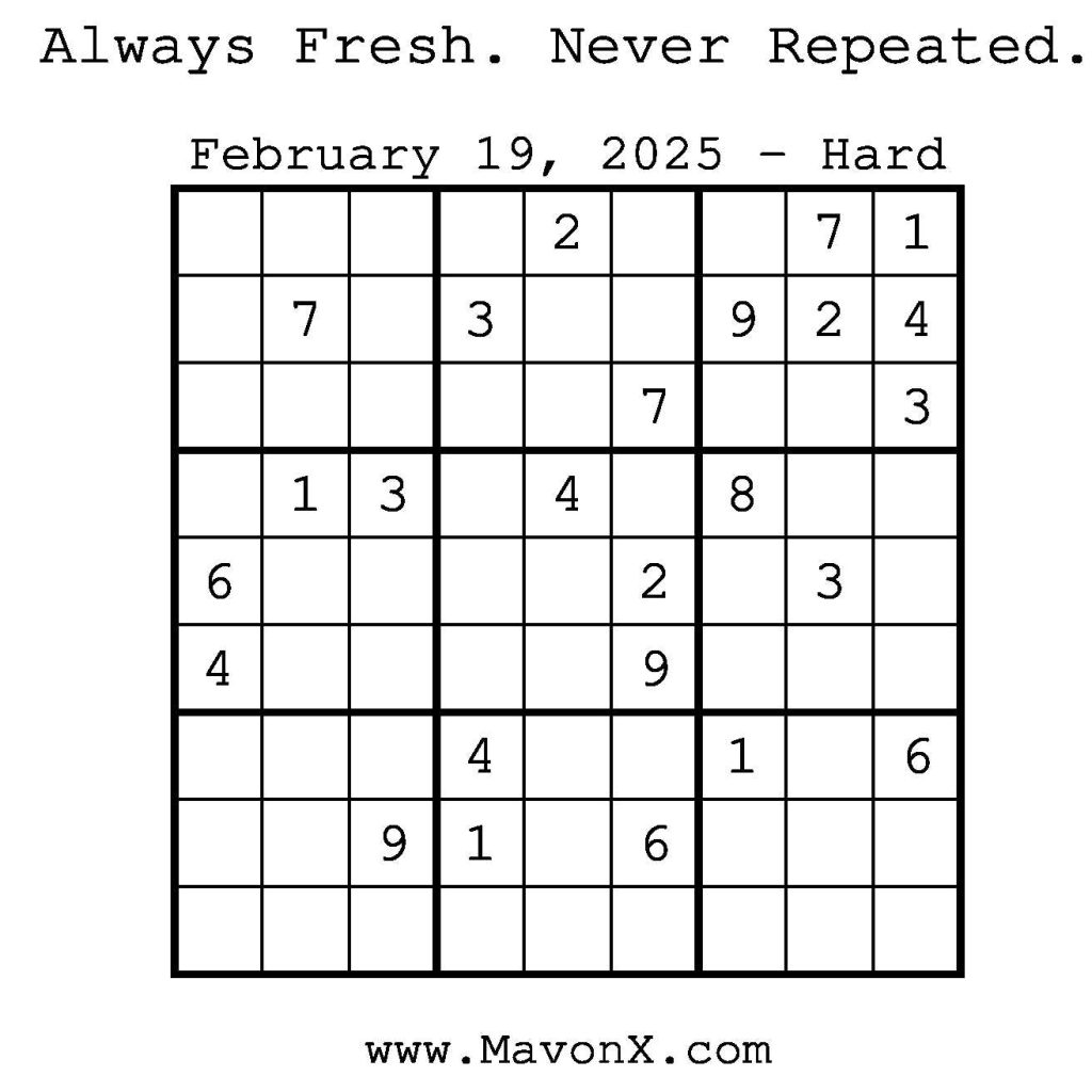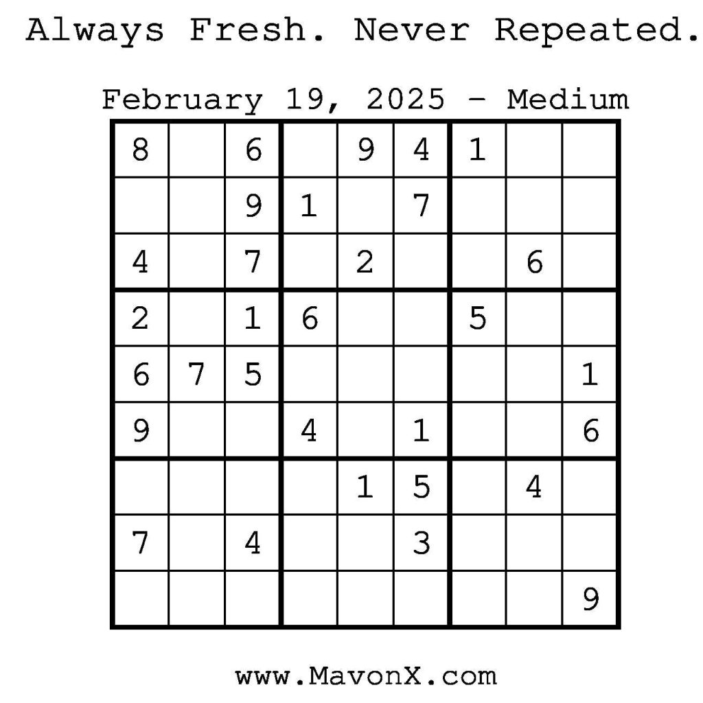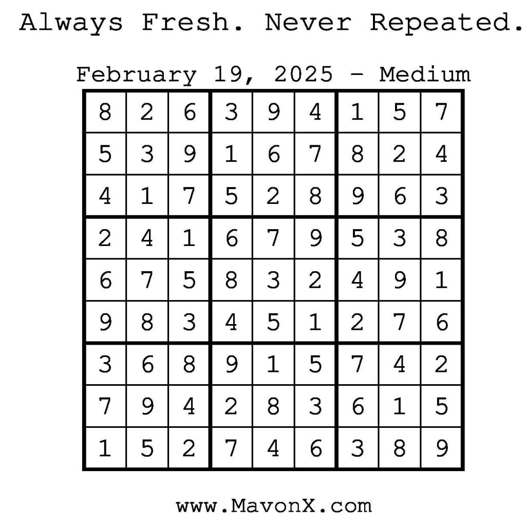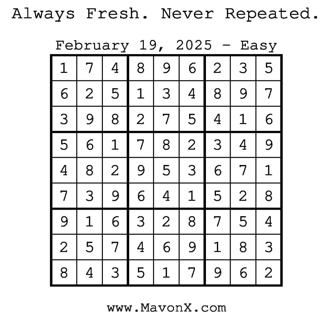 Puzzles of the Day – February 19, 2025 Post author:admin Post published:February 18, 2025 Post category:Free Stuff / Puzzle of the Day / Puzzle of the Day Solutions / Solutions Post comments:0 Comments Check out our books on Amazon! Check out our books on Barnes and Noble! Check out our books on Etsy! Easy Sudoku Coach Link Medium Sudoku Coach Link Hard Sudoku Coach Link Show Solution You Might Also Like Puzzles of the Day – April 20, 2025 April 19, 2025 Puzzles of the Day – March 1, 2025 March 1, 2025 Puzzles of the Day – April 13, 2025 April 12, 2025 Leave a Reply Cancel replyCommentEnter your name or username to comment Enter your email address to comment Enter your website URL (optional) Save my name, email, and website in this browser for the next time I comment.