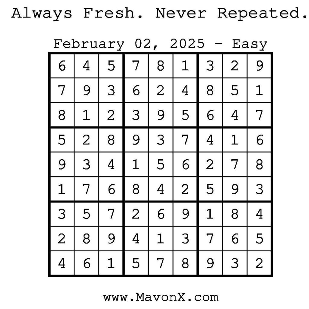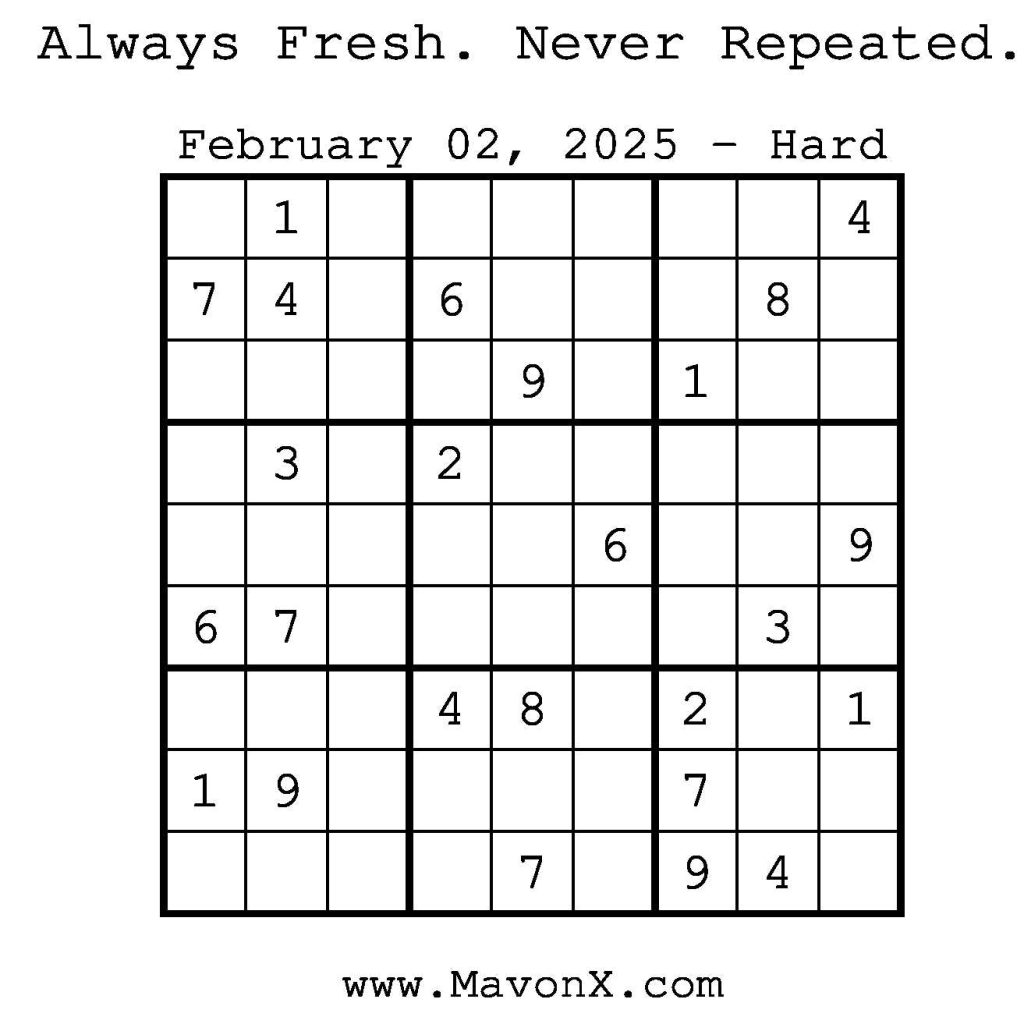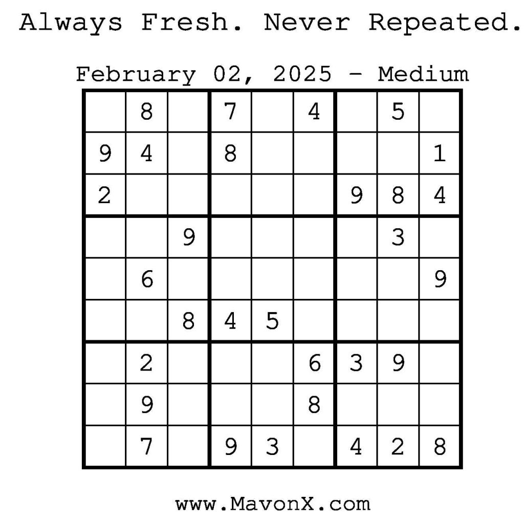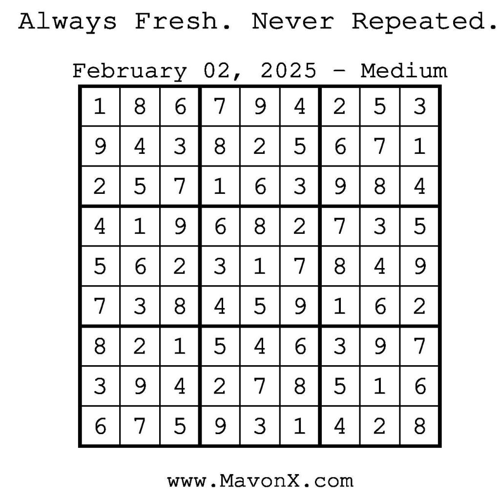 Puzzles of the Day – February 2, 2025 Post author:admin Post published:February 1, 2025 Post category:Free Stuff / Puzzle of the Day / Puzzle of the Day Solutions / Solutions Post comments:0 Comments Check out our books on Amazon! Check out our books on Barnes and Noble! Check out our books on Etsy! Easy Sudoku Coach Link Medium Sudoku Coach Link Hard Sudoku Coach Link Show Solution You Might Also Like Puzzles of the Day – March 9, 2025 March 8, 2025 Puzzles of the Day – September 21, 2024 September 21, 2024 Puzzles of the Day – March 30, 2025 March 31, 2025 Leave a Reply Cancel replyCommentEnter your name or username to comment Enter your email address to comment Enter your website URL (optional) Save my name, email, and website in this browser for the next time I comment.