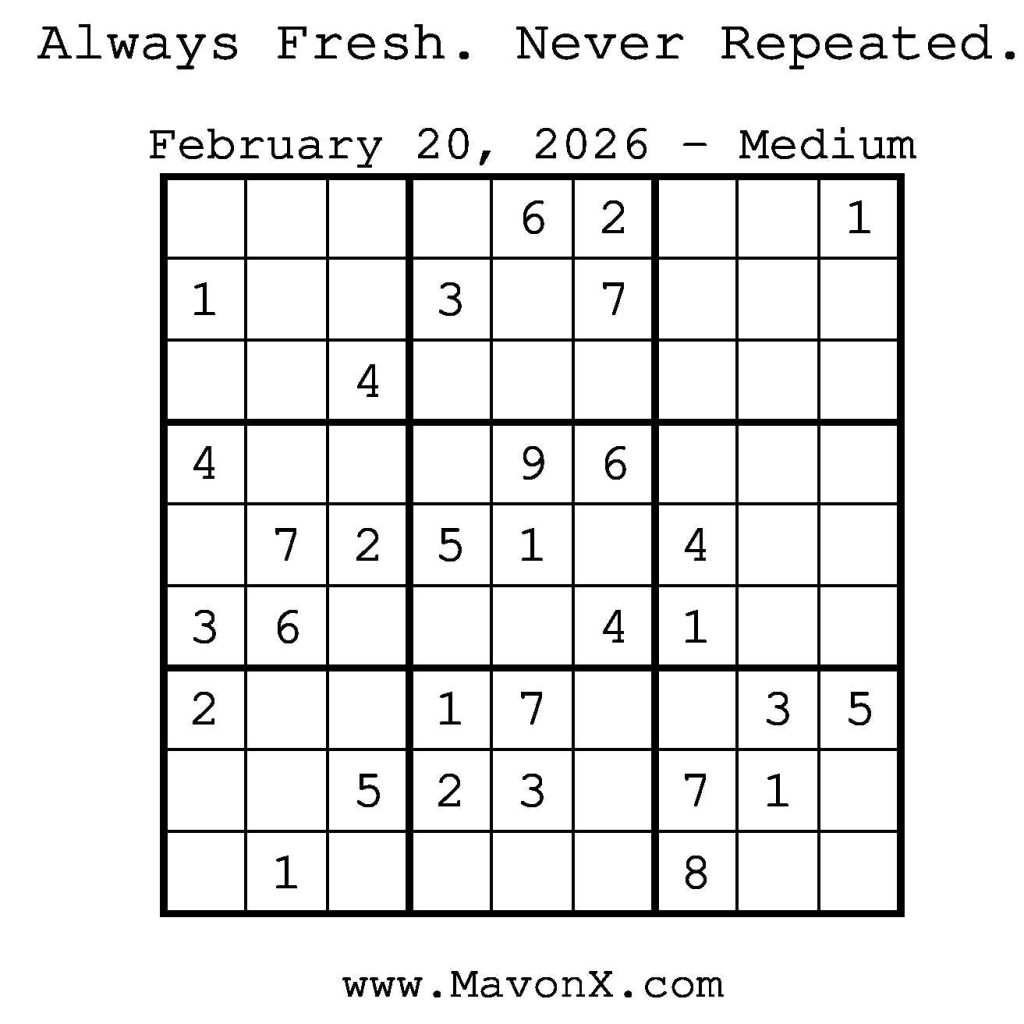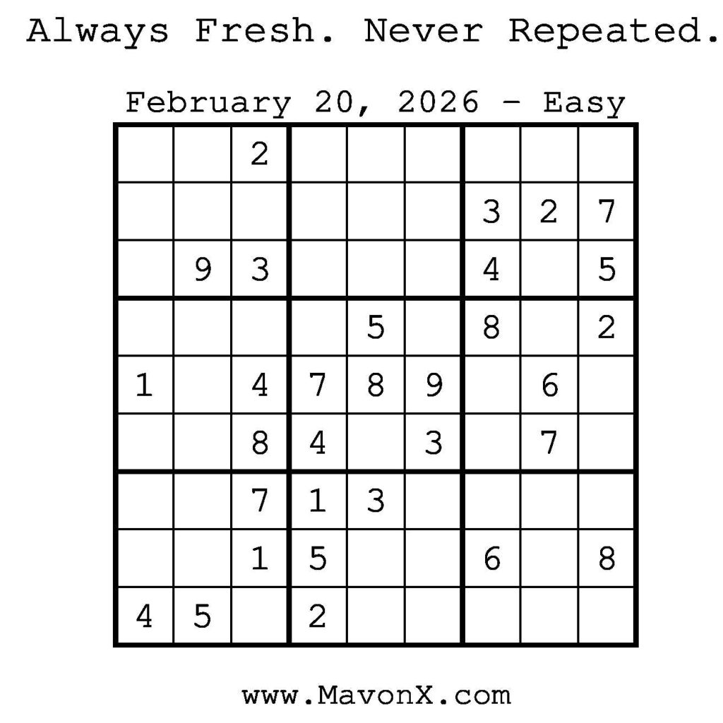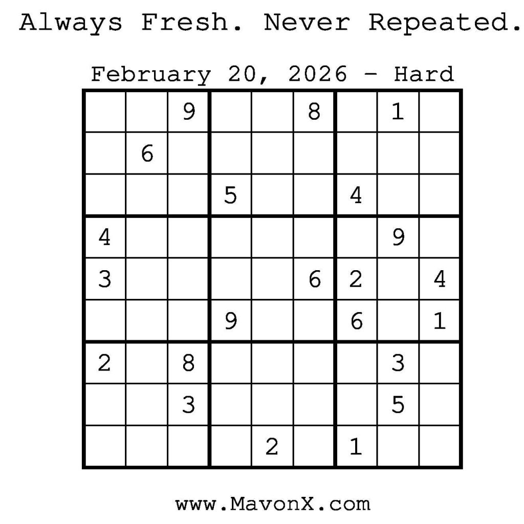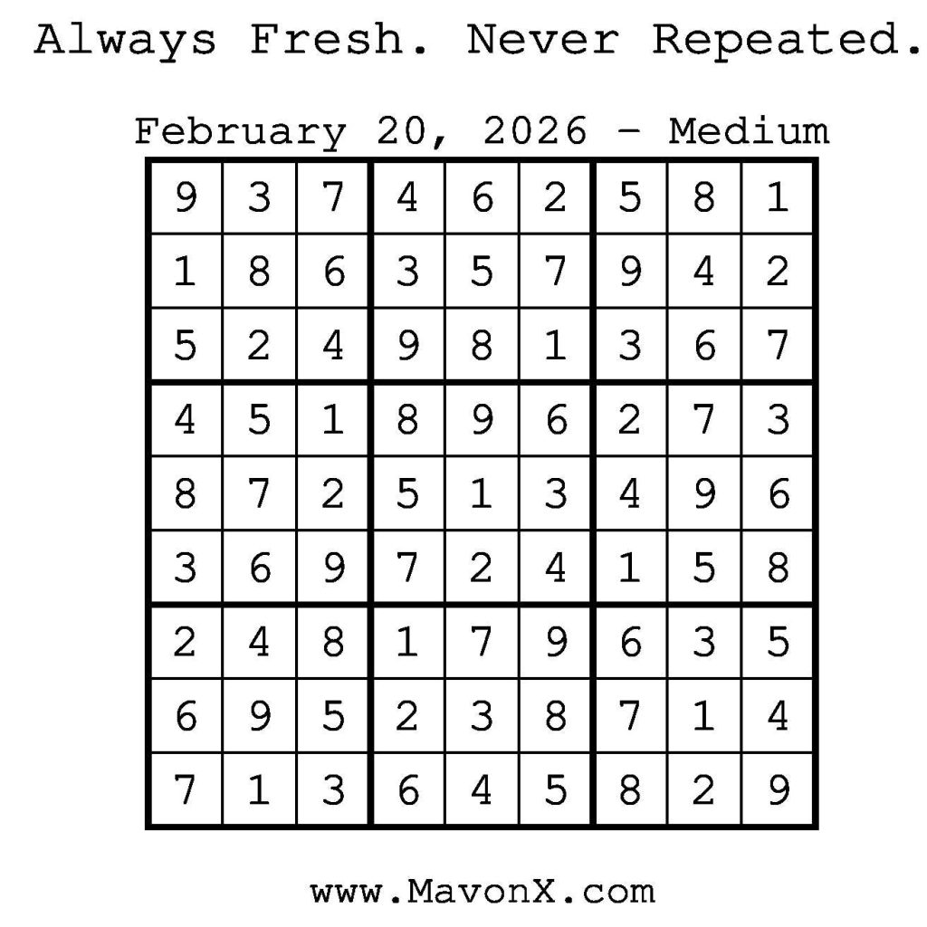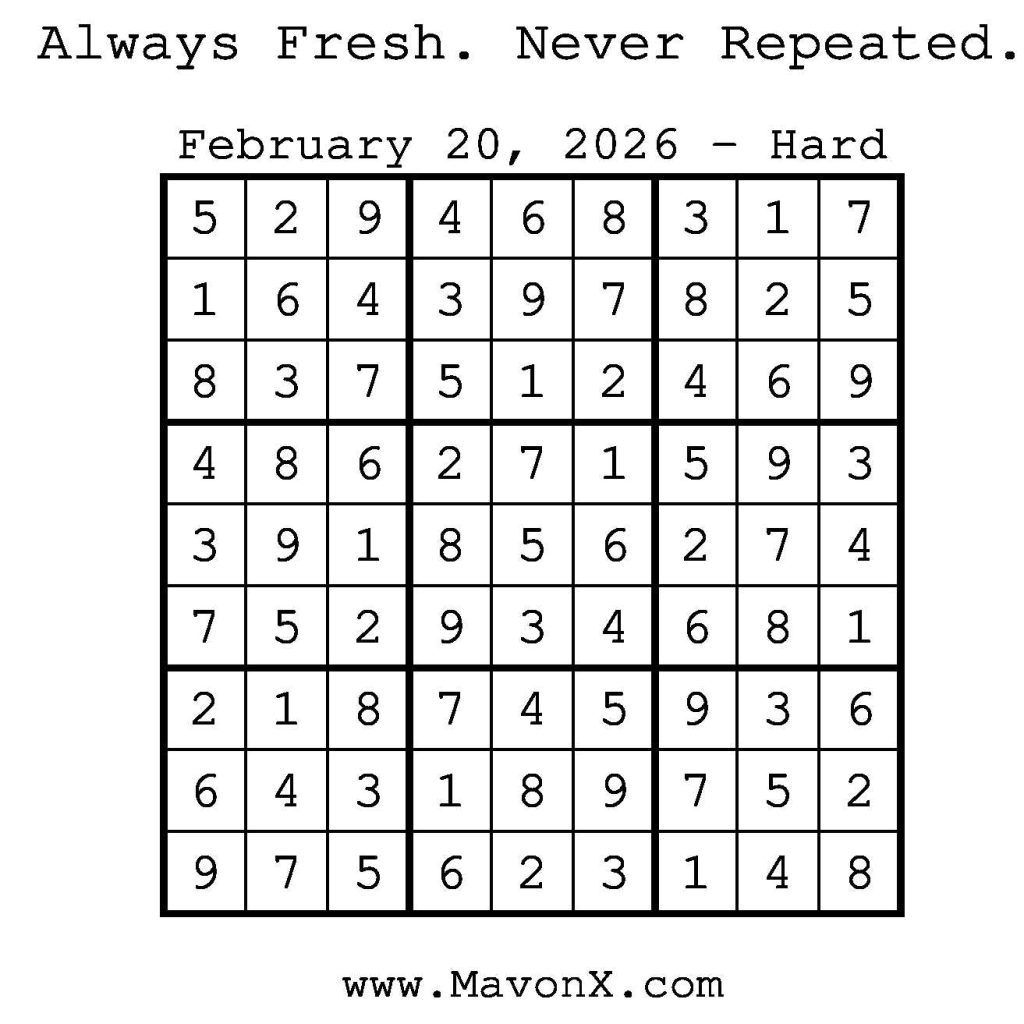 Puzzles of the Day – February 20, 2026 Post author:admin Post published:February 20, 2026 Post category:Free Stuff / Puzzle of the Day / Puzzle of the Day Solutions / Solutions Post comments:0 Comments Check out our books on Amazon! Check out our books on Barnes and Noble! Check out our books on Etsy! Easy Sudoku Coach Link Medium Sudoku Coach Link Hard Sudoku Coach Link Show Solution You Might Also Like Puzzles of the Day – October 4, 2024 October 4, 2024 Puzzles of the Day – February 10, 2025 February 12, 2025 Puzzles of the Day – July 5, 2025 July 5, 2025 Leave a Reply Cancel replyCommentEnter your name or username to comment Enter your email address to comment Enter your website URL (optional) Save my name, email, and website in this browser for the next time I comment.