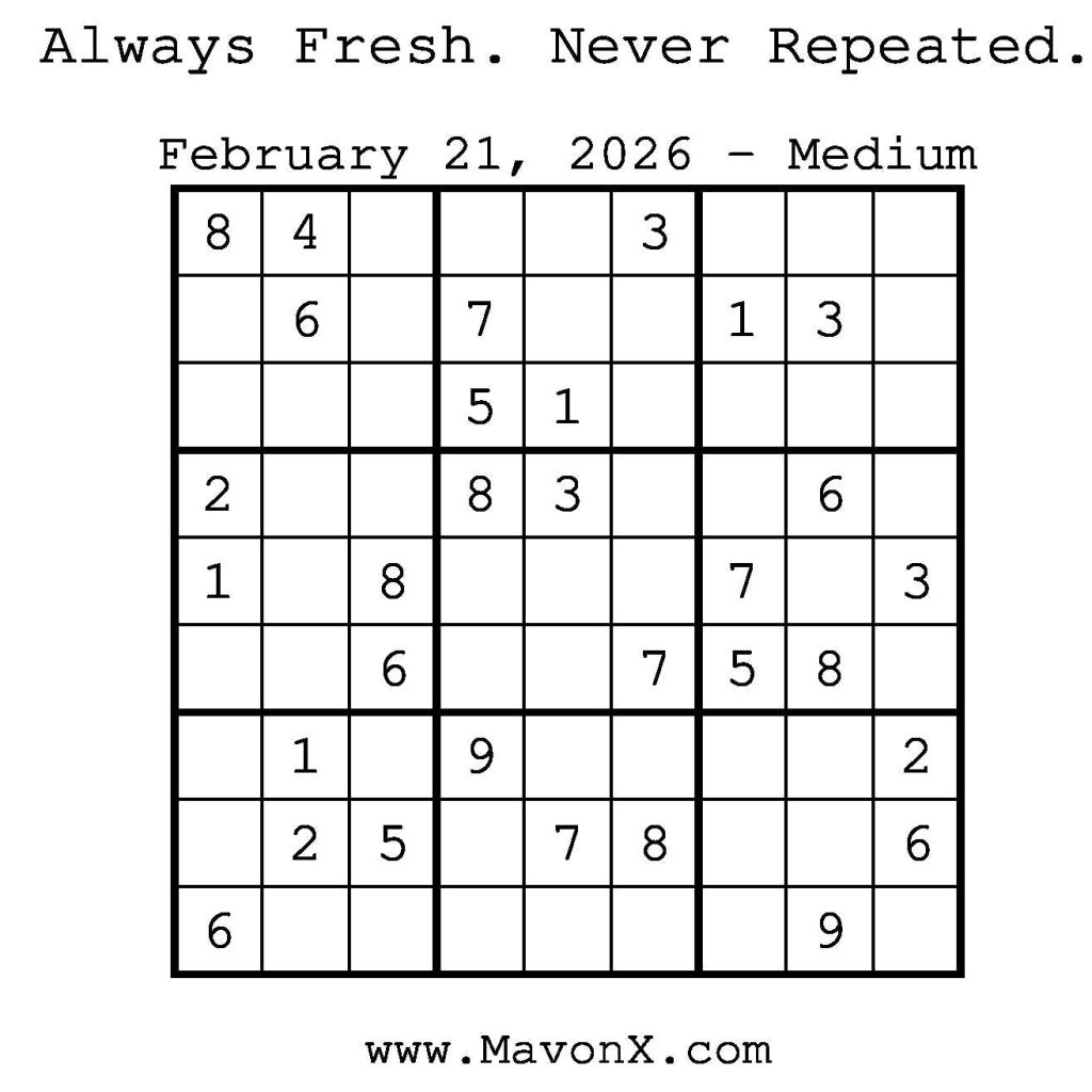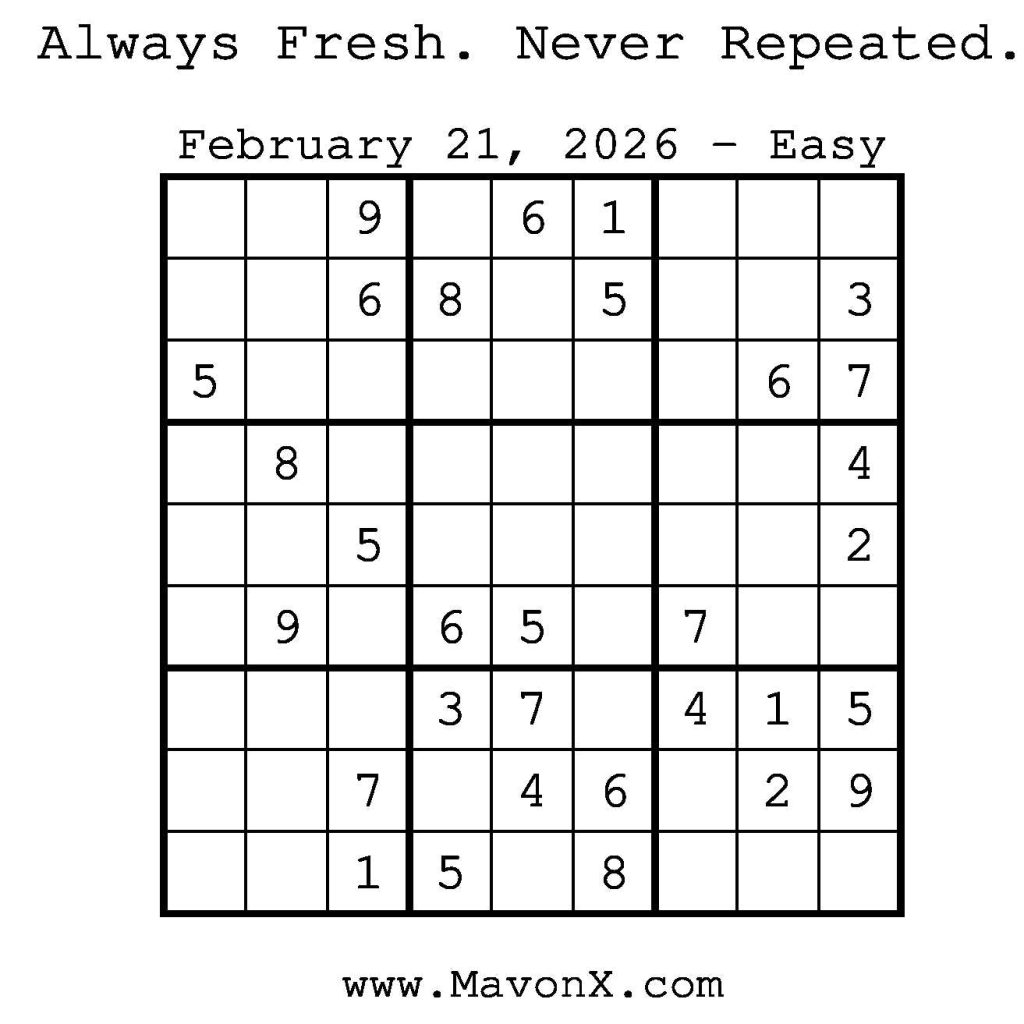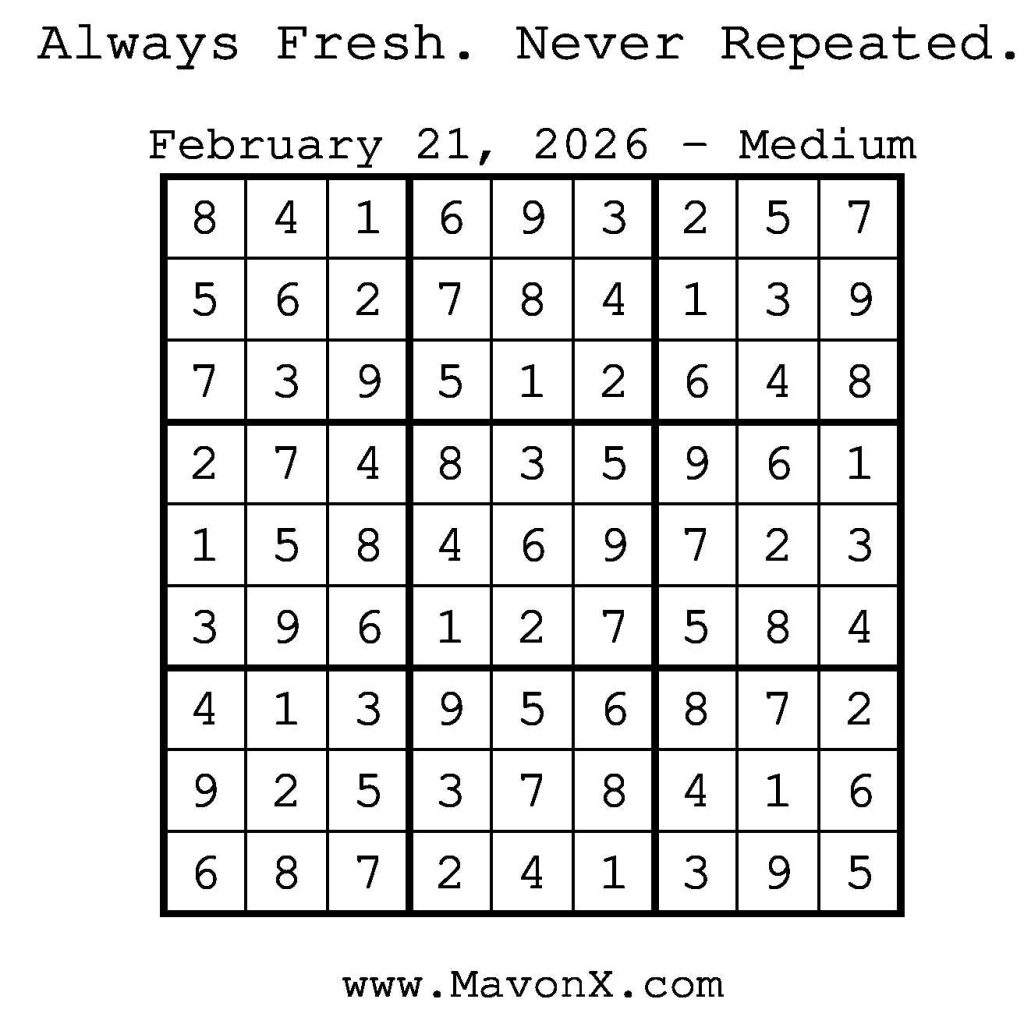 Puzzles of the Day – February 21, 2026 Post author:admin Post published:February 21, 2026 Post category:Free Stuff / Puzzle of the Day / Puzzle of the Day Solutions / Solutions Post comments:0 Comments Check out our books on Amazon! Check out our books on Barnes and Noble! Check out our books on Etsy! Easy Sudoku Coach Link Medium Sudoku Coach Link Hard Sudoku Coach Link Show Solution You Might Also Like Puzzles of the Day – January 24, 2026 January 24, 2026 Puzzles of the Day – January 9, 2026 January 8, 2026 Puzzles of the Day – February 22, 2026 February 23, 2026 Leave a Reply Cancel replyCommentEnter your name or username to comment Enter your email address to comment Enter your website URL (optional) Save my name, email, and website in this browser for the next time I comment.
