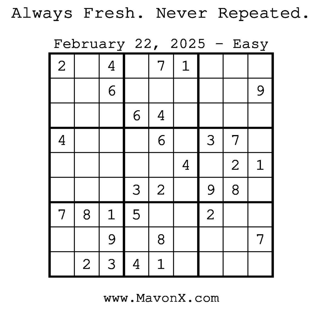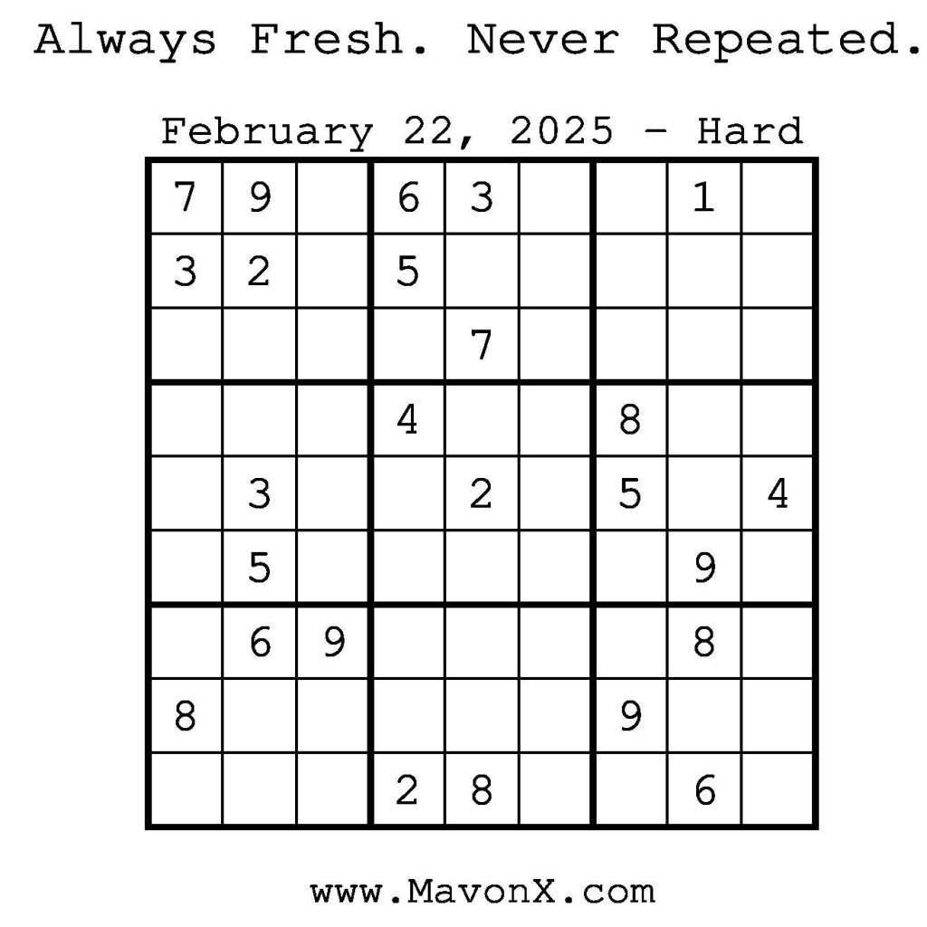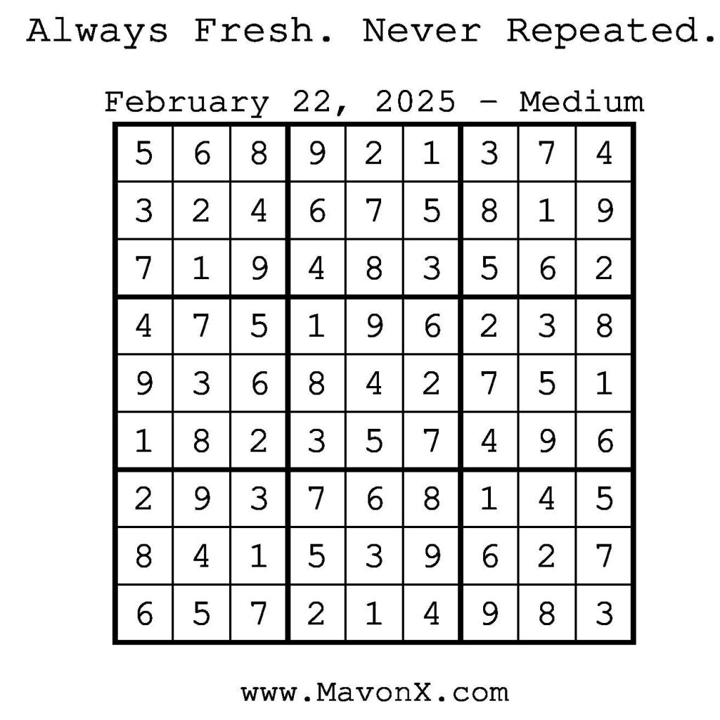 Puzzles of the Day – February 22, 2025 Post author:admin Post published:February 21, 2025 Post category:Free Stuff / Puzzle of the Day / Puzzle of the Day Solutions / Solutions Post comments:0 Comments Check out our books on Amazon! Check out our books on Barnes and Noble! Check out our books on Etsy! Easy Sudoku Coach Link Medium Sudoku Coach Link Hard Sudoku Coach Link Show Solution You Might Also Like Puzzles of the Day – May 12, 2025 May 12, 2025 Puzzles of the Day – September 19, 2025 September 18, 2025 Puzzles of the Day – May 20, 2025 May 19, 2025 Leave a Reply Cancel replyCommentEnter your name or username to comment Enter your email address to comment Enter your website URL (optional) Save my name, email, and website in this browser for the next time I comment.