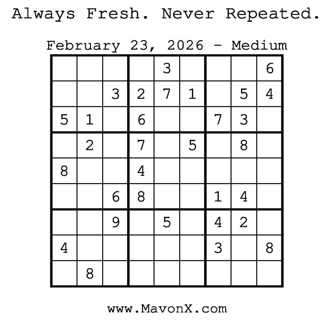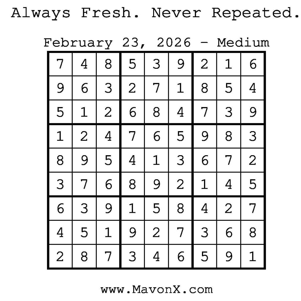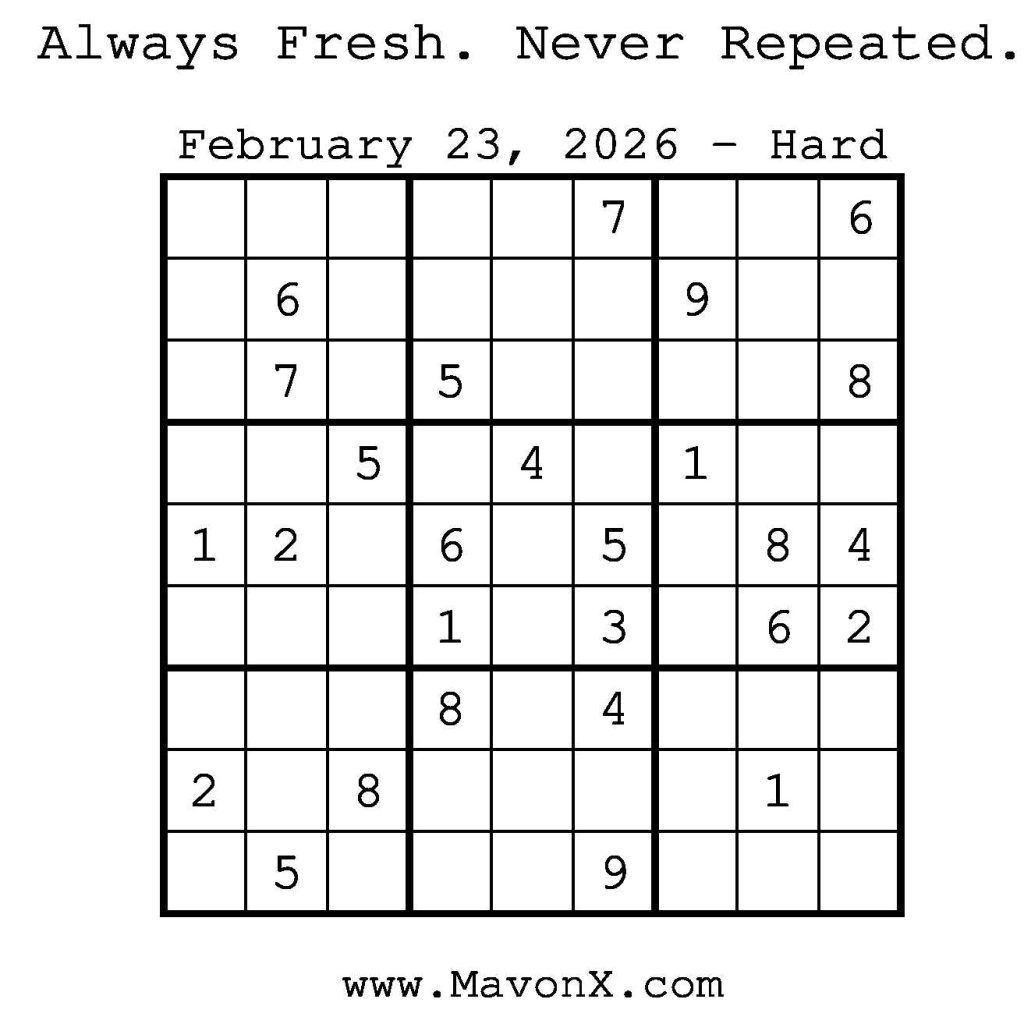 Puzzles of the Day – February 23, 2026 Post author:admin Post published:February 23, 2026 Post category:Free Stuff / Puzzle of the Day / Puzzle of the Day Solutions / Solutions Post comments:0 Comments Check out our books on Amazon! Check out our books on Barnes and Noble! Check out our books on Etsy! Easy Sudoku Coach Link Medium Sudoku Coach Link Hard Sudoku Coach Link Show Solution You Might Also Like Puzzles of the Day – January 17, 2025 January 16, 2025 Puzzles of the Day – March 22, 2025 March 22, 2025 Puzzles of the Day – November 22, 2025 November 21, 2025 Leave a Reply Cancel replyCommentEnter your name or username to comment Enter your email address to comment Enter your website URL (optional) Save my name, email, and website in this browser for the next time I comment.