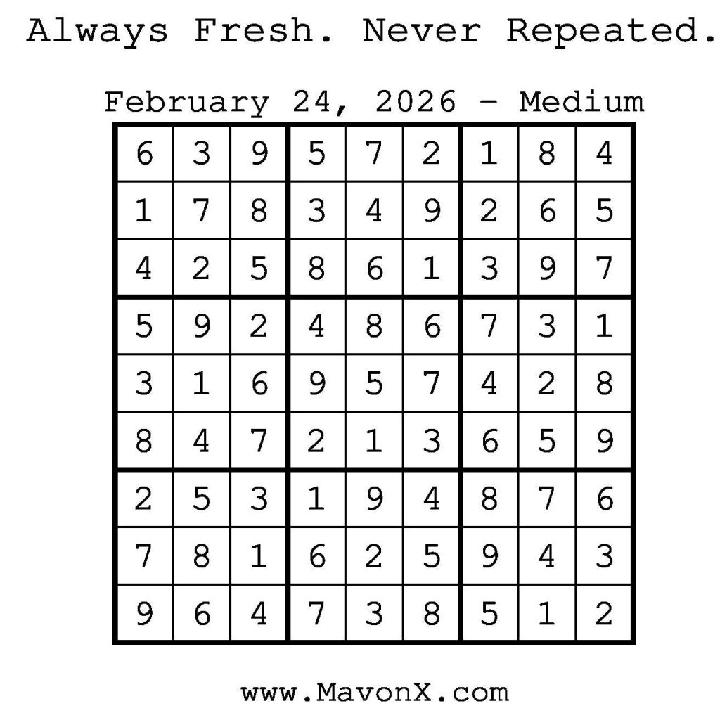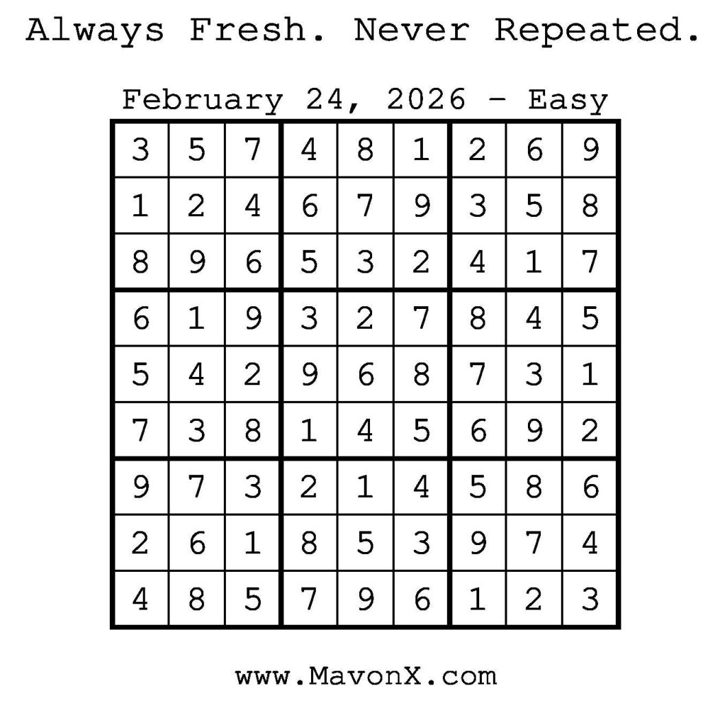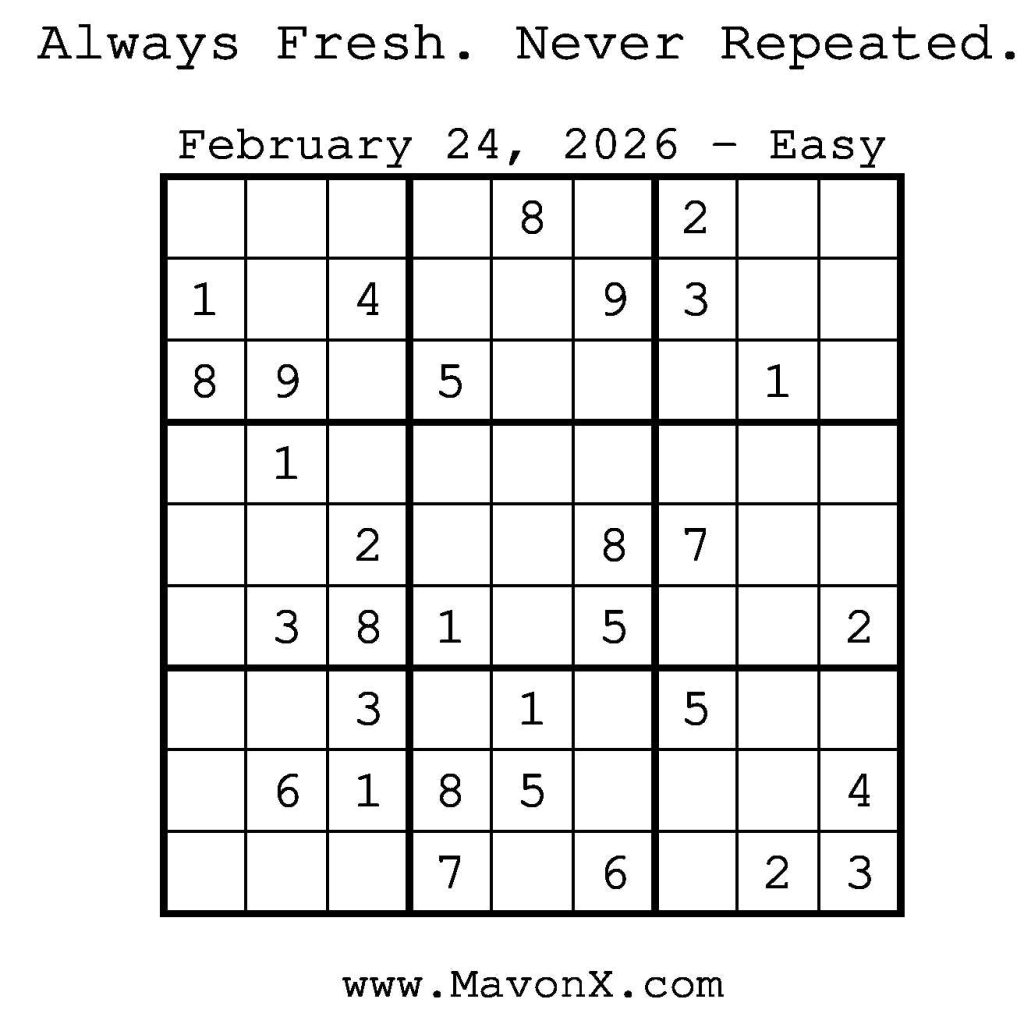 Puzzles of the Day – February 24, 2026 Post author:admin Post published:February 23, 2026 Post category:Free Stuff / Puzzle of the Day / Puzzle of the Day Solutions / Solutions Post comments:0 Comments Check out our books on Amazon! Check out our books on Barnes and Noble! Check out our books on Etsy! Easy Sudoku Coach Link Medium Sudoku Coach Link Hard Sudoku Coach Link Show Solution You Might Also Like Puzzles of the Day – September 4, 2024 September 4, 2024 Puzzles of the Day – March 12, 2025 March 12, 2025 Puzzles of the Day – June 4, 2025 June 3, 2025 Leave a Reply Cancel replyCommentEnter your name or username to comment Enter your email address to comment Enter your website URL (optional) Save my name, email, and website in this browser for the next time I comment.
