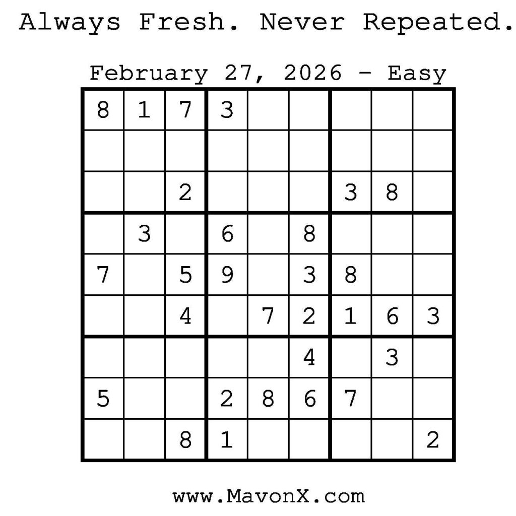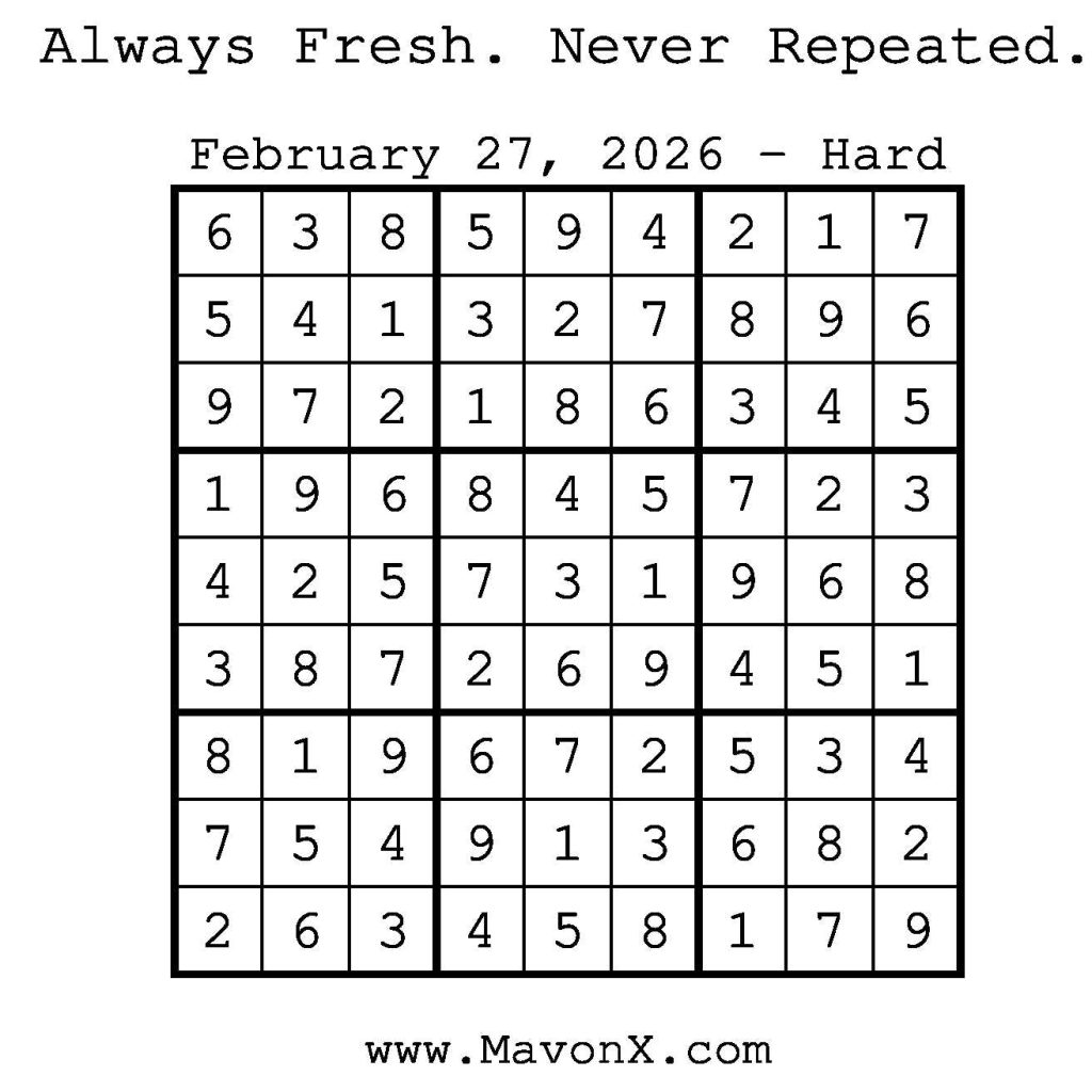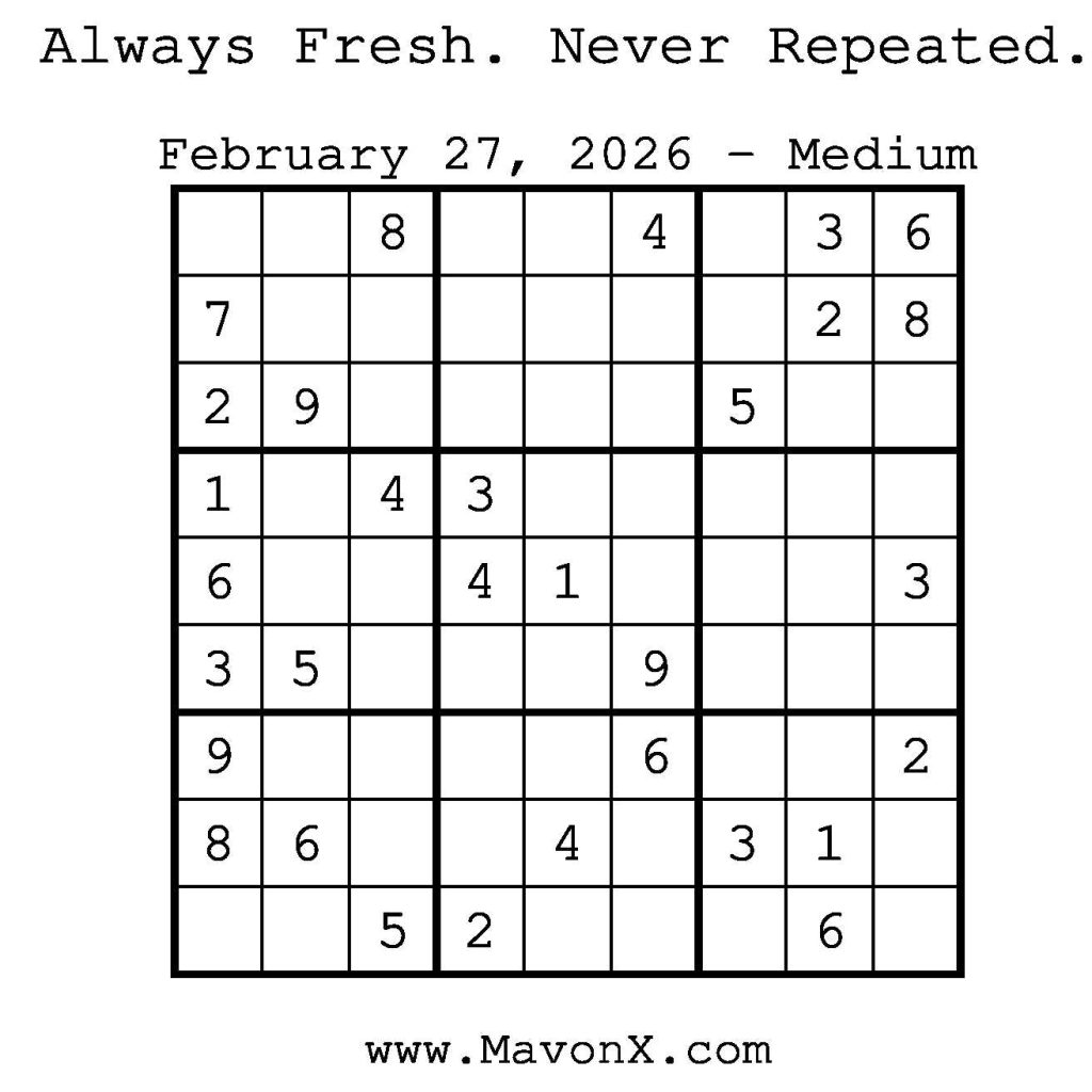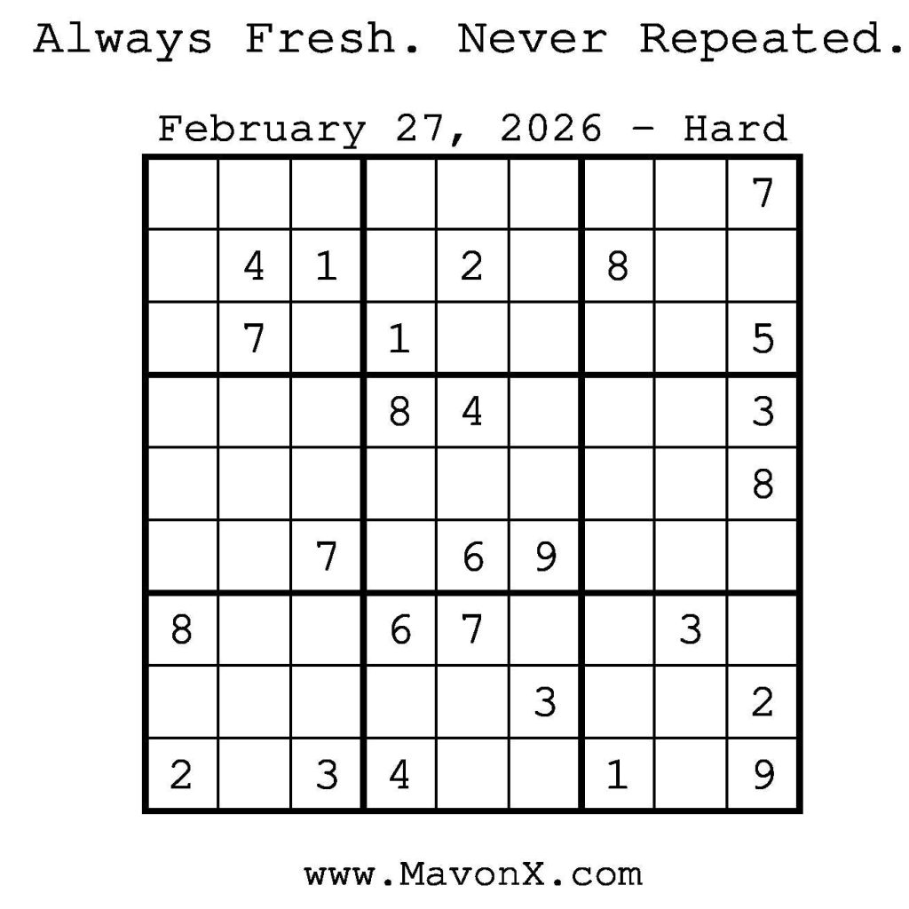 Puzzles of the Day – February 27, 2026 Post author:admin Post published:February 26, 2026 Post category:Free Stuff / Puzzle of the Day / Puzzle of the Day Solutions / Solutions Post comments:0 Comments Check out our books on Amazon! Check out our books on Barnes and Noble! Check out our books on Etsy! Easy Sudoku Coach Link Medium Sudoku Coach Link Hard Sudoku Coach Link Show Solution You Might Also Like Puzzles of the Day – January 20, 2025 January 21, 2025 Puzzles of the Day – January 26, 2026 January 25, 2026 Puzzles of the Day – December 21, 2025 December 20, 2025 Leave a Reply Cancel replyCommentEnter your name or username to comment Enter your email address to comment Enter your website URL (optional) Save my name, email, and website in this browser for the next time I comment.