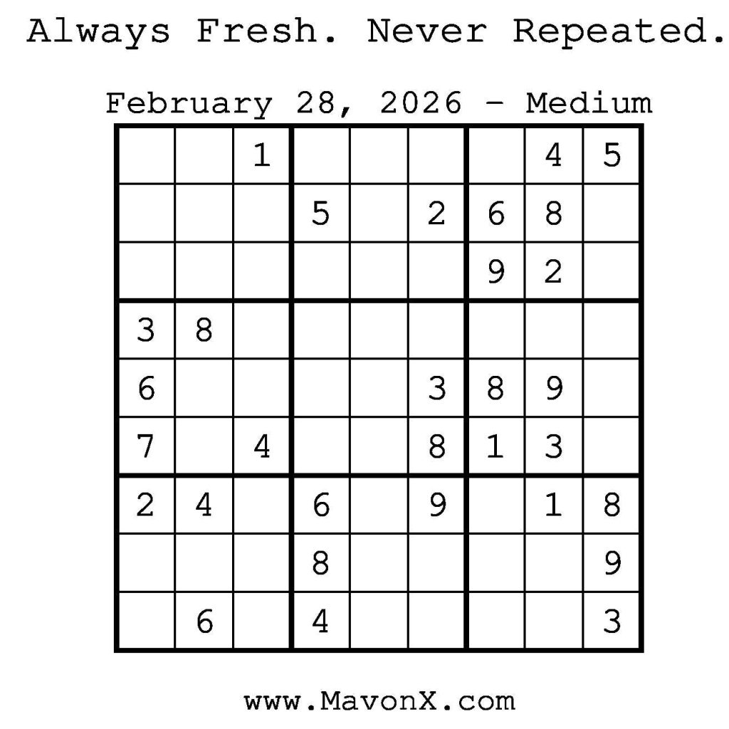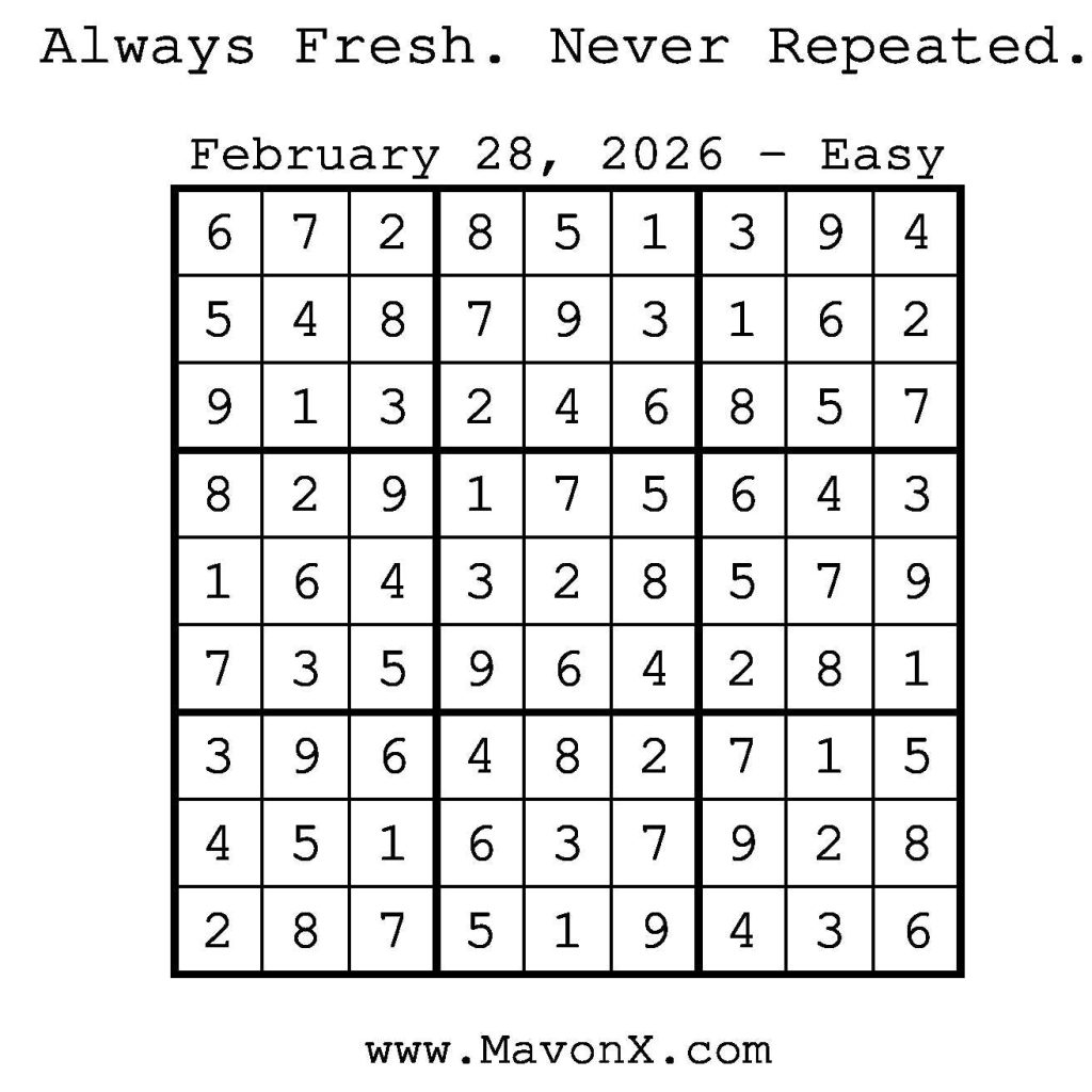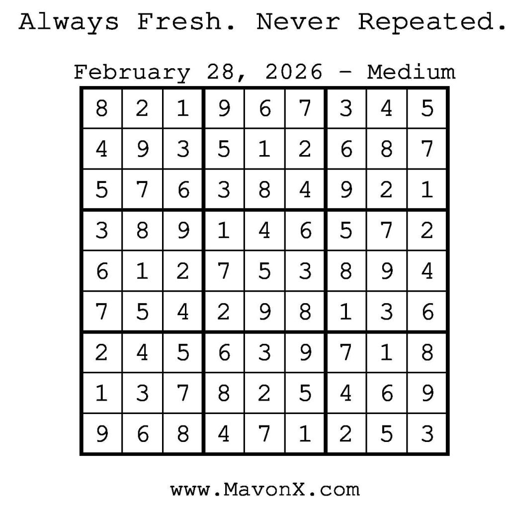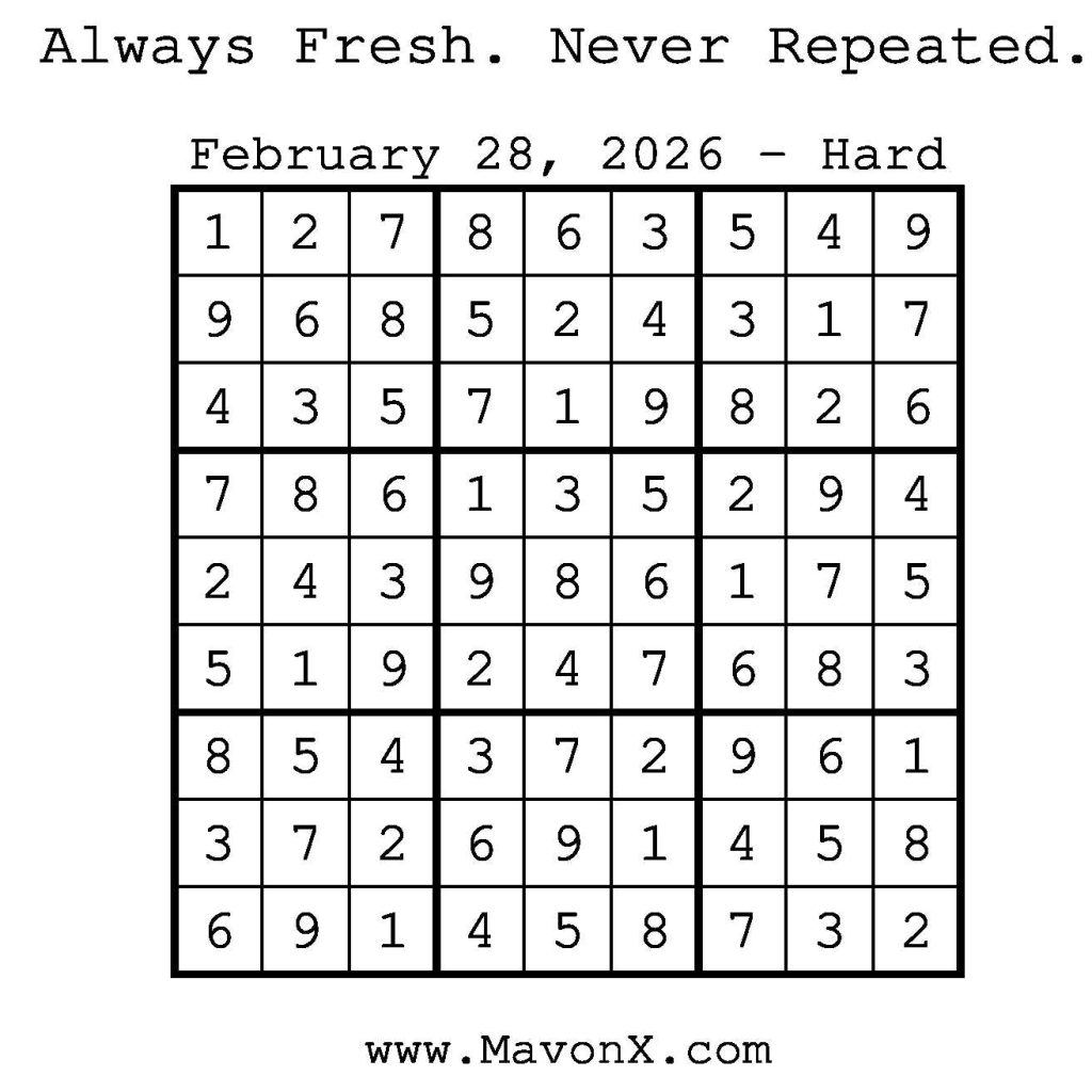 Puzzles of the Day – February 28, 2026 Post author:admin Post published:February 27, 2026 Post category:Free Stuff / Puzzle of the Day / Puzzle of the Day Solutions / Solutions Post comments:0 Comments Check out our books on Amazon! Check out our books on Barnes and Noble! Check out our books on Etsy! Easy Sudoku Coach Link Medium Sudoku Coach Link Hard Sudoku Coach Link Show Solution You Might Also Like Puzzles of the Day – January 10, 2025 January 10, 2025 Puzzles of the Day – September 3, 2024 September 3, 2024 Puzzles of the Day – May 21, 2025 May 20, 2025 Leave a Reply Cancel replyCommentEnter your name or username to comment Enter your email address to comment Enter your website URL (optional) Save my name, email, and website in this browser for the next time I comment.