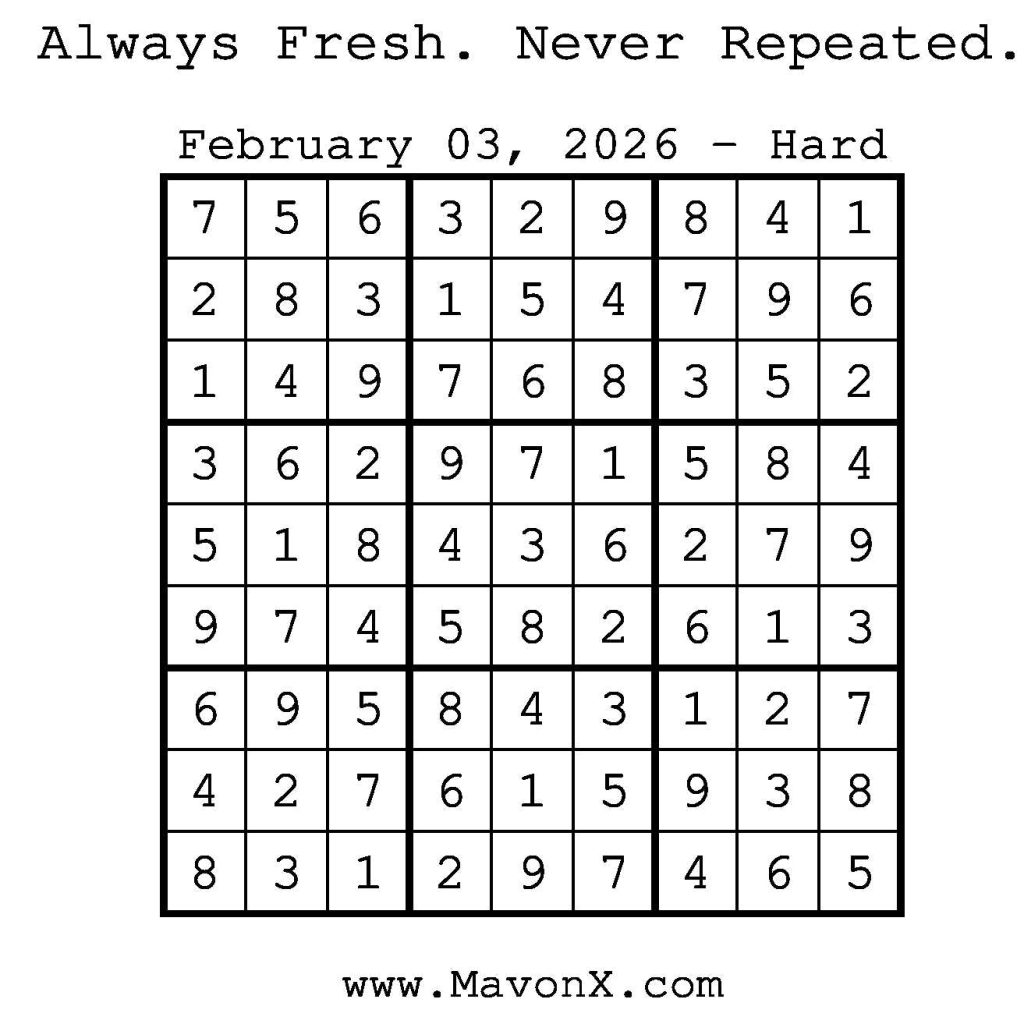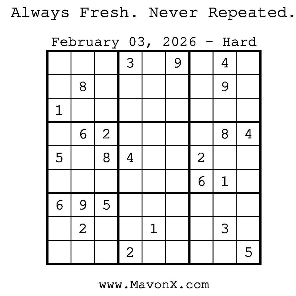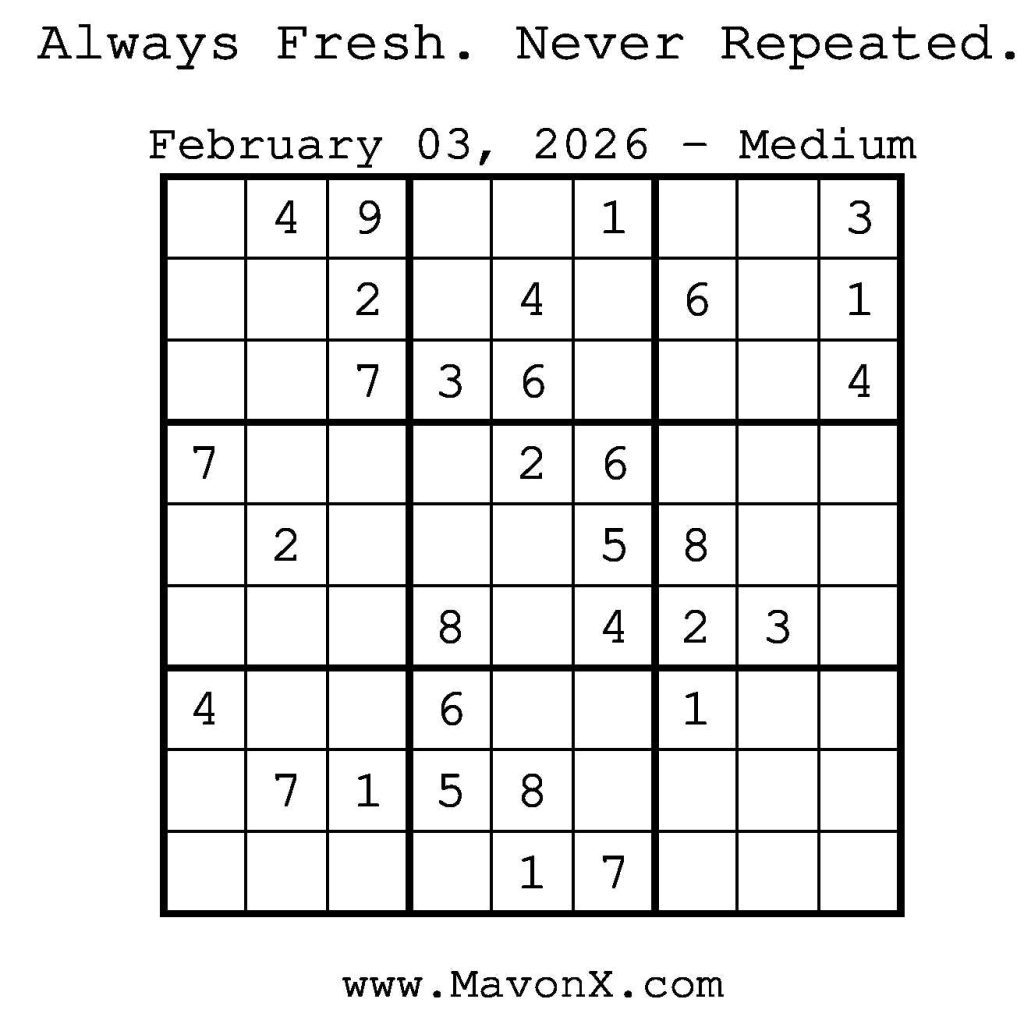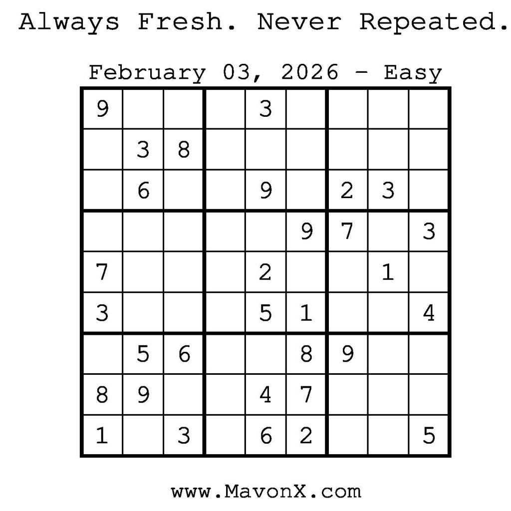 Puzzles of the Day – February 3, 2026 Post author:admin Post published:February 2, 2026 Post category:Free Stuff / Puzzle of the Day / Puzzle of the Day Solutions / Solutions Post comments:0 Comments Check out our books on Amazon! Check out our books on Barnes and Noble! Check out our books on Etsy! Easy Sudoku Coach Link Medium Sudoku Coach Link Hard Sudoku Coach Link Show Solution You Might Also Like Puzzles of the Day – September 4, 2024 September 4, 2024 Puzzles of the Day – September 15, 2024 September 15, 2024 Puzzles of the Day – December 20, 2025 December 19, 2025 Leave a Reply Cancel replyCommentEnter your name or username to comment Enter your email address to comment Enter your website URL (optional) Save my name, email, and website in this browser for the next time I comment.