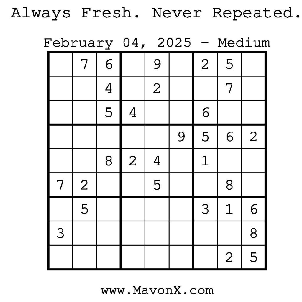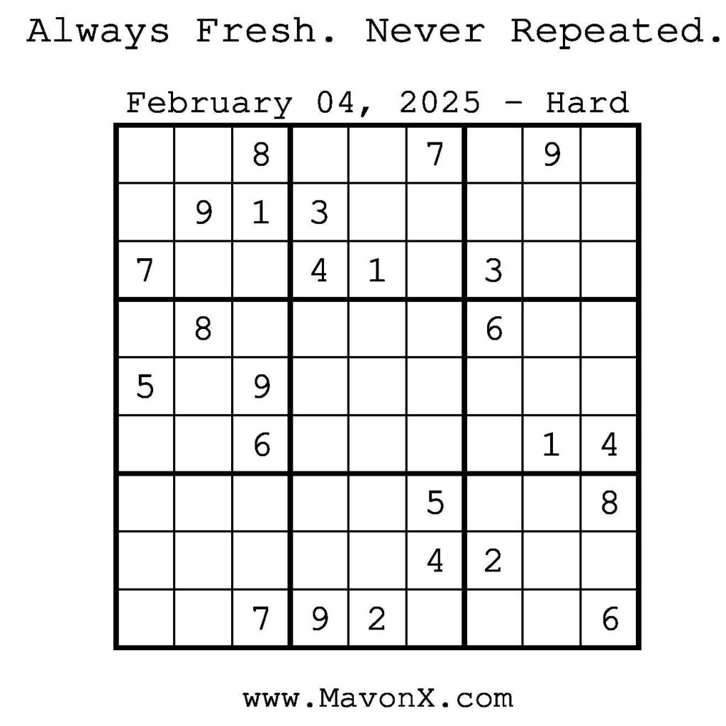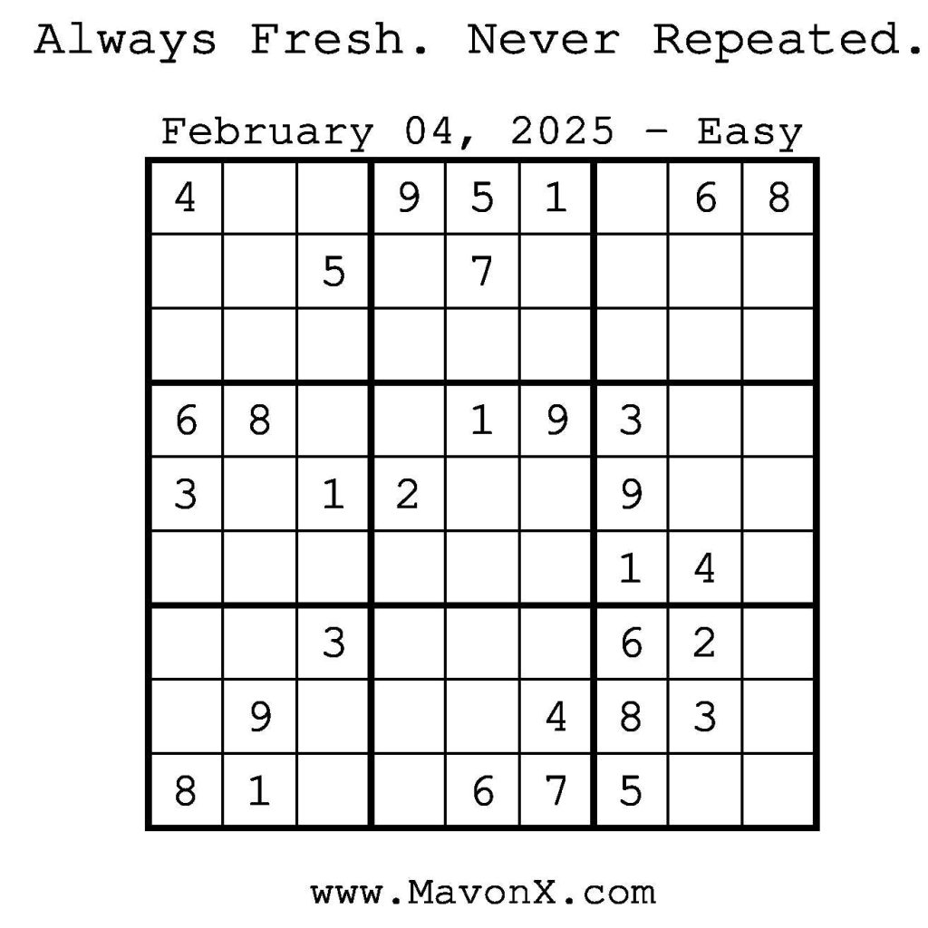 Puzzles of the Day – February 4, 2025 Post author:admin Post published:February 3, 2025 Post category:Free Stuff / Puzzle of the Day / Puzzle of the Day Solutions / Solutions Post comments:0 Comments Check out our books on Amazon! Check out our books on Barnes and Noble! Check out our books on Etsy! Easy Sudoku Coach Link Medium Sudoku Coach Link Hard Sudoku Coach Link Show Solution You Might Also Like Puzzles of the Day – January 3, 2026 January 2, 2026 Puzzles of the Day – January 14, 2025 January 14, 2025 Puzzles of the Day – May 12, 2025 May 12, 2025 Leave a Reply Cancel replyCommentEnter your name or username to comment Enter your email address to comment Enter your website URL (optional) Save my name, email, and website in this browser for the next time I comment.