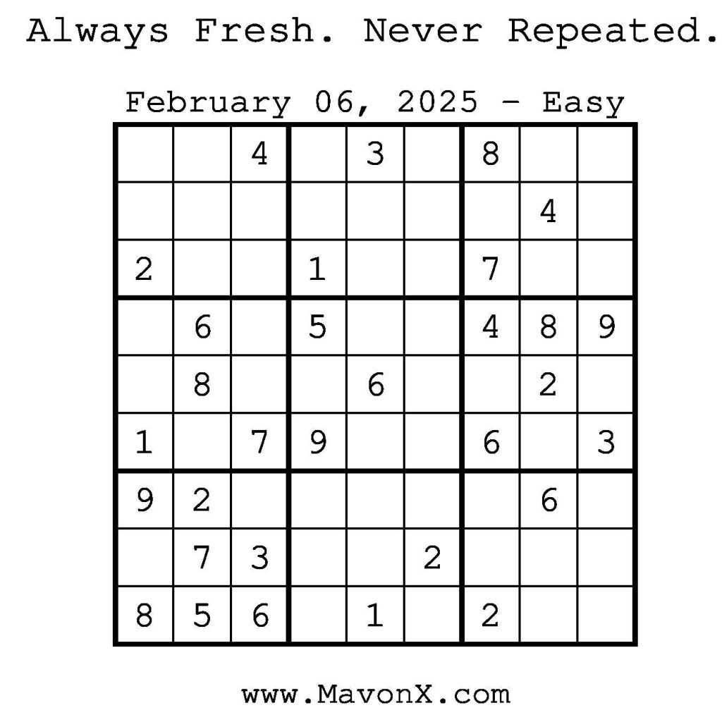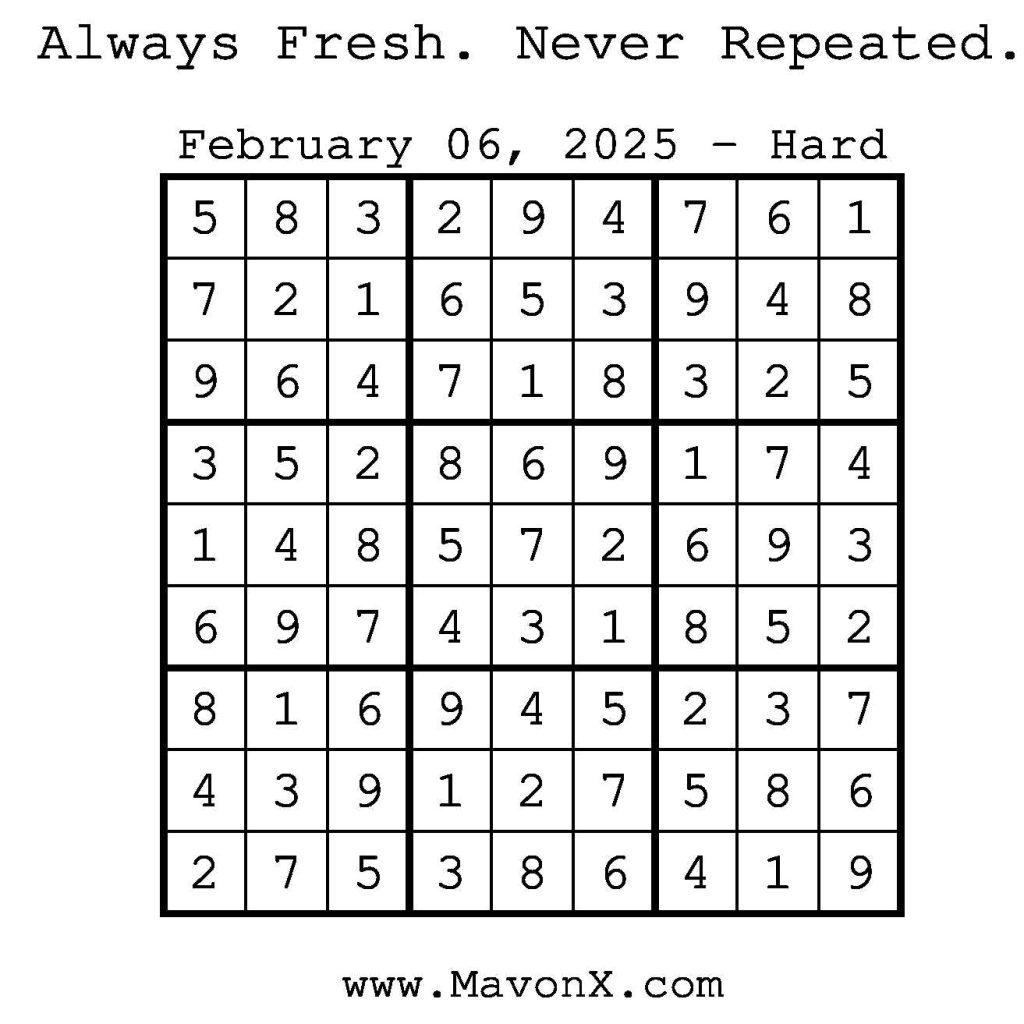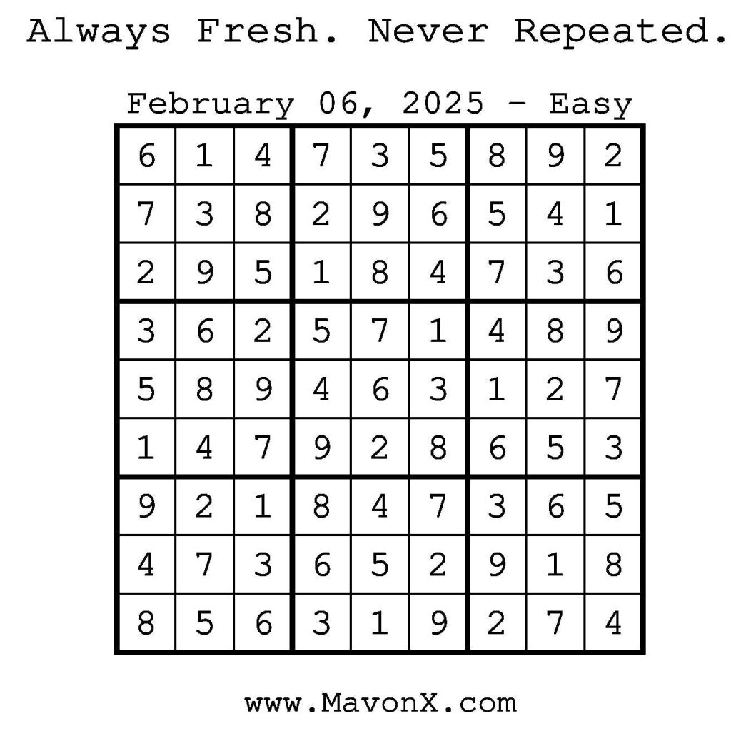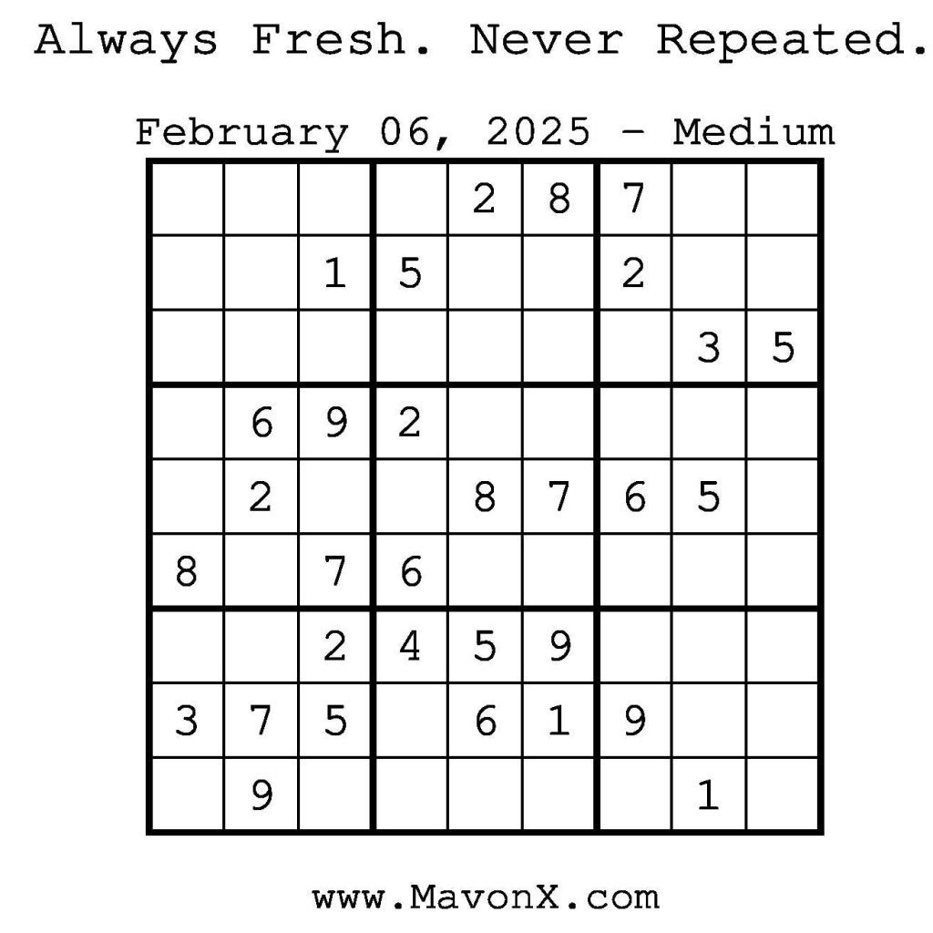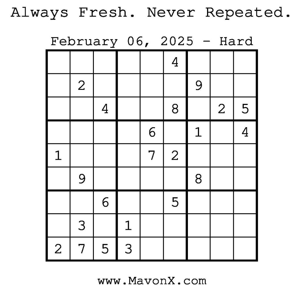 Puzzles of the Day – February 6, 2025 Post author:admin Post published:February 6, 2025 Post category:Free Stuff / Puzzle of the Day / Puzzle of the Day Solutions / Solutions Post comments:0 Comments Check out our books on Amazon! Check out our books on Barnes and Noble! Check out our books on Etsy! Easy Sudoku Coach Link Medium Sudoku Coach Link Hard Sudoku Coach Link Show Solution You Might Also Like Exciting News: MavonX’s Sudoku Expedition: The Double Monthly Challenge – Issue 2: 216 Puzzles for Daily Fun! #2 July 31, 2024 Puzzles of the Day – June 13, 2025 June 12, 2025 Puzzles of the Day – January 15, 2026 January 14, 2026 Leave a Reply Cancel replyCommentEnter your name or username to comment Enter your email address to comment Enter your website URL (optional) Save my name, email, and website in this browser for the next time I comment.