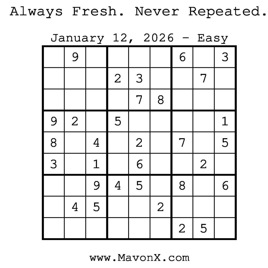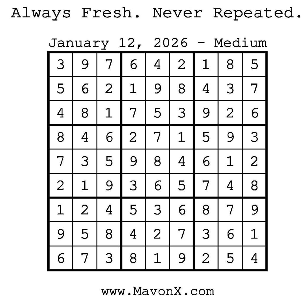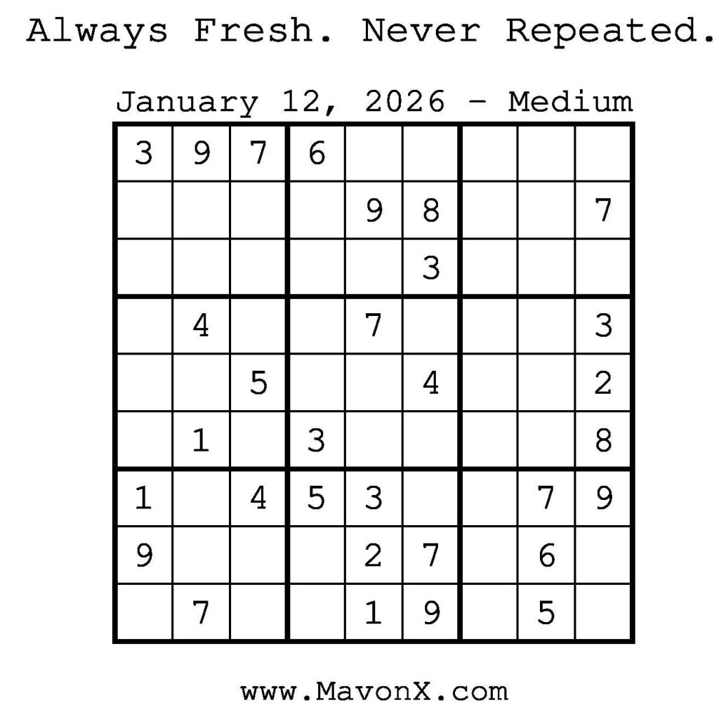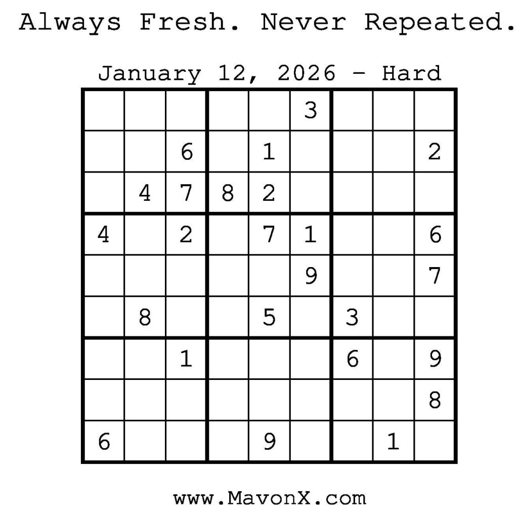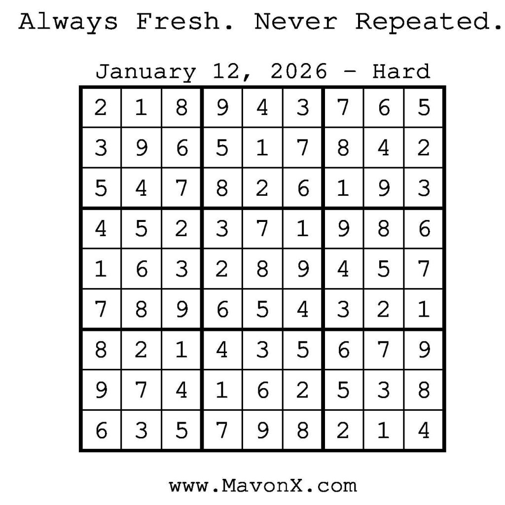Puzzles of the Day – January 12, 2026 Post author:admin Post published:January 12, 2026 Post category:Free Stuff / Puzzle of the Day / Puzzle of the Day Solutions / Solutions Post comments:0 Comments Check out our books on Amazon! Check out our books on Barnes and Noble! Check out our books on Etsy! Easy Sudoku Coach Link Medium Sudoku Coach Link Hard Sudoku Coach Link Show Solution You Might Also Like Puzzles of the Day – February 28, 2025 February 28, 2025 Puzzles of the Day – November 13, 2024 November 12, 2024 Puzzles of the Day – January 4, 2026 January 3, 2026 Leave a Reply Cancel replyCommentEnter your name or username to comment Enter your email address to comment Enter your website URL (optional) Save my name, email, and website in this browser for the next time I comment.