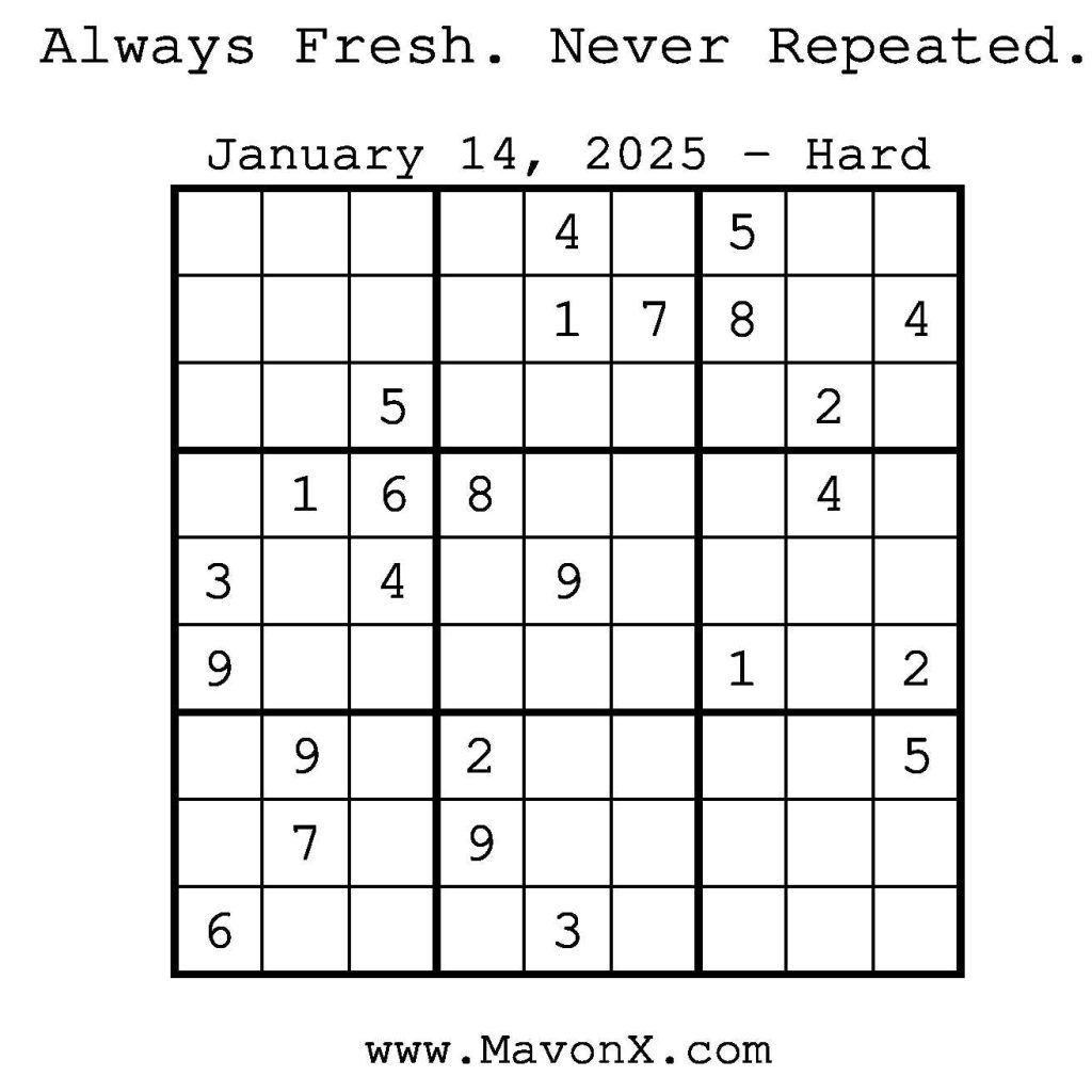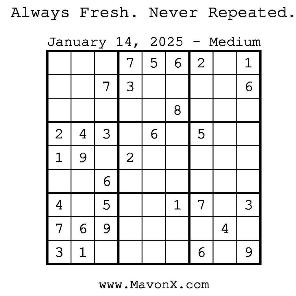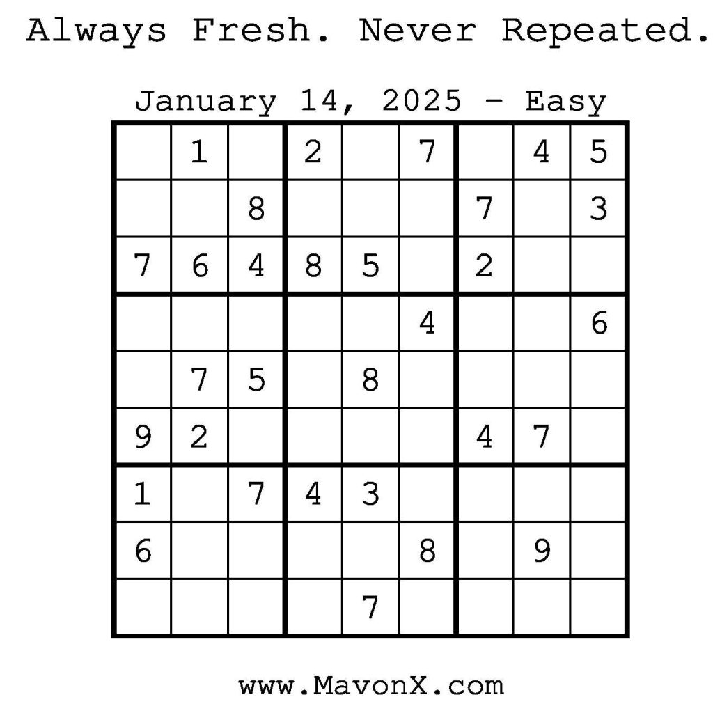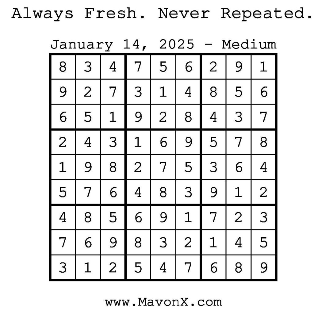 Puzzles of the Day – January 14, 2025 Post author:admin Post published:January 14, 2025 Post category:Free Stuff / Puzzle of the Day / Puzzle of the Day Solutions / Solutions Post comments:0 Comments Check out our books on Amazon! Check out our books on Barnes and Noble! Check out our books on Etsy! Easy Sudoku Coach Link Medium Sudoku Coach Link Hard Sudoku Coach Link Show Solution You Might Also Like Puzzles of the Day – April 15, 2026 April 14, 2026 Exciting News: MavonX’s Just Sudoku: Released November 4, 2024 Puzzles of the Day – October 8, 2024 October 8, 2024 Leave a Reply Cancel replyCommentEnter your name or username to comment Enter your email address to comment Enter your website URL (optional) Save my name, email, and website in this browser for the next time I comment.