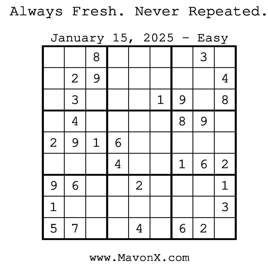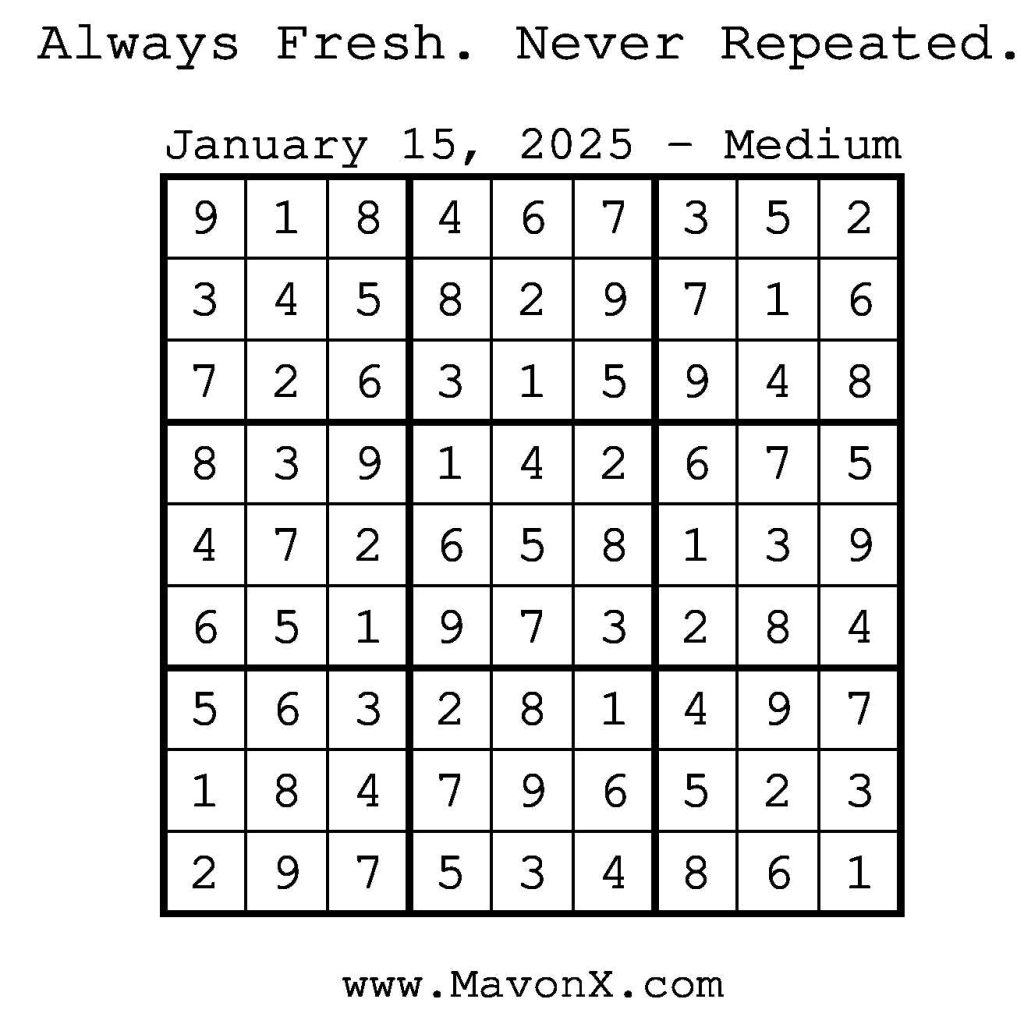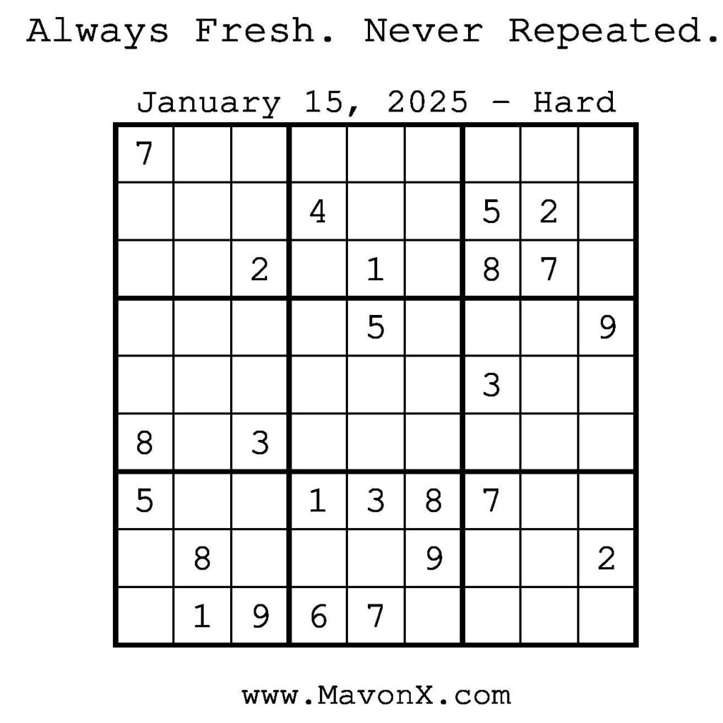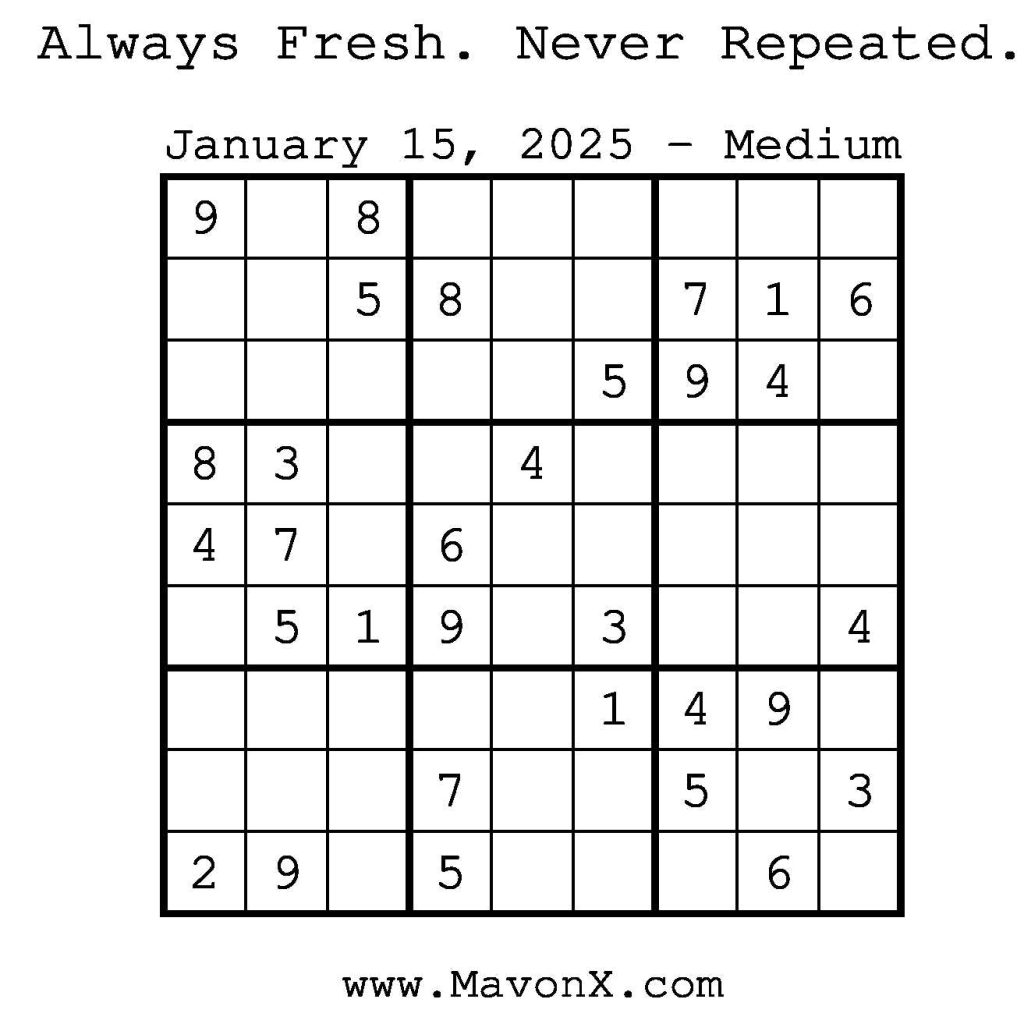 Puzzles of the Day – January 15, 2025 Post author:admin Post published:January 14, 2025 Post category:Free Stuff / Puzzle of the Day / Puzzle of the Day Solutions / Solutions Post comments:0 Comments Check out our books on Amazon! Check out our books on Barnes and Noble! Check out our books on Etsy! Easy Sudoku Coach Link Medium Sudoku Coach Link Hard Sudoku Coach Link Show Solution You Might Also Like Puzzles of the Day – January 9, 2026 January 8, 2026 Puzzles of the Day – March 4, 2026 March 4, 2026 Puzzles of the Day – October 29, 2025 October 28, 2025 Leave a Reply Cancel replyCommentEnter your name or username to comment Enter your email address to comment Enter your website URL (optional) Save my name, email, and website in this browser for the next time I comment.