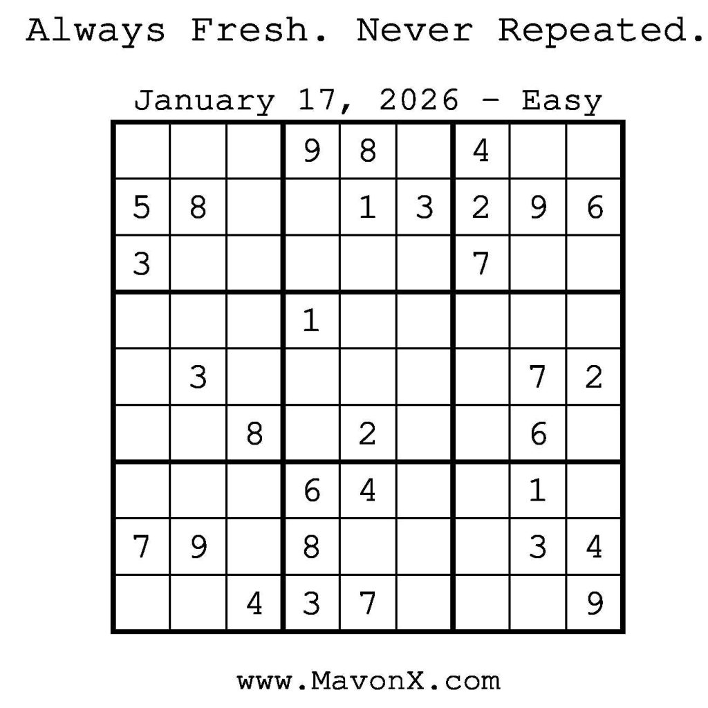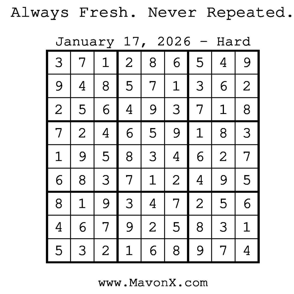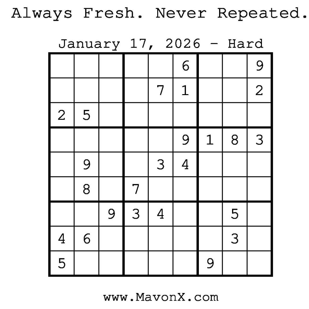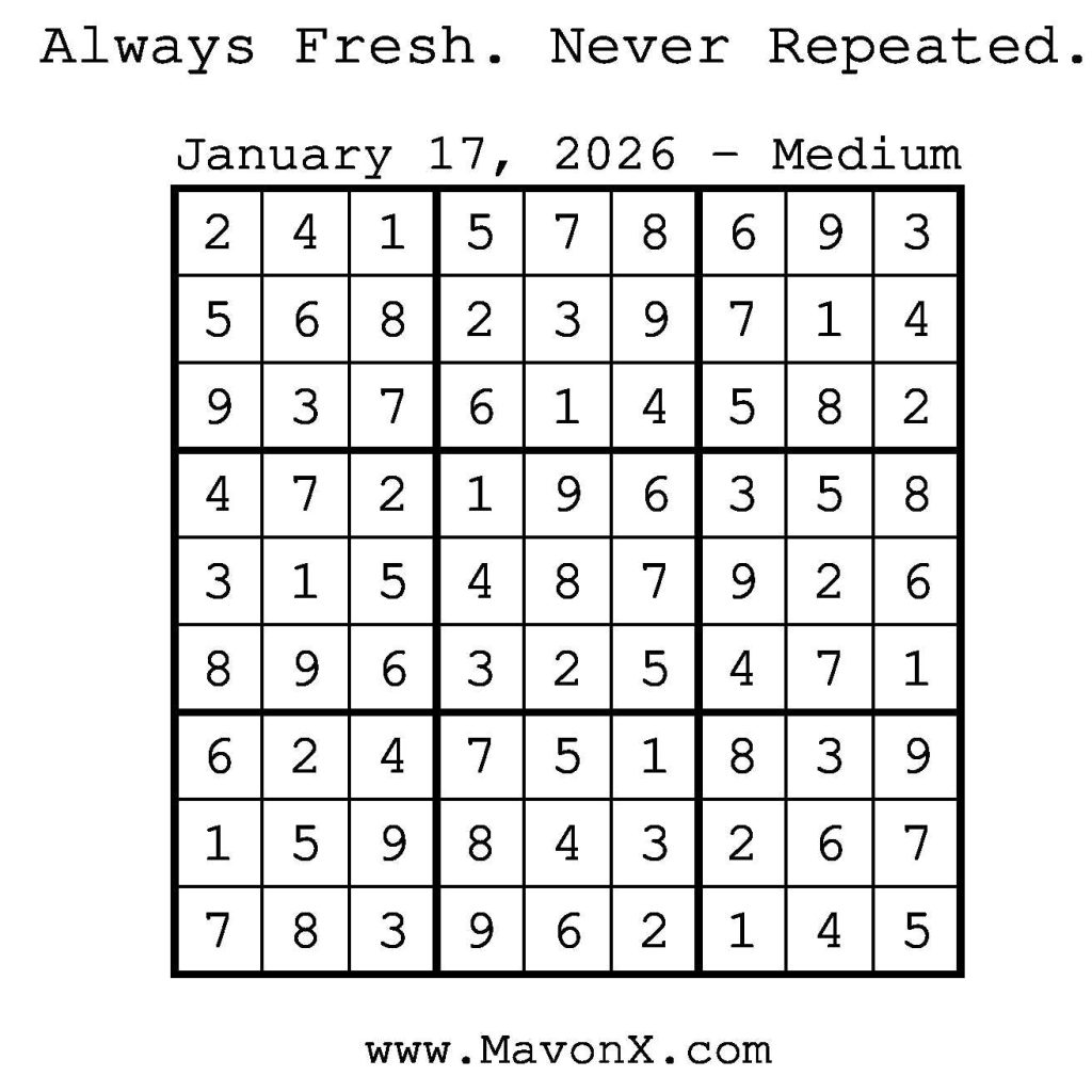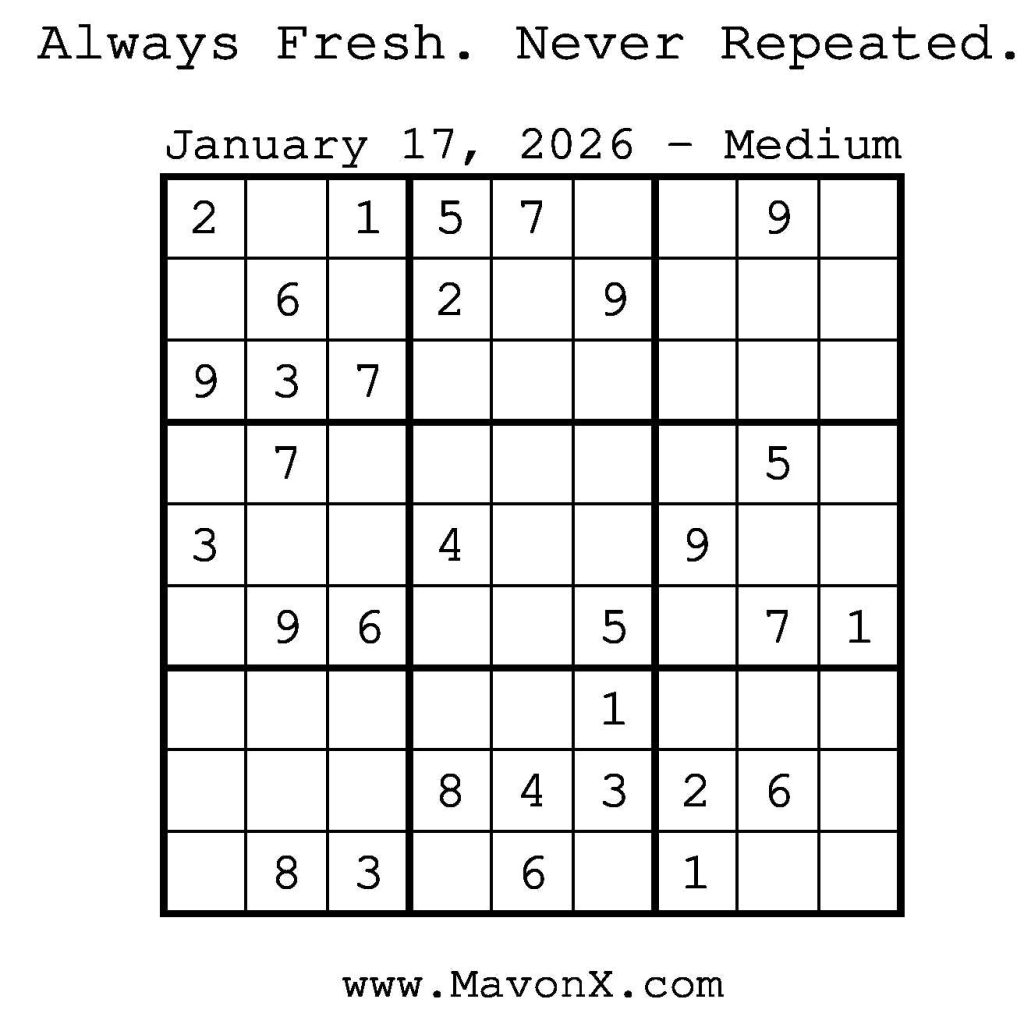 Puzzles of the Day – January 17, 2026 Post author:admin Post published:January 16, 2026 Post category:Free Stuff / Puzzle of the Day / Puzzle of the Day Solutions / Solutions Post comments:0 Comments Check out our books on Amazon! Check out our books on Barnes and Noble! Check out our books on Etsy! Easy Sudoku Coach Link Medium Sudoku Coach Link Hard Sudoku Coach Link Show Solution You Might Also Like Puzzles of the Day – February 27, 2025 February 26, 2025 Puzzles of the Day – July 24, 2025 July 24, 2025 Puzzles of the Day – March 26, 2025 March 25, 2025 Leave a Reply Cancel replyCommentEnter your name or username to comment Enter your email address to comment Enter your website URL (optional) Save my name, email, and website in this browser for the next time I comment.