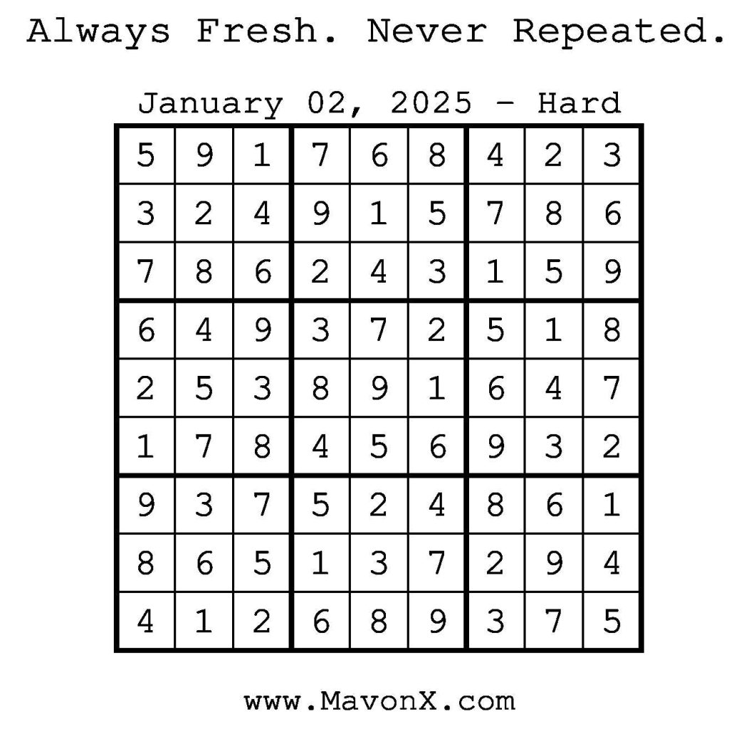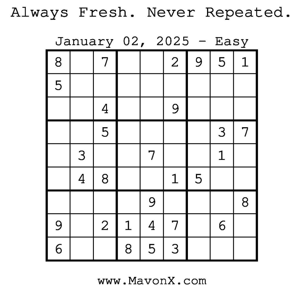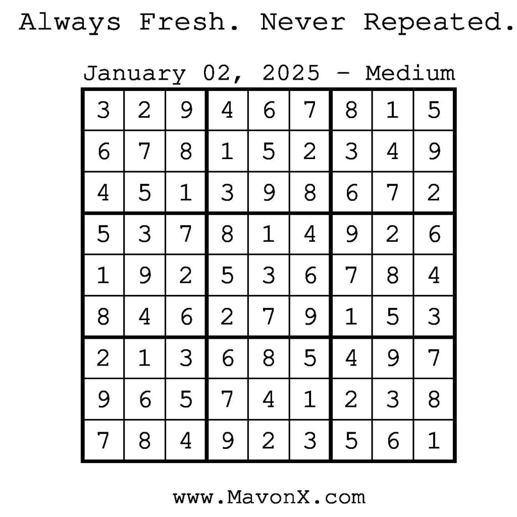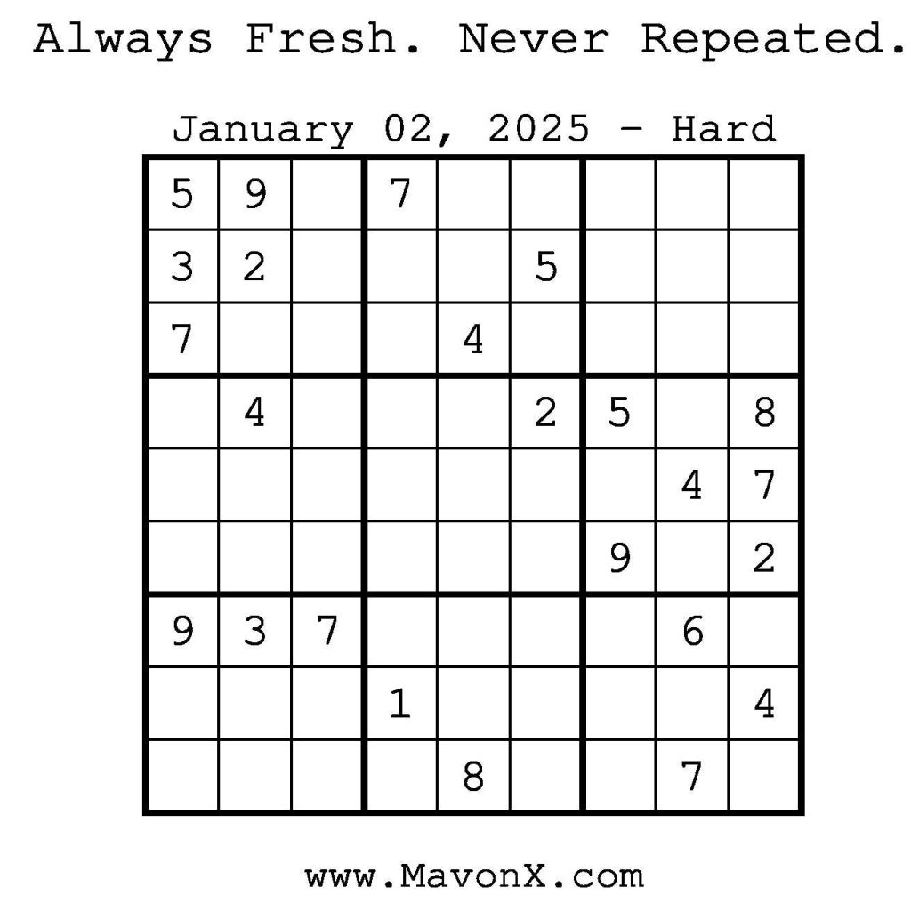 Puzzles of the Day – January 2, 2025 Post author:admin Post published:January 3, 2025 Post category:Free Stuff / Puzzle of the Day / Puzzle of the Day Solutions / Solutions Post comments:0 Comments Check out our books on Amazon! Check out our books on Barnes and Noble! Check out our books on Etsy! Easy Sudoku Coach Link Medium Sudoku Coach Link Hard Sudoku Coach Link Show Solution You Might Also Like Puzzles of the Day – September 26, 2024 September 26, 2024 Puzzles of the Day – May 21, 2025 May 20, 2025 Puzzles of the Day – September 8, 2024 September 8, 2024 Leave a Reply Cancel replyCommentEnter your name or username to comment Enter your email address to comment Enter your website URL (optional) Save my name, email, and website in this browser for the next time I comment.