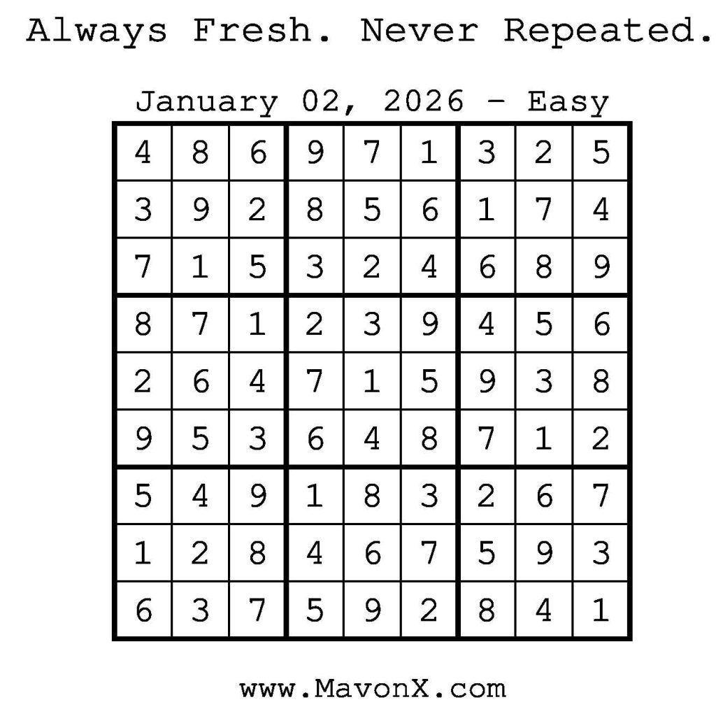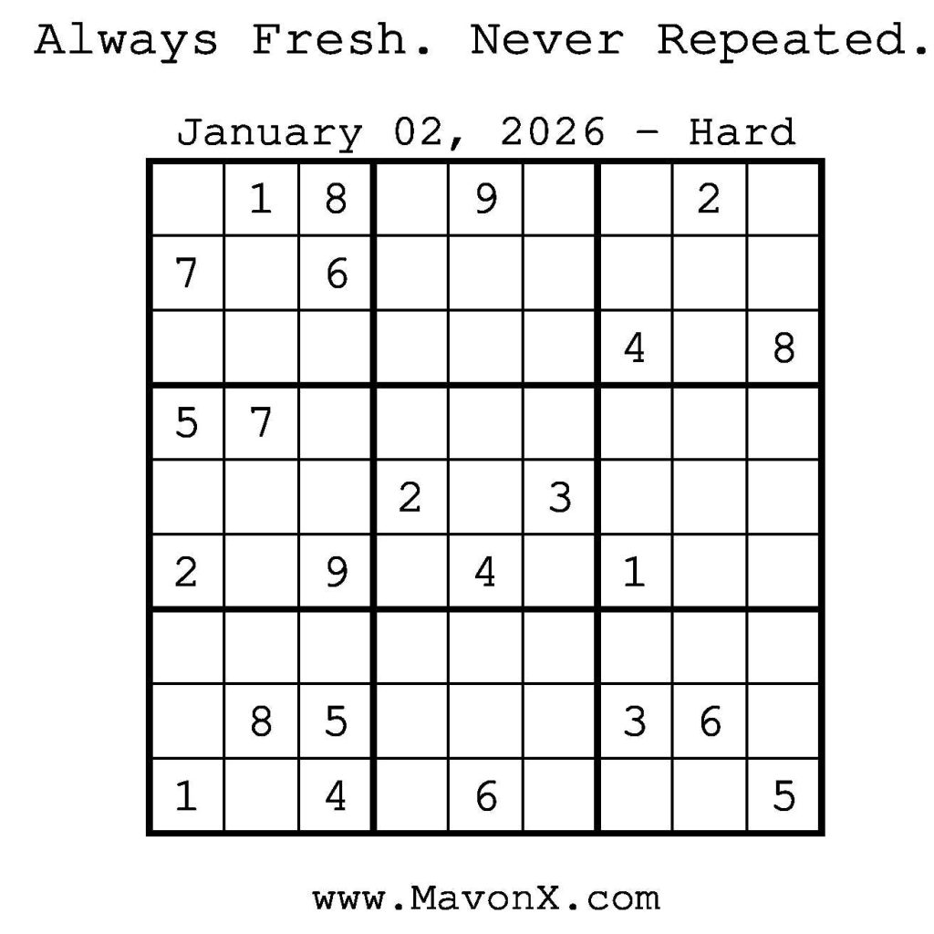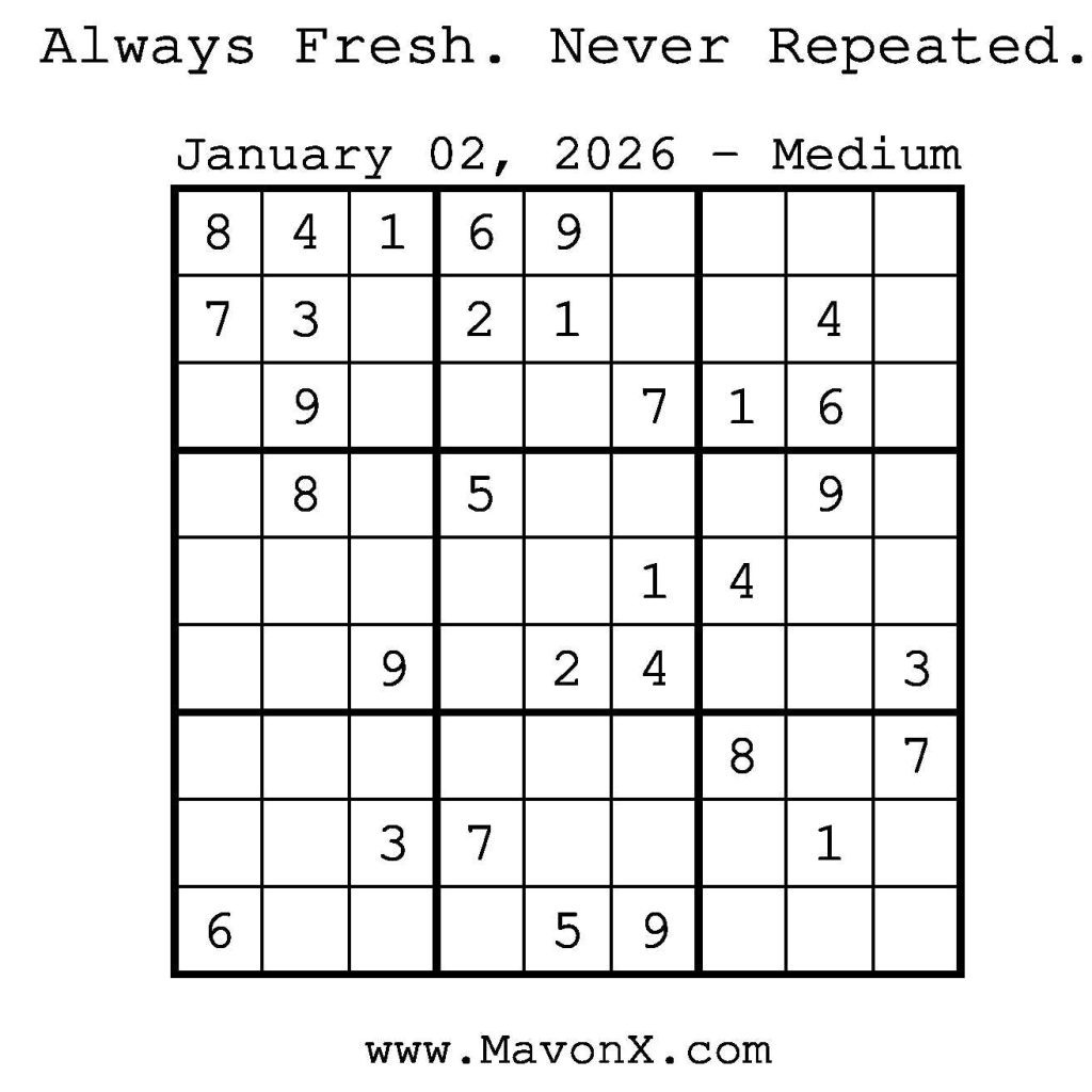 Puzzles of the Day – January 2, 2026 Post author:admin Post published:January 1, 2026 Post category:Free Stuff / Puzzle of the Day / Puzzle of the Day Solutions / Solutions Post comments:0 Comments Check out our books on Amazon! Check out our books on Barnes and Noble! Check out our books on Etsy! Easy Sudoku Coach Link Medium Sudoku Coach Link Hard Sudoku Coach Link Show Solution You Might Also Like Puzzles of the Day – October 25, 2025 October 24, 2025 Puzzles of the Day – October 21, 2024 October 21, 2024 Puzzles of the Day – January 21, 2025 January 21, 2025 Leave a Reply Cancel replyCommentEnter your name or username to comment Enter your email address to comment Enter your website URL (optional) Save my name, email, and website in this browser for the next time I comment.