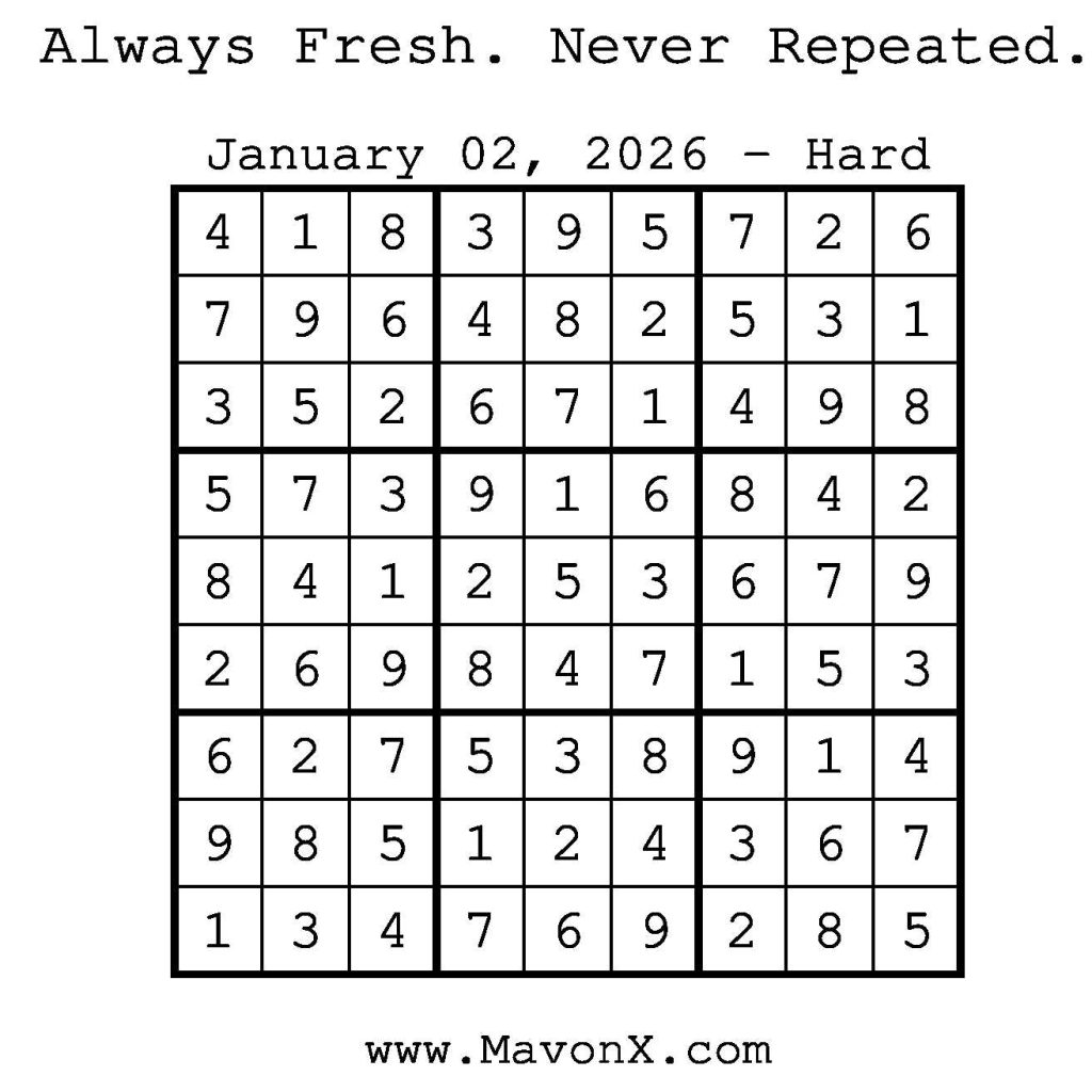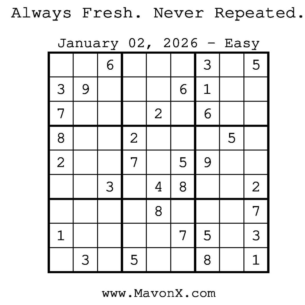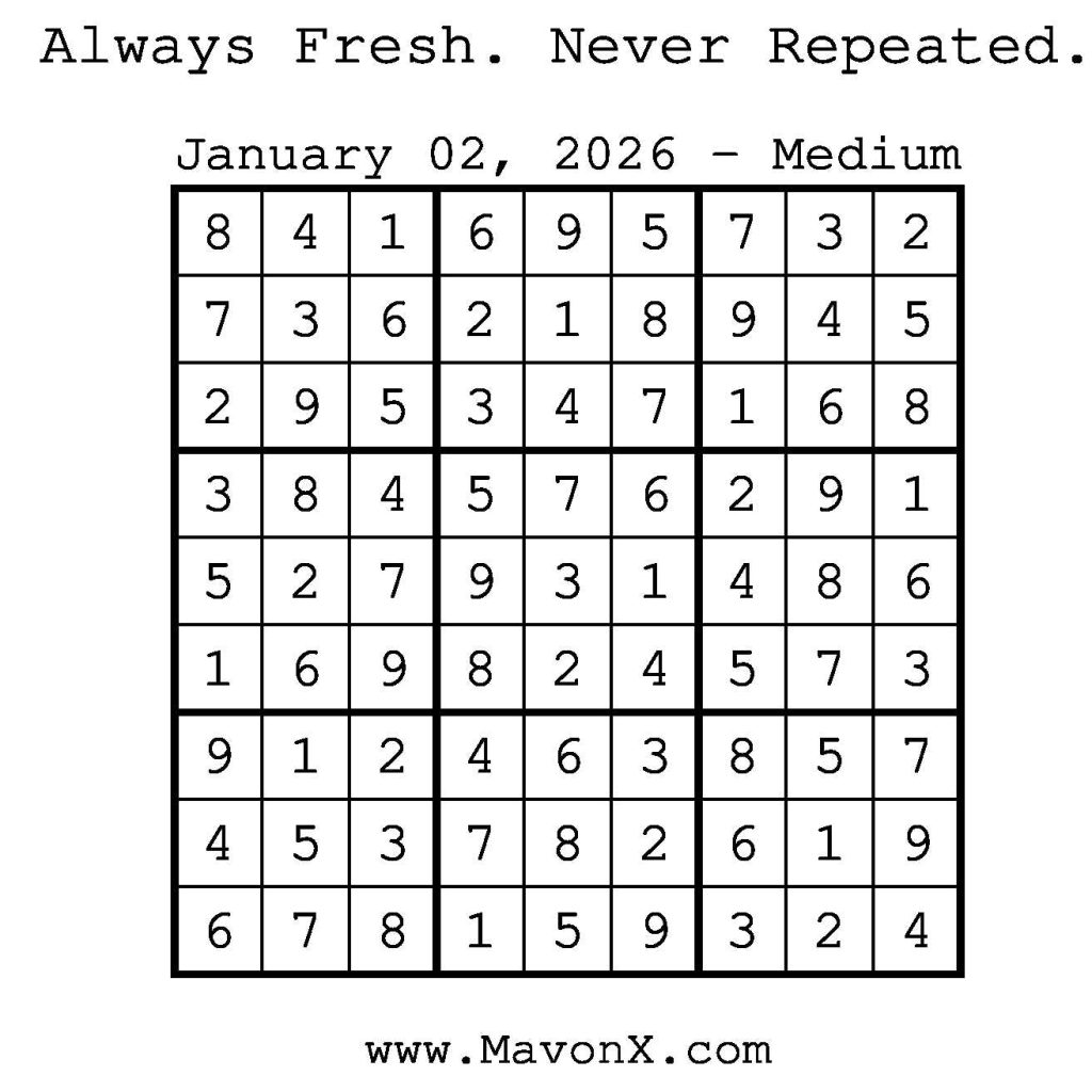 Puzzles of the Day – January 2, 2026 Post author:admin Post published:January 1, 2026 Post category:Free Stuff / Puzzle of the Day / Puzzle of the Day Solutions / Solutions Post comments:0 Comments Check out our books on Amazon! Check out our books on Barnes and Noble! Check out our books on Etsy! Easy Sudoku Coach Link Medium Sudoku Coach Link Hard Sudoku Coach Link Show Solution You Might Also Like Puzzles of the Day – October 25, 2025 October 24, 2025 Puzzles of the Day – October 21, 2024 October 21, 2024 Puzzles of the Day – January 21, 2025 January 21, 2025 Leave a Reply Cancel replyCommentEnter your name or username to comment Enter your email address to comment Enter your website URL (optional) Save my name, email, and website in this browser for the next time I comment.