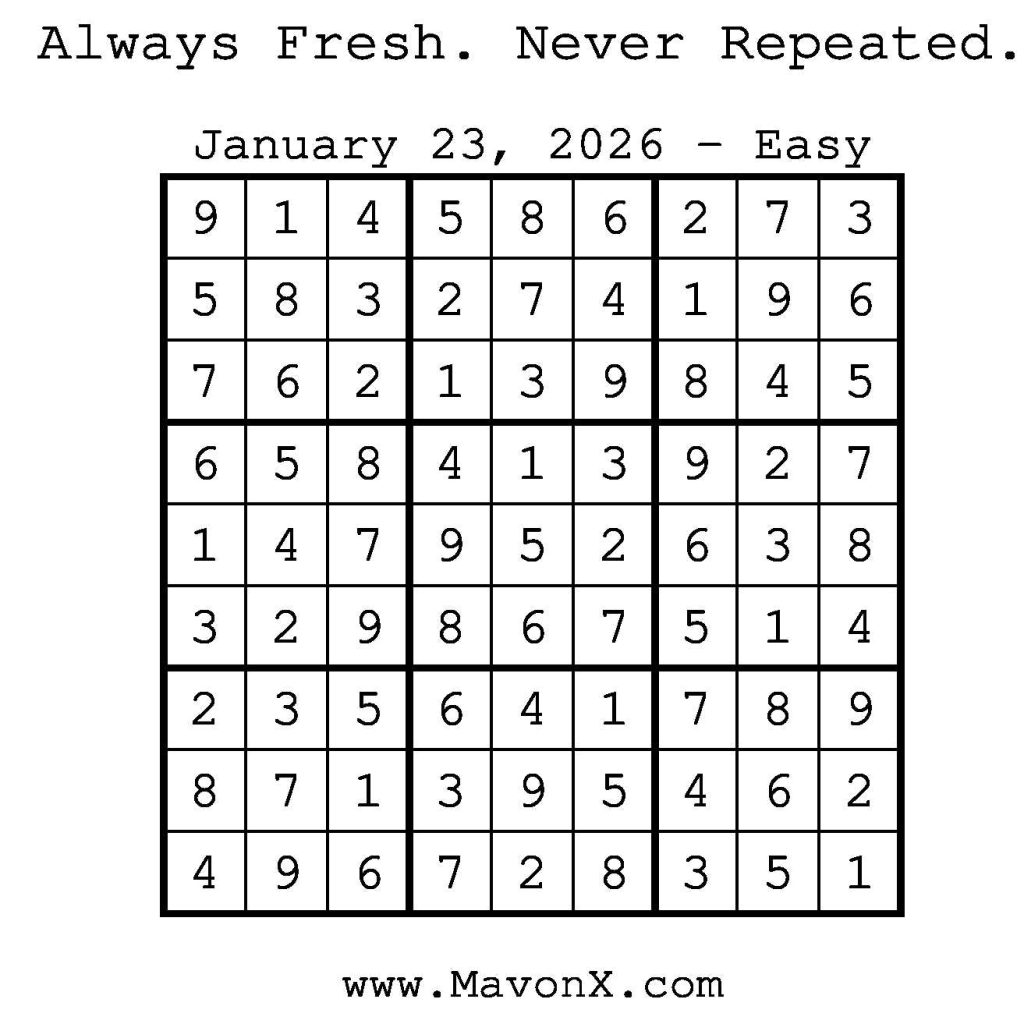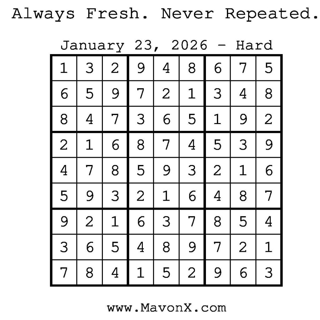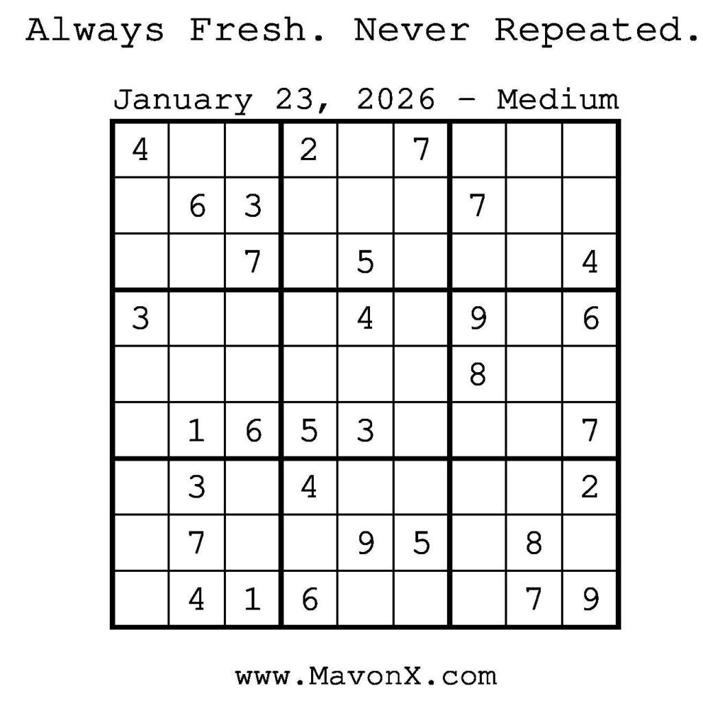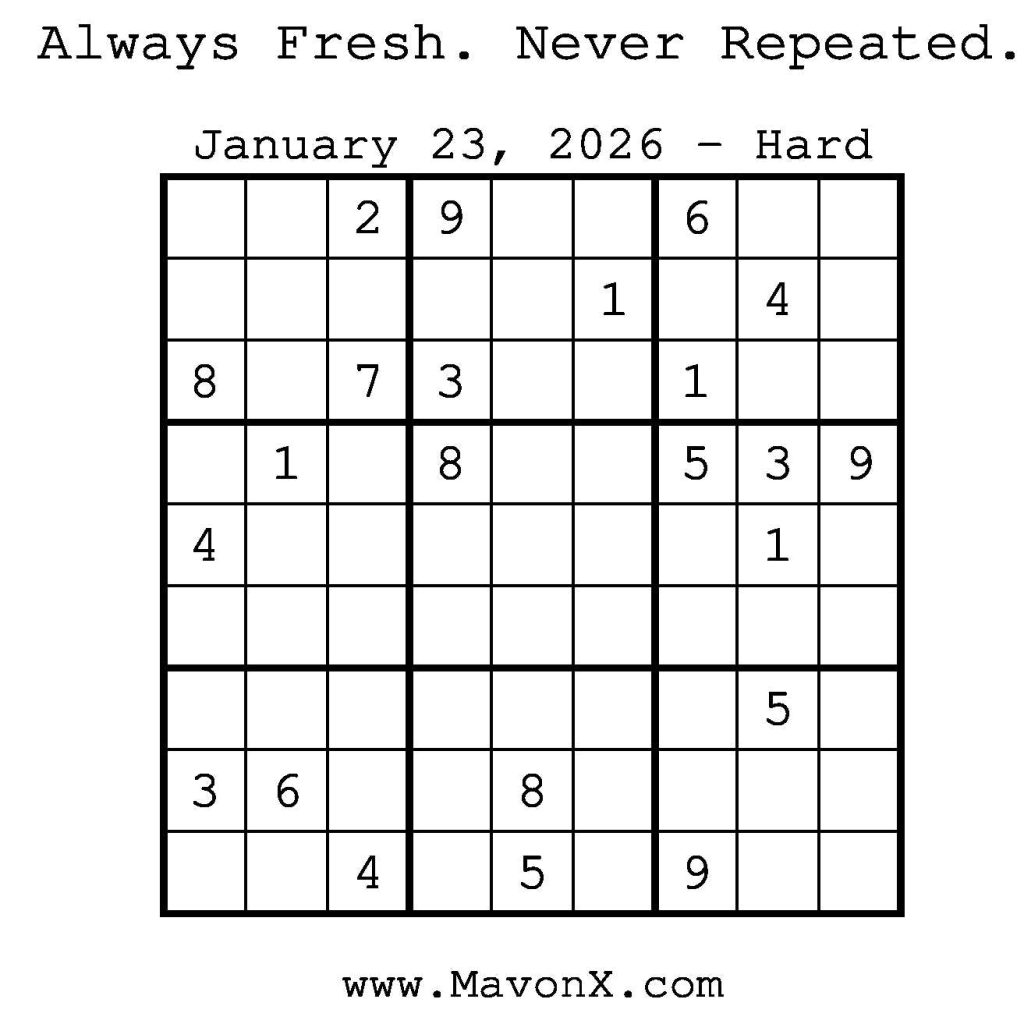 Puzzles of the Day – January 23, 2026 Post author:admin Post published:January 22, 2026 Post category:Free Stuff / Puzzle of the Day / Puzzle of the Day Solutions / Solutions Post comments:0 Comments Check out our books on Amazon! Check out our books on Barnes and Noble! Check out our books on Etsy! Easy Sudoku Coach Link Medium Sudoku Coach Link Hard Sudoku Coach Link Show Solution You Might Also Like Puzzles of the Day – December 28, 2025 December 27, 2025 Puzzles of the Day – December 6, 2024 December 5, 2024 Puzzles of the Day – April 11, 2025 April 11, 2025 Leave a Reply Cancel replyCommentEnter your name or username to comment Enter your email address to comment Enter your website URL (optional) Save my name, email, and website in this browser for the next time I comment.