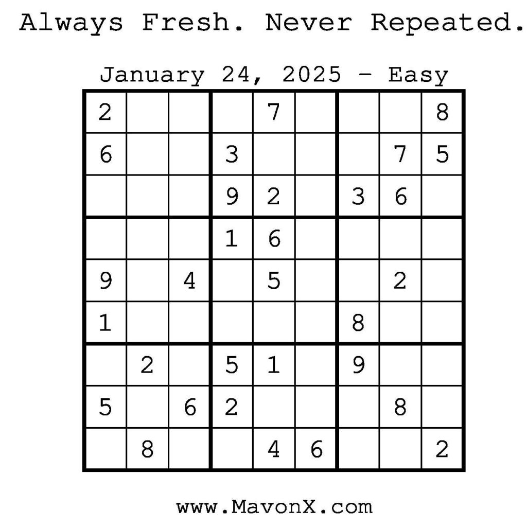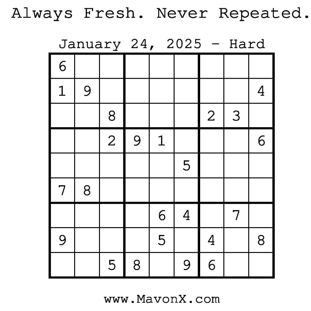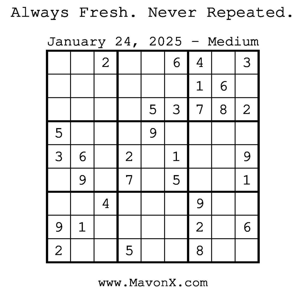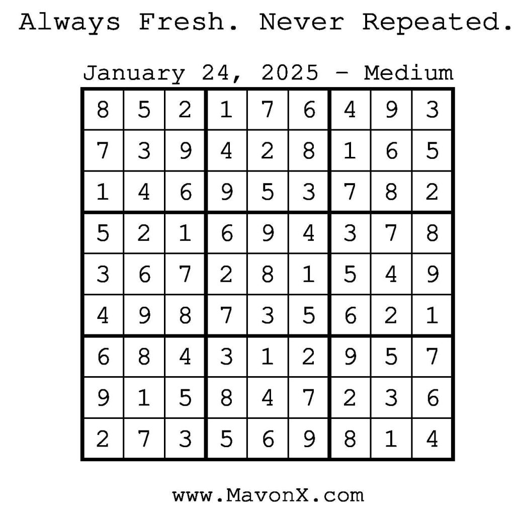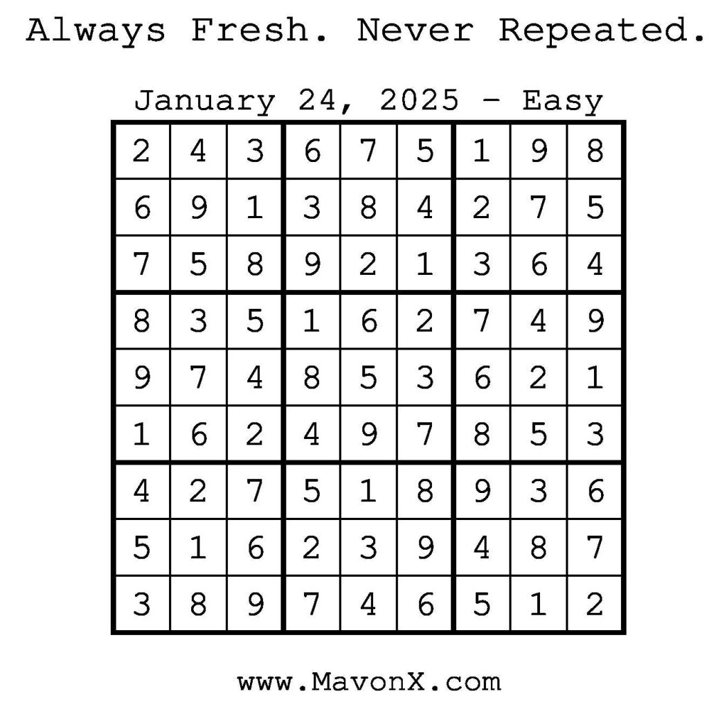 Puzzles of the Day – January 24, 2025 Post author:admin Post published:January 24, 2025 Post category:Free Stuff / Puzzle of the Day / Puzzle of the Day Solutions / Solutions Post comments:0 Comments Check out our books on Amazon! Check out our books on Barnes and Noble! Check out our books on Etsy! Easy Sudoku Coach Link Medium Sudoku Coach Link Hard Sudoku Coach Link Show Solution You Might Also Like Puzzles of the Day – February 27, 2025 February 26, 2025 Puzzles of the Day – April 7, 2025 April 7, 2025 Puzzles of the Day – December 20, 2024 December 19, 2024 Leave a Reply Cancel replyCommentEnter your name or username to comment Enter your email address to comment Enter your website URL (optional) Save my name, email, and website in this browser for the next time I comment.